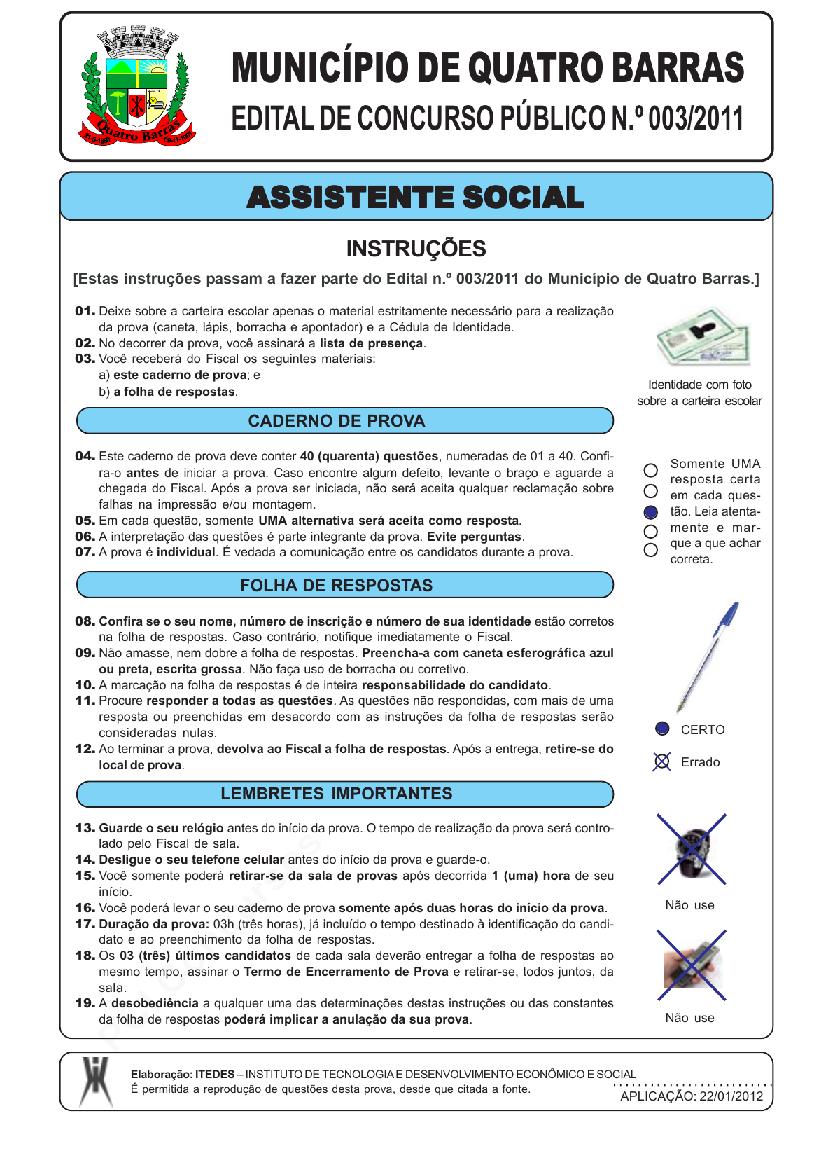 pcimarkpci MDAwMDowMDAwOjAwMDA6MDAwMDowMDAwOmZmZmY6MmRiNDo2YjZj:VHVlLCAyOCBKYW4gMjAyNSAwMjoxODo0MyAtMDMwMA== www.pciconcursos.com.br Elaboração: ITEDES – INSTITUTO DE TECNOLOGIA E DESENVOLVIMENTO ECONÔMICO E SOCIAL É permitida a reprodução de questões desta prova, desde que citada a fonte. APLICAÇÃO: 22/01/2012 01. Deixe sobre a carteira escolar apenas o material estritamente necessário para a realização da prova (caneta, lápis, borracha e apontador) e a Cédula de Identidade. 02. No decorrer da prova, você assinará a lista de presença. 03. Você receberá do Fiscal os seguintes materiais: a) este caderno de prova; e b) a folha de respostas. CADERNO DE PROVA 04. Este caderno de prova deve conter 40 (quarenta) questões, numeradas de 01 a 40. Confi- ra-o antes de iniciar a prova. Caso encontre algum defeito, levante o braço e aguarde a chegada do Fiscal. Após a prova ser iniciada, não será aceita qualquer reclamação sobre falhas na impressão e/ou montagem. 05. Em cada questão, somente UMA alternativa será aceita como resposta. 06. A interpretação das questões é parte integrante da prova. Evite perguntas. 07. A prova é individual. É vedada a comunicação entre os candidatos durante a prova. FOLHA DE RESPOSTAS 08. Confira se o seu nome, número de inscrição e número de sua identidade estão corretos na folha de respostas. Caso contrário, notifique imediatamente o Fiscal. 09. Não amasse, nem dobre a folha de respostas. Preencha-a com caneta esferográfica azul ou preta, escrita grossa. Não faça uso de borracha ou corretivo. 10. A marcação na folha de respostas é de inteira responsabilidade do candidato. 11. Procure responder a todas as questões. As questões não respondidas, com mais de uma resposta ou preenchidas em desacordo com as instruções da folha de respostas serão consideradas nulas. 12. Ao terminar a prova, devolva ao Fiscal a folha de respostas. Após a entrega, retire-se do local de prova. LEMBRETES IMPORTANTES 13. Guarde o seu relógio antes do início da prova. O tempo de realização da prova será contro- lado pelo Fiscal de sala. 14. Desligue o seu telefone celular antes do início da prova e guarde-o. 15. Você somente poderá retirar-se da sala de provas após decorrida 1 (uma) hora de seu início. 16. Você poderá levar o seu caderno de prova somente após duas horas do início da prova. 17. Duração da prova: 03h (três horas), já incluído o tempo destinado à identificação do candi- dato e ao preenchimento da folha de respostas. 18. Os 03 (três) últimos candidatos de cada sala deverão entregar a folha de respostas ao mesmo tempo, assinar o Termo de Encerramento de Prova e retirar-se, todos juntos, da sala. 19. A desobediência a qualquer uma das determinações destas instruções ou das constantes da folha de respostas poderá implicar a anulação da sua prova. INSTRUÇÕES [Estas instruções passam a fazer parte do Edital n.º 003/2011 do Município de Quatro Barras.] CERTO Errado Somente UMA resposta certa em cada ques- tão. Leia atenta- mente e mar- que a que achar correta. Não use Não use Identidade com foto sobre a carteira escolar ASSISTENTE SOCIALASSISTENTE SOCIALASSISTENTE SOCIALASSISTENTE SOCIALASSISTENTE SOCIAL MUNICÍPIO DE QUATRO BARRAS EDITAL DE CONCURSO PÚBLICO N.º 003/2011 pcimarkpci MDAwMDowMDAwOjAwMDA6MDAwMDowMDAwOmZmZmY6MmRiNDo2YjZj:VHVlLCAyOCBKYW4gMjAyNSAwMjoxODo0MyAtMDMwMA== www.pciconcursos.com.br Elaboração: ITEDES – INSTITUTO DE TECNOLOGIA E DESENVOLVIMENTO ECONÔMICO E SOCIAL É permitida a reprodução de questões desta prova, desde que citada a fonte. APLICAÇÃO: 22/01/2012 pcimarkpci MDAwMDowMDAwOjAwMDA6MDAwMDowMDAwOmZmZmY6MmRiNDo2YjZj:VHVlLCAyOCBKYW4gMjAyNSAwMjoxODo0MyAtMDMwMA== www.pciconcursos.com.br Elaboração: ITEDES – INSTITUTO DE TECNOLOGIA E DESENVOLVIMENTO ECONÔMICO E SOCIAL É permitida a reprodução de questões desta prova, desde que citada a fonte. APLICAÇÃO: 22/01/2012 CONCURSO PÚBLICO – PREFEITURA MUNICIPAL DE QUATRO BARRAS LÍNGUA PORTUGUESA 01.01.01.01.01. Leia com atenção a charge a seguir: Folha de S. Paulo, 02/09/2011, página 02. Em relação à tirinha em questão e a seus conheci- mentos, NÃO podemos afirmar que: a) os vocábulos “saúde” e “tim-tim” possuem sentidos diferentes nos dois quadrinhos. b) a palavra “saúde” classifica-se como substantivo nos dois casos em que é utilizada. c) temos uma crítica ao modo como são geridos os re- cursos públicos, muitas vezes sendo desviados para fins ilícitos. d) para transmitir suas ideias, o autor se vale da lingua- gem verbal e não verbal. e) a dissimulação demonstrada pelos personagens re- vela um total descaso para com o dinheiro público e ilustra, infelizmente, muitas situações comuns em nosso Brasil contemporâneo. 02.02.02.02.02. Assinale a alternativa que apresenta um ERRO de concordância verbal: a) Trata-se de denúncias graves envolvendo mais um ministro do governo Dilma. b) A possível instalação de uma estação do metrô na avenida Angélica e a reação por parte de moradores de Higienópolis gerou muita polêmica e manifesta- ções, que foram veiculadas na mídia impressa e virtual. c) Haverá propostas melhores para conservação da mata atlântica paranaense do que as que foram apresenta- das hoje? d) Eles estavam contentes, pois começaram o ano com carro e casa novos. e) Buscam-se as melhores soluções para o desenvol- vimento do município. MUNICÍPIO DE QUATRO BARRAS EDITAL DE CONCURSO PÚBLICO N.º 003/2011 03.03.03.03.03. Assinale a alternativa que apresenta palavras (analise as palavras em destaque) cuja grafia foi al- terada pelo Novo Acordo Ortográfico (Decreto n.º 6.583/2008): a) Eles vêm hoje da praia. – Ele não pára de se coçar em público. b) A terra é achatada nos pólos. – Vocês não têm educação. c) Ele não pôde ontem estar aqui. – Foi uma bela experiência. d) Os cientistas crêem no impossível. – Pode ficar tran