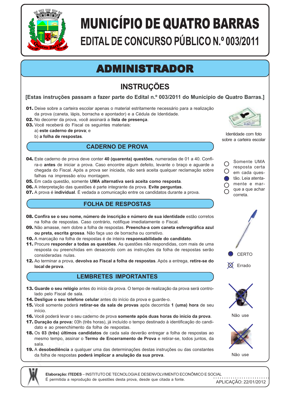 pcimarkpci MDAwMDowMDAwOjAwMDA6MDAwMDowMDAwOmZmZmY6MmRiNDo2YjZj:VHVlLCAyOCBKYW4gMjAyNSAwMjoxNzozMyAtMDMwMA== www.pciconcursos.com.br Elaboração: ITEDES – INSTITUTO DE TECNOLOGIA E DESENVOLVIMENTO ECONÔMICO E SOCIAL É permitida a reprodução de questões desta prova, desde que citada a fonte. APLICAÇÃO: 22/01/2012 01. Deixe sobre a carteira escolar apenas o material estritamente necessário para a realização da prova (caneta, lápis, borracha e apontador) e a Cédula de Identidade. 02. No decorrer da prova, você assinará a lista de presença. 03. Você receberá do Fiscal os seguintes materiais: a) este caderno de prova; e b) a folha de respostas. CADERNO DE PROVA 04. Este caderno de prova deve conter 40 (quarenta) questões, numeradas de 01 a 40. Confi- ra-o antes de iniciar a prova. Caso encontre algum defeito, levante o braço e aguarde a chegada do Fiscal. Após a prova ser iniciada, não será aceita qualquer reclamação sobre falhas na impressão e/ou montagem. 05. Em cada questão, somente UMA alternativa será aceita como resposta. 06. A interpretação das questões é parte integrante da prova. Evite perguntas. 07. A prova é individual. É vedada a comunicação entre os candidatos durante a prova. FOLHA DE RESPOSTAS 08. Confira se o seu nome, número de inscrição e número de sua identidade estão corretos na folha de respostas. Caso contrário, notifique imediatamente o Fiscal. 09. Não amasse, nem dobre a folha de respostas. Preencha-a com caneta esferográfica azul ou preta, escrita grossa. Não faça uso de borracha ou corretivo. 10. A marcação na folha de respostas é de inteira responsabilidade do candidato. 11. Procure responder a todas as questões. As questões não respondidas, com mais de uma resposta ou preenchidas em desacordo com as instruções da folha de respostas serão consideradas nulas. 12. Ao terminar a prova, devolva ao Fiscal a folha de respostas. Após a entrega, retire-se do local de prova. LEMBRETES IMPORTANTES 13. Guarde o seu relógio antes do início da prova. O tempo de realização da prova será contro- lado pelo Fiscal de sala. 14. Desligue o seu telefone celular antes do início da prova e guarde-o. 15. Você somente poderá retirar-se da sala de provas após decorrida 1 (uma) hora de seu início. 16. Você poderá levar o seu caderno de prova somente após duas horas do início da prova. 17. Duração da prova: 03h (três horas), já incluído o tempo destinado à identificação do candi- dato e ao preenchimento da folha de respostas. 18. Os 03 (três) últimos candidatos de cada sala deverão entregar a folha de respostas ao mesmo tempo, assinar o Termo de Encerramento de Prova e retirar-se, todos juntos, da sala. 19. A desobediência a qualquer uma das determinações destas instruções ou das constantes da folha de respostas poderá implicar a anulação da sua prova. INSTRUÇÕES [Estas instruções passam a fazer parte do Edital n.º 003/2011 do Município de Quatro Barras.] CERTO Errado Somente UMA resposta certa em cada ques- tão. Leia atenta- mente e mar- que a que achar correta. Não use Não use Identidade com foto sobre a carteira escolar ADMINISTRADORADMINISTRADORADMINISTRADORADMINISTRADORADMINISTRADOR MUNICÍPIO DE QUATRO BARRAS EDITAL DE CONCURSO PÚBLICO N.º 003/2011 pcimarkpci MDAwMDowMDAwOjAwMDA6MDAwMDowMDAwOmZmZmY6MmRiNDo2YjZj:VHVlLCAyOCBKYW4gMjAyNSAwMjoxNzozMyAtMDMwMA== www.pciconcursos.com.br Elaboração: ITEDES – INSTITUTO DE TECNOLOGIA E DESENVOLVIMENTO ECONÔMICO E SOCIAL É permitida a reprodução de questões desta prova, desde que citada a fonte. APLICAÇÃO: 22/01/2012 pcimarkpci MDAwMDowMDAwOjAwMDA6MDAwMDowMDAwOmZmZmY6MmRiNDo2YjZj:VHVlLCAyOCBKYW4gMjAyNSAwMjoxNzozNCAtMDMwMA== www.pciconcursos.com.br Elaboração: ITEDES – INSTITUTO DE TECNOLOGIA E DESENVOLVIMENTO ECONÔMICO E SOCIAL É permitida a reprodução de questões desta prova, desde que citada a fonte. APLICAÇÃO: 22/01/2012 CONCURSO PÚBLICO – PREFEITURA MUNICIPAL DE QUATRO BARRAS LÍNGUA PORTUGUESA 01.01.01.01.01. Leia com atenção a charge a seguir: Folha de S. Paulo, 02/09/2011, página 02. Em relação à tirinha em questão e a seus conheci- mentos, NÃO podemos afirmar que: a) os vocábulos “saúde” e “tim-tim” possuem sentidos diferentes nos dois quadrinhos. b) a palavra “saúde” classifica-se como substantivo nos dois casos em que é utilizada. c) temos uma crítica ao modo como são geridos os re- cursos públicos, muitas vezes sendo desviados para fins ilícitos. d) para transmitir suas ideias, o autor se vale da lingua- gem verbal e não verbal. e) a dissimulação demonstrada pelos personagens re- vela um total descaso para com o dinheiro público e ilustra, infelizmente, muitas situações comuns em nosso Brasil contemporâneo. 02.02.02.02.02. Assinale a alternativa que apresenta um ERRO de concordância verbal: a) Trata-se de denúncias graves envolvendo mais um ministro do governo Dilma. b) A possível instalação de uma estação do metrô na avenida Angélica e a reação por parte de moradores de Higienópolis gerou muita polêmica e manifesta- ções, que foram veiculadas na mídia impressa e virtual. c) Haverá propostas melhores para conservação da mata atlântica paranaense do que as que foram apresenta- das hoje? d) Eles estavam contentes, pois começaram o ano com carro e casa novos. e) Buscam-se as melhores soluções para o desenvol- vimento do município. MUNICÍPIO DE QUATRO BARRAS EDITAL DE CONCURSO PÚBLICO N.º 003/2011 03.03.03.03.03. Assinale a alternativa que apresenta palavras (analise as palavras em destaque) cuja grafia foi al- terada pelo Novo Acordo Ortográfico (Decreto n.º 6.583/2008): a) Eles vêm hoje da praia. – Ele não pára de se coçar em público. b) A terra é achatada nos pólos. – Vocês não têm educação. c) Ele não pôde ontem estar aqui. – Foi uma bela experiência. d) Os cientistas crêem no impossível. – Pode ficar tranqüilo! e) Eles lêe