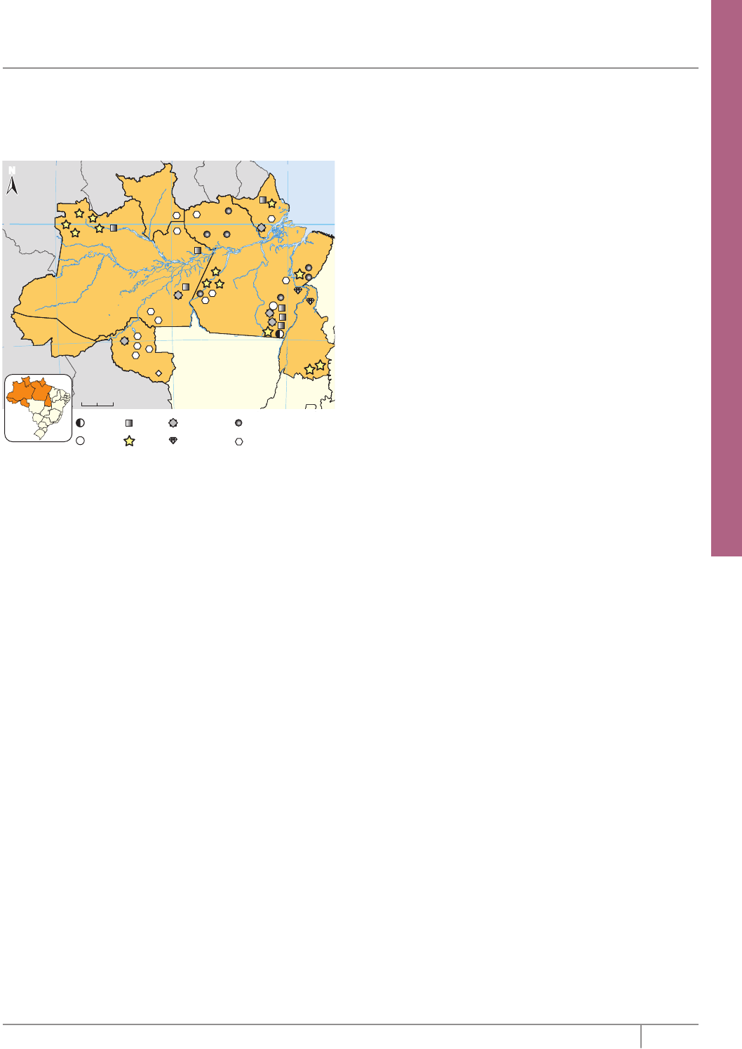 G EO G R A FI A 7Editora Bernoulli Extrativismo mineral Recursos minerais 0 300 km OCEANO ATLÂNTICO N -70° -60° -50° -10° 0° Equador DF GO MT PARÁAMAZONAS RORAIMA AMAPÁ MA TOCANTINS ACRE RONDÔNIA GUIANA FRANCESA SURINAME GUIANA VENEZUELA COLÔMBIA PERU BOLÍVIA Ferro Manganês Alumínio (Bauxita) Ouro Estanho (Cassiterita)Diamante Níquel Cobre Fonte: IBGE. Atlas Nacional do Brasil, 2000 (Adaptação). A região Norte é rica em recursos minerais, sendo as duas principais áreas produtoras a Serra dos Carajás – onde a Vale possui os direitos de exploração – e a Serra do Navio, no estado do Amapá. A extração mineral começou a se destacar na região Norte no fim da década de 1950, intensificando-se a partir da década de 1970. A exploração do manganês teve início em 1957, quando foi instalada na Serra do Navio uma empresa mineradora multinacional e, com o objetivo de facilitar o transporte e a exportação do produto, foram construídos, perto de Macapá, uma ferrovia e o porto de Santana. Quase todo o minério produzido no local é exportado, principalmente, para a América do Norte e para a Europa. Porém, na atualidade, suas reservas estão praticamente esgotadas. No fim da década de 1960, na Serra dos Carajás – no sudeste do Pará –, foi descoberta uma importante jazida de ferro e, mais tarde, outras grandes reservas – de cobre, manganês, bauxita, níquel, estanho e ouro – foram identificadas nessa mesma região. Para viabilizar a exploração mineral na província mineralógica de Carajás, em 1979 foi lançado o Projeto Grande Carajás, que visava ao desenvolvimento de infraestruturas que facilitassem a exploração e a exportação dos minérios da região. Esse projeto foi responsável pela delimitação da área e pelo desenvolvimento de obras infraestruturais, incluindo a Usina Hidrelétrica de Tucuruí, a estrada de ferro Carajás e o porto de Ponta da Madeira, localizado no porto do Itaqui, na capital do estado do Maranhão, São Luís. Além dessas medidas, o Projeto Grande Carajás (PGC) buscou fomentar também o desenvolvimento de projetos agropecuários de extração florestal, que visavam a promover o desenvolvimento da região. A bauxita, ou minério de alumínio, é outro importante recurso mineral encontrado na região. A energia necessária para beneficiar esse minério, para que ele possa ser convertido em alumínio, é oriunda da Usina Hidrelétrica de Tucuruí. O município de Oriximiná, no estado do Pará, é o maior produtor brasileiro de bauxita e conta com enormes reservas às margens do Rio Trombetas. O ouro e o diamante de diversas áreas da Amazônia são explorados pelo garimpo. Essa atividade atrai muitos migrantes e costuma provocar grandes danos ao ambiente, como o desmatamento e a contaminação pela ação do mercúrio – utilizado pelos garimpeiros para separar o ouro do cascalho retirado do fundo dos rios. Além de contaminar os rios, essa atividade também prejudica a qualidade do ar – quando o amálgama (mistura do mercúrio com o ouro) é aquecido para separar os dois metais, o primeiro sublima e contamina a atmosfera –, os mananciais, os peixes, os animais silvestres e, ainda, as comunidades locais que se alimentam desses animais. As péssimas condições de trabalho a que muitos garimpeiros são submetidos, somadas à deficiência de sistemas de saúde locais, muitas vezes resultam em uma sobrevivência precária das populações. No final do ano de 2006, foi descoberta, no sul do Amazonas, uma grande reserva de ouro, o Garimpo do Juma, localizado às margens do rio de mesmo nome, que é um dos afluentes do Rio Madeira. De acordo com estudos realizados (2008) pelo Departamento Nacional de Produção Mineral (DNPM), esse garimpo contém a maior reserva de ouro já identificada na Amazônia nos últimos 100 anos. Essa descoberta motivou migrações em direção à área e tem preocupado as autoridades das localidades próximas, em função do temor de surtos de malária e febre amarela (devido aos desmatamentos), bem como do aumento da prostituição, do alcoolismo, entre outros. Extrativismo vegetal A extração vegetal, além de ser uma atividade antiga, foi, durante muitos anos, a principal atividade econômica da região, empregando, ainda hoje, uma numerosa mão de obra. A atividade extrativista na região Norte aparece nos registros históricos desde o século XVIII, a partir da busca pelas chamadas “drogas do sertão”, mas foi somente na segunda metade do século XIX que se observou um maior desenvolvimento, com o início do “ciclo da borracha”. Até aproximadamente 1920, a demanda crescente pela borracha nos países mais desenvolvidos exigia o aumento de sua extração na Amazônia, o que se verificou novamente na época da Segunda Guerra Mundial. Apesar de ainda ocorrer em diversas áreas, principalmente nos estados do Amazonas, Acre e Rondônia, o extrativismo da borracha já não contribui para a economia regional como no passado, visto que a expansão das atividades agropecuárias foi responsável, ao longo de todo o século XX, pela redução das áreas de seringais e, consequentemente, da produção do látex. Hoje, essa atividade se concentra em reservas extrativistas. Atualmente, a atividade madeireira se sobressai, isoladamente, na economia extrativa regional, fornecendo cerca de 85% da madeira consumida no país. Mesmo assim, ainda existe uma exploração de produtos florestais não madeireiros de grande importância para as populações que habitam os estados da região Norte, destacando-se, além da borracha, a castanha e o palmito-açaí. Regionalismo brasileiro: Norte 8 Coleção Estudo Indústria A região Norte corresponde à porção menos industrializada do país. Até os anos 1960, essa região estava atrelada a atividades que envolviam pouca tecnologia e, sobretudo, ligadas ao beneficiamento dos produtos extrativos vegetais (borracha, castanha-do-pará, madeira) e aos ram