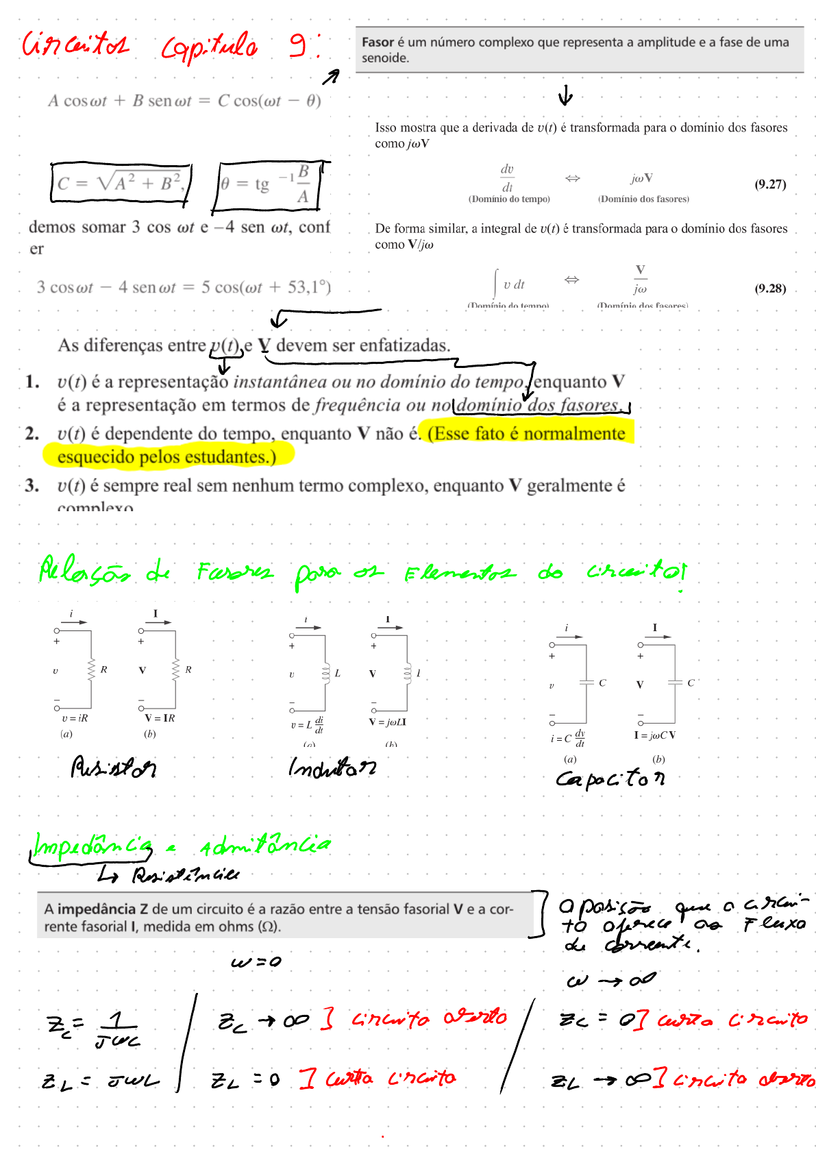 Fasor é um número complexo que representa a amplitude e a fase de uma senoide. A coswt + = Isso mostra que a derivada de v(t) é transformada para o domínio dos fasores como jwV dv = tg jwV dt (9.27) A (Domínio do tempo) (Domínio dos fasores) demos somar 3 cos wt e-4 sen wt, conf De forma similar, a integral de v(t) é transformada para o domínio dos fasores er como V/jw V 3 coswt - 4 sen wt = 5 cos(wt + v dt jw (9.28) (Domínio do tempo) dos fasores) As diferenças entre devem ser enfatizadas. 1. (t) é a representação instantânea ou no domínio do tempo enquanto V é a representação em termos de frequência ou dos fasores, 2. v(t) é dependente do tempo, enquanto V não é. (Esse fato é normalmente esquecido pelos estudantes.) 3. v(t) é sempre real sem nenhum termo complexo, enquanto V geralmente é de or do I I + + + + + + U R V R L V C V C V=IR (a) (b) (h) I=jwCV (a) Resistor (a) (b) e A impedância Z de um circuito é a razão entre a tensão fasorial V e a cor- ] rente fasorial I, medida em ohms to as Fluxo 1 = JWC ZL = JWL ZL = ZLZ = / R = Im (z) / de A admitância Y é o inverso da impedância, medida em siemens (S). 1 - I Tabela 9.3 Impedância e admitância de elementos passivos. Elemento Impedância Admitância de R R X B= L Z jwL R2 + X2' R2 + X2 1 C Z = Y jwC mermo de LC pelo (11.1)A potência média na Equação (11.8) pode ser escrita em termos de valores RMS. 1 P = = 2 (11.30) = - a Fator de Acrescentamos um novo termo à equação: de = VRMSIRMS (11.35) ângulo é denominado ângulo do fator de potência, uma vez que A potência média é o produto de dois termos. o produto é conhecido ele é o ângulo cujo cosseno é o fator de potência. ângulo do fator de potên- como a potência aparente S. fator cos(A é chamado fator de potência (FP). cia é igual ao ângulo da impedância da carga se V for a tensão na carga e I a corrente através dela. Isso fica evidente a partir do fato que Potência aparente (em VA) é o produto dos valores RMS da tensão e da Fator de potência é o cosseno da diferença de fase entre tensão e corrente. corrente. Ele também é o cosseno do ângulo da impedância da carga. Entre esses dois casos extremos, diz-se que o FP está adiantado ou atrasado. Um fator de potência adiantado significa que a corrente está adiantada em relação à I FP - tensão, implicando uma carga capacitiva. Um fator de potência atrasado significa que a corrente está atrasada em relação à tensão, implicando uma carga indutiva. fator de potência afeta as contas pagas pelos consumidores de energia elétrica I V Fp - às como veremos na Seção 11.9.2. 2 1 / Re(s) = R S= S = Q= = = (VAR) 1. Q = 0 para cargas resistivas (FP unitário). Potência complexa (em VA) é o produto do fasor de tensão RMS e o conju- 2. Qdo Fatar Qc Q1 = S1 = Q2 = me Para CFP - S2 ( Qc - Q2 RMS RMS Para rejo I de 0 i e am a RMS VRMS V2 RMS QL = (11.61) wL QL onde é a diferença entre a potência reativa atual e a anterior. FP I a o uso-M or Qc - = RMS RMS