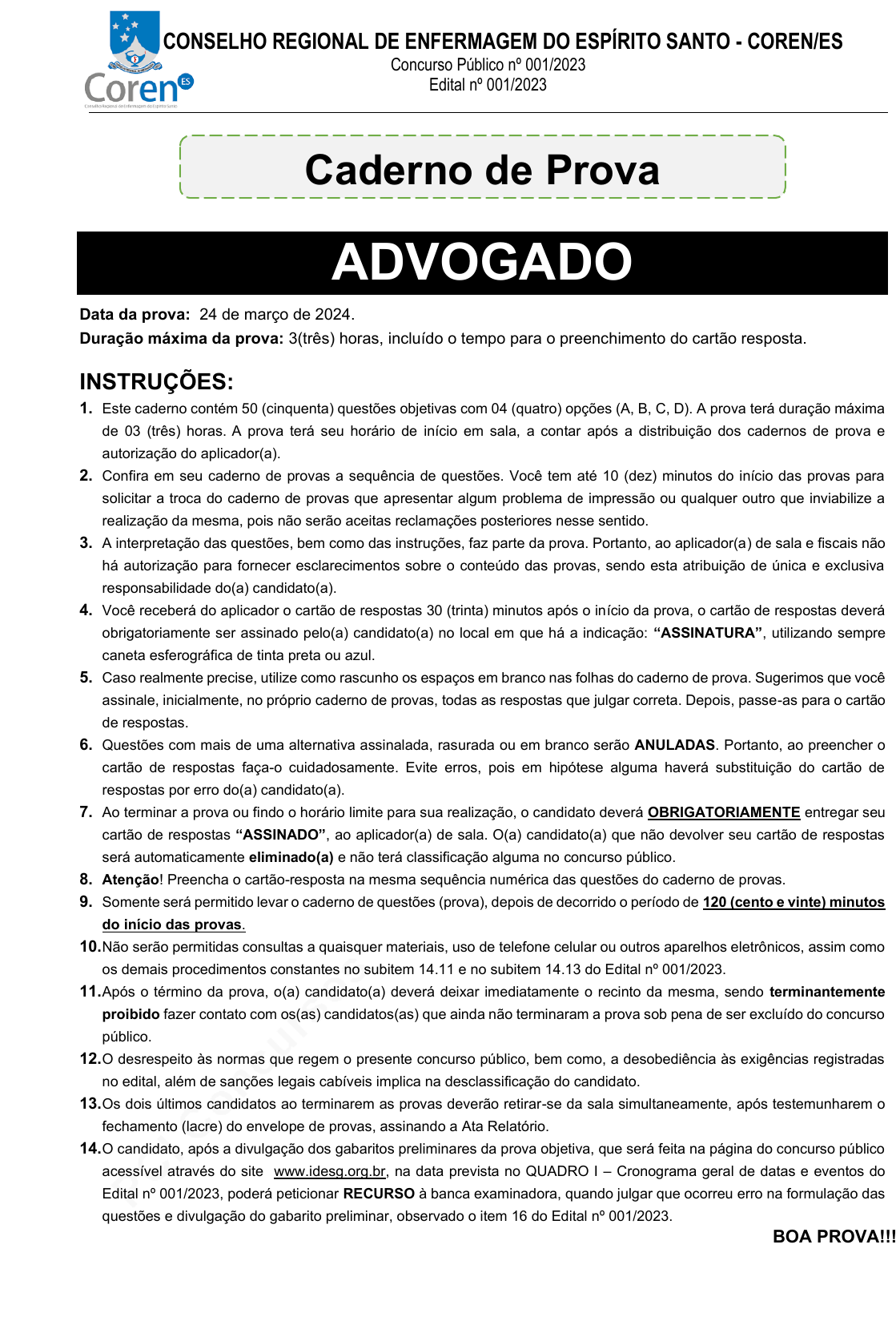 pcimarkpci MjgwNDowMTRjOjAwYTE6YmQ1NjowZDkwOjg5NWE6ZTJjMTpiY2U0:VHVlLCAyOCBKYW4gMjAyNSAxMjowODo0MyAtMDMwMA== www.pciconcursos.com.br CONSELHO REGIONAL DE ENFERMAGEM DO ESPÍRITO SANTO - COREN/ES Concurso Público nº 001/2023 Edital nº 001/2023 Caderno de Prova ADVOGADO Data da prova: 24 de março de 2024. Duração máxima da prova: 3(três) horas, incluído o tempo para o preenchimento do cartão resposta. INSTRUÇÕES: 1. Este caderno contém 50 (cinquenta) questões objetivas com 04 (quatro) opções (A, B, C, D). A prova terá duração máxima de 03 (três) horas. A prova terá seu horário de início em sala, a contar após a distribuição dos cadernos de prova e autorização do aplicador(a). 2. Confira em seu caderno de provas a sequência de questões. Você tem até 10 (dez) minutos do início das provas para solicitar a troca do caderno de provas que apresentar algum problema de impressão ou qualquer outro que inviabilize a realização da mesma, pois não serão aceitas reclamações posteriores nesse sentido. 3. A interpretação das questões, bem como das instruções, faz parte da prova. Portanto, ao aplicador(a) de sala e fiscais não há autorização para fornecer esclarecimentos sobre o conteúdo das provas, sendo esta atribuição de única e exclusiva responsabilidade do(a) candidato(a). 4. Você receberá do aplicador o cartão de respostas 30 (trinta) minutos após o início da prova, o cartão de respostas deverá obrigatoriamente ser assinado pelo(a) candidato(a) no local em que há a indicação: “ASSINATURA”, utilizando sempre caneta esferográfica de tinta preta ou azul. 5. Caso realmente precise, utilize como rascunho os espaços em branco nas folhas do caderno de prova. Sugerimos que você assinale, inicialmente, no próprio caderno de provas, todas as respostas que julgar correta. Depois, passe-as para o cartão de respostas. 6. Questões com mais de uma alternativa assinalada, rasurada ou em branco serão ANULADAS. Portanto, ao preencher o cartão de respostas faça-o cuidadosamente. Evite erros, pois em hipótese alguma haverá substituição do cartão de respostas por erro do(a) candidato(a). 7. Ao terminar a prova ou findo o horário limite para sua realização, o candidato deverá OBRIGATORIAMENTE entregar seu cartão de respostas “ASSINADO”, ao aplicador(a) de sala. O(a) candidato(a) que não devolver seu cartão de respostas será automaticamente eliminado(a) e não terá classificação alguma no concurso público. 8. Atenção! Preencha o cartão-resposta na mesma sequência numérica das questões do caderno de provas. 9. Somente será permitido levar o caderno de questões (prova), depois de decorrido o período de 120 (cento e vinte) minutos do início das provas. 10. Não serão permitidas consultas a quaisquer materiais, uso de telefone celular ou outros aparelhos eletrônicos, assim como os demais procedimentos constantes no subitem 14.11 e no subitem 14.13 do Edital nº 001/2023. 11. Após o término da prova, o(a) candidato(a) deverá deixar imediatamente o recinto da mesma, sendo terminantemente proibido fazer contato com os(as) candidatos(as) que ainda não terminaram a prova sob pena de ser excluído do concurso público. 12. O desrespeito às normas que regem o presente concurso público, bem como, a desobediência às exigências registradas no edital, além de sanções legais cabíveis implica na desclassificação do candidato. 13. Os dois últimos candidatos ao terminarem as provas deverão retirar-se da sala simultaneamente, após testemunharem o fechamento (lacre) do envelope de provas, assinando a Ata Relatório. 14. O candidato, após a divulgação dos gabaritos preliminares da prova objetiva, que será feita na página do concurso público acessível através do site www.idesg.org.br, na data prevista no QUADRO I – Cronograma geral de datas e eventos do Edital nº 001/2023, poderá peticionar RECURSO à banca examinadora, quando julgar que ocorreu erro na formulação das questões e divulgação do gabarito preliminar, observado o item 16 do Edital nº 001/2023. BOA PROVA!!! pcimarkpci MjgwNDowMTRjOjAwYTE6YmQ1NjowZDkwOjg5NWE6ZTJjMTpiY2U0:VHVlLCAyOCBKYW4gMjAyNSAxMjowODo0MyAtMDMwMA== www.pciconcursos.com.br CONSELHO REGIONAL DE ENFERMAGEM DO ESPÍRITO SANTO - COREN/ES Concurso Público nº 001/2023 Edital nº 001/2023 Página 2 de 19 ATENÇÃO!!! ➢ O CARTÃO DE RESPOSTAS ABAIXO É PARA SER UTILIZADO SOMENTE COMO RASCUNHO. ➢ AO RECEBER O CARTÃO DE RESPOSTAS DEFINITIVO CONFIRA OS DADOS DE IDENTIFICAÇÃO (NOME, CARGO, NÚMERO DE INSCRIÇÃO) E EM SEGUIDA ASSINE NO LOCAL INDICADO. ATENÇÃO: • O(a) candidato(a) deverá OBRIGATORIAMENTE, entregar seu cartão de repostas definitivo preenchido e ASSINADO, sob pena de ter seu cartão de respostas ANULADO. (item 14.22 do edital nº 001/2023). • Preencha o cartão-resposta na mesma sequência numérica das questões do caderno de provas. pcimarkpci MjgwNDowMTRjOjAwYTE6YmQ1NjowZDkwOjg5NWE6ZTJjMTpiY2U0:VHVlLCAyOCBKYW4gMjAyNSAxMjowODo0MyAtMDMwMA== www.pciconcursos.com.br CONSELHO REGIONAL DE ENFERMAGEM DO ESPÍRITO SANTO - COREN/ES Concurso Público nº 001/2023 Edital nº 001/2023 Página 3 de 19 LÍNGUA PORTUGUESA Atenção: Leia atentamente o texto a seguir e responda as questões de 01 a 10: Imunoterapia e tratamento direcionado têm resultados promissores contra câncer colorretal Combinação de estratégias mostraram desfechos positivos para pacientes com câncer de intestino, segundo estudo publicado na Nature Medicine. Pacientes com câncer colorretal, também chamado de câncer de intestino ou de câncer de cólon e reto, que receberam tratamento combinado de imunoterapia e terapia direcionada apresentaram melhores respostas no combate ao tumor. O estudo, liderado por pesquisadores do Mass General Cancer Center, nos Estados Unidos, incluiu 37 pacientes com mutações encontradas em cerca de 10% desses tipos de câncer, chamada BRAF V600. Em um artigo pu