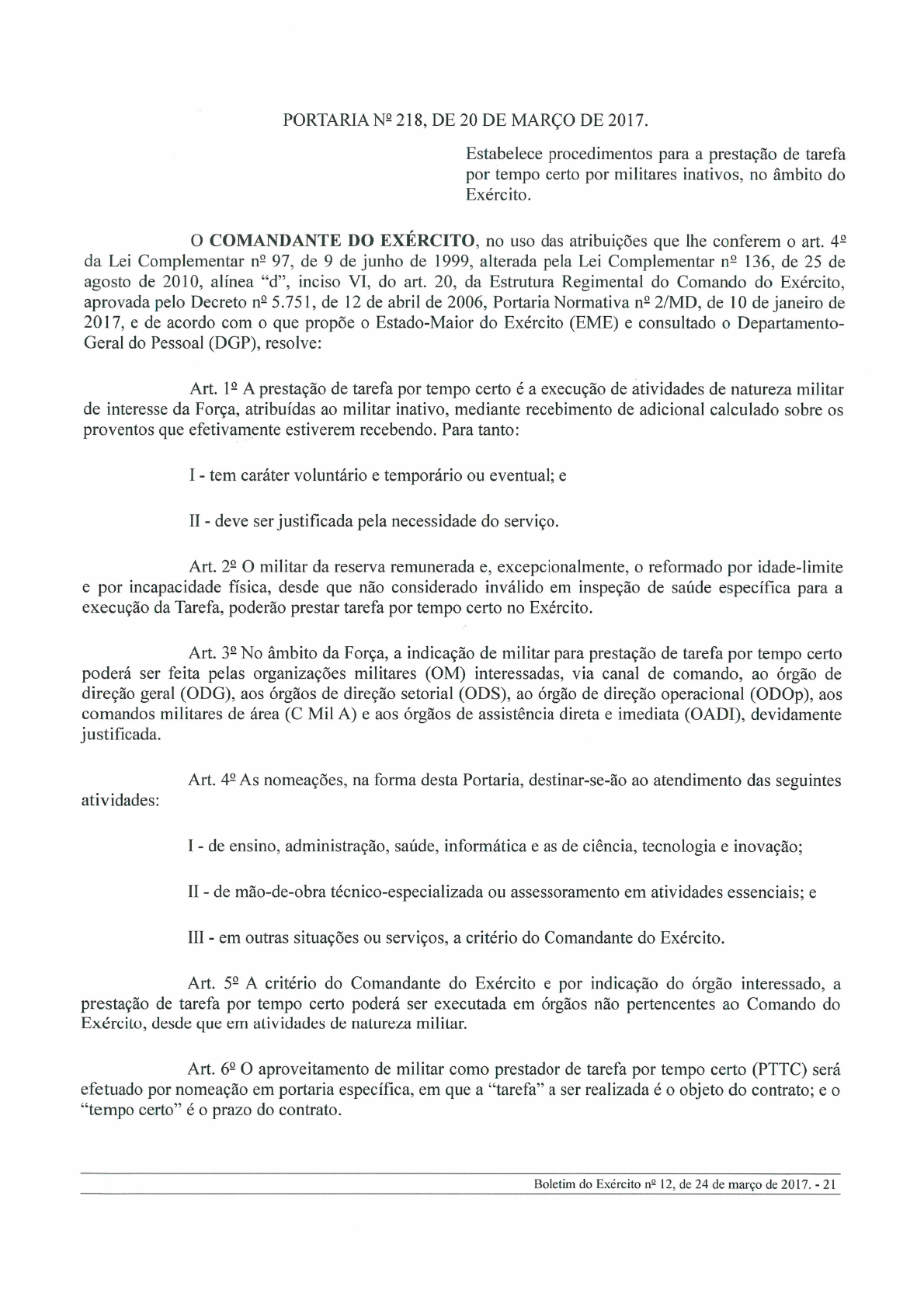 PORTARIA 218, DE 20 DE MARÇO DE 2017. Estabelece procedimentos para a prestação de tarefa por tempo certo por militares inativos, no âmbito do Exército. O COMANDANTE DO EXÉRCITO, no uso das atribuições que lhe conferem o art. da Lei Complementar 97, de 9 de junho de 1999, alterada pela Lei Complementar 136, de 25 de agosto de 2010, alínea "d", inciso VI, do art. 20, da Estrutura Regimental do Comando do Exército, aprovada pelo Decreto 5.751, de 12 de abril de 2006, Portaria Normativa n° 2/MD, de 10 de janeiro de 2017, e de acordo com o que propõe o Estado-Maior do Exército (EME) e consultado o Departamento- Geral do Pessoal (DGP), resolve: Art. A prestação de tarefa por tempo certo é a execução de atividades de natureza militar de interesse da Força, atribuídas ao militar inativo, mediante recebimento de adicional calculado sobre os proventos que efetivamente estiverem recebendo. Para tanto: I tem caráter voluntário e temporário ou eventual; e II deve ser justificada pela necessidade do serviço. Art. O militar da reserva remunerada e, excepcionalmente, o reformado por idade-limite e por incapacidade física, desde que não considerado inválido em inspeção de saúde específica para a execução da Tarefa, poderão prestar tarefa por tempo certo no Exército. Art. No âmbito da Força, a indicação de militar para prestação de tarefa por tempo certo poderá ser feita pelas organizações militares (OM) interessadas, via canal de comando, ao órgão de direção geral (ODG), aos órgãos de direção setorial (ODS), ao órgão de direção operacional (ODOp), aos comandos militares de área (C Mil A) e aos órgãos de assistência direta e imediata (OADI), devidamente justificada. Art. As nomeações, na forma desta Portaria, destinar-se-ão ao atendimento das seguintes atividades: I de ensino, administração, saúde, informática e as de ciência, tecnologia e inovação; II de mão-de-obra técnico-especializada ou assessoramento em atividades essenciais; e III em outras situações ou serviços, a critério do Comandante do Exército. Art. 5° A critério do Comandante do Exército e por indicação do órgão interessado, a prestação de tarefa por tempo certo poderá ser executada em órgãos não pertencentes ao Comando do Exército, desde que em atividades de natureza militar. Art. 6° aproveitamento de militar como prestador de tarefa por tempo certo (PTTC) será efetuado por nomeação em portaria específica, em que a "tarefa" a ser realizada é o objeto do contrato; e o "tempo certo" é o prazo do contrato. Boletim do Exército 12, de 24 de março de 2017. 21§ 1° São autoridades competentes para expedir portaria de nomeação de que trata o caput deste artigo: I Comandante do Exército, no caso de oficial-general; II Chefe do Gabinete do Comandante do Exército, nas indicações dos OADI e dos órgãos fora da Força conforme o art. e mediante remessa do devido processo de contratação ao Gab Cmt Ex; e III Chefe do EME, Comandantes/Chefes dos ODS/ODOp e C Mil A, nos demais casos. § Do ato de nomeação constará: I - nome, posto ou graduação; II - tarefa a executar e sua duração; e III - a OM em favor da qual será prestada a tarefa. Art. A primeira nomeação para tarefa por tempo certo terá duração máxima de 24 (vinte e quatro) meses, iniciando no primeiro dia do mês. § A prorrogação da prestação de tarefa por tempo certo, quando necessária, poderá ser concedida por até 24 (vinte e quatro) meses, por meio de outra nomeação para a mesma tarefa ou tarefa diversa, iniciando no primeiro dia do mês. § São admitidas prorrogações, desde que o prazo total de nomeação não exceda a 10 (dez) anos, em nomeações consecutivas ou não. Art. 8° São ao limite de 10 (dez) anos, para a permanência do militar como PTTC, as contratações para atender às seguintes situações: I - gestores de projetos e programas estratégicos; II pesquisadores e gestores de projetos nas áreas de ciência, tecnologia e inovação; III - especialistas em defesa aérea e controle do espaço aéreo; IV especialistas na área de saúde; e V membros do magistério e instrutores de escolas militares. § 1° A contratação de militares além do tempo limite de 10 (dez) anos é de competência do Comandante do Exército. § Os órgãos nomeantes deverão solicitar a contratação do militar para a tarefa além do tempo limite ao Comandante do Exército, mediante confecção e remessa do devido processo de contratação ao Gab Cmt Ex, contendo os argumentos que justifiquem e recomendem sua efetivação. 22 - Boletim do Exército 12, de 24 de março de 2017.§ Os membros do magistério são os que exercem as atividades relacionadas ao ensino, pesquisa e extensão, e as inerentes ao exercício de direção, assessoramento, chefia, coordenação e assistência na própria instituição, além daquelas previstas em legislação específica (Lei 12.772, de 28 de dezembro de 2012, que dispõe sobre a estruturação do Plano de Carreiras e Cargos do Magistério Federal), dos profissionais de educação considerados pela Lei de Diretrizes e Bases da Educação Nacional (LDBEN), e dos profissionais que atuam em áreas de conhecimento específicas e que exijam notório saber em apoio à educação e cultura. § Os gestores de projetos e programas estratégicos são os profissionais que atuam em proveito da gestão dos programas e projetos estratégicos, bem como os profissionais que atuam em proveito da gestão dos projetos de parceria público-privada estratégicos do Comando do Exército. Art. É fixado o período de transição de vinte e quatro meses, contados a partir da data de 16 de janeiro de 2017, publicação da portaria normativa do MD, para que os órgãos nomeantes substituam os militares que possuam de 10 (dez) ou mais anos contratados como prestadores de tarefa, sem que haja solução de continuidade nos trabalhos em andamento. § Durante o perío