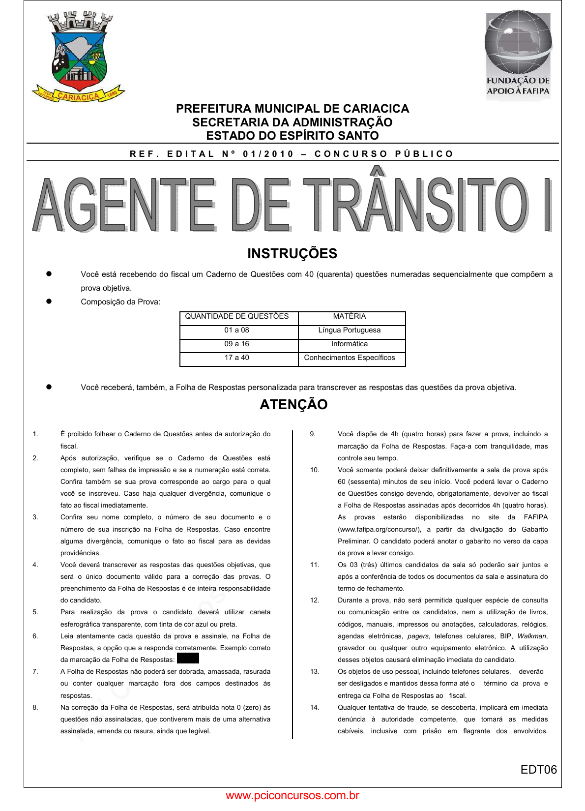 pcimarkpci MDAwMDowMDAwOjAwMDA6MDAwMDowMDAwOmZmZmY6OTU0ZTpiYjcy:VHVlLCAyOCBKYW4gMjAyNSAwNTowOTozMiAtMDMwMA== www.pciconcursos.com.br PREFEITURA MUNICIPAL DE CARIACICA SECRETARIA DA ADMINISTRAÇÃO ESTADO DO ESPÍRITO SANTO R E F . E D I T A L N º 0 1 / 2 0 1 0 – C O N C U R S O P Ú B L I C O INSTRUÇÕES � Você está recebendo do fiscal um Caderno de Questões com 40 (quarenta) questões numeradas sequencialmente que compõem a prova objetiva. � Composição da Prova: QUANTIDADE DE QUESTÕES MATÉRIA 01 a 08 Língua Portuguesa 09 a 16 Informática 17 a 40 Conhecimentos Específicos � Você receberá, também, a Folha de Respostas personalizada para transcrever as respostas das questões da prova objetiva. ATENÇÃO 1. É proibido folhear o Caderno de Questões antes da autorização do fiscal. 2. Após autorização, verifique se o Caderno de Questões está completo, sem falhas de impressão e se a numeração está correta. Confira também se sua prova corresponde ao cargo para o qual você se inscreveu. Caso haja qualquer divergência, comunique o fato ao fiscal imediatamente. 3. Confira seu nome completo, o número de seu documento e o número de sua inscrição na Folha de Respostas. Caso encontre alguma divergência, comunique o fato ao fiscal para as devidas providências. 4. Você deverá transcrever as respostas das questões objetivas, que será o único documento válido para a correção das provas. O preenchimento da Folha de Respostas é de inteira responsabilidade do candidato. 5. Para realização da prova o candidato deverá utilizar caneta esferográfica transparente, com tinta de cor azul ou preta. 6. Leia atentamente cada questão da prova e assinale, na Folha de Respostas, a opção que a responda corretamente. Exemplo correto da marcação da Folha de Respostas: 7. A Folha de Respostas não poderá ser dobrada, amassada, rasurada ou conter qualquer marcação fora dos campos destinados às respostas. 8. Na correção da Folha de Respostas, será atribuída nota 0 (zero) às questões não assinaladas, que contiverem mais de uma alternativa assinalada, emenda ou rasura, ainda que legível. 9. Você dispõe de 4h (quatro horas) para fazer a prova, incluindo a marcação da Folha de Respostas. Faça-a com tranquilidade, mas controle seu tempo. 10. Você somente poderá deixar definitivamente a sala de prova após 60 (sessenta) minutos de seu início. Você poderá levar o Caderno de Questões consigo devendo, obrigatoriamente, devolver ao fiscal a Folha de Respostas assinadas após decorridos 4h (quatro horas). As provas estarão disponibilizadas no site da FAFIPA (www.fafipa.org/concurso/), a partir da divulgação do Gabarito Preliminar. O candidato poderá anotar o gabarito no verso da capa da prova e levar consigo. 11. Os 03 (três) últimos candidatos da sala só poderão sair juntos e após a conferência de todos os documentos da sala e assinatura do termo de fechamento. 12. Durante a prova, não será permitida qualquer espécie de consulta ou comunicação entre os candidatos, nem a utilização de livros, códigos, manuais, impressos ou anotações, calculadoras, relógios, agendas eletrônicas, pagers, telefones celulares, BIP, Walkman, gravador ou qualquer outro equipamento eletrônico. A utilização desses objetos causará eliminação imediata do candidato. 13. Os objetos de uso pessoal, incluindo telefones celulares, deverão ser desligados e mantidos dessa forma até o término da prova e entrega da Folha de Respostas ao fiscal. 14. Qualquer tentativa de fraude, se descoberta, implicará em imediata denúncia à autoridade competente, que tomará as medidas cabíveis, inclusive com prisão em flagrante dos envolvidos. EDT06 www.pciconcursos.com.br pcimarkpci MDAwMDowMDAwOjAwMDA6MDAwMDowMDAwOmZmZmY6OTU0ZTpiYjcy:VHVlLCAyOCBKYW4gMjAyNSAwNTowOTozMiAtMDMwMA== www.pciconcursos.com.br FOLHA PARA ANOTAÇÃO DAS RESPOSTAS DO CANDIDATO QUESTÃO 01 02 03 04 05 06 07 08 09 10 11 12 13 14 15 16 17 18 19 20 RESP. QUESTÃO 21 22 23 24 25 26 27 28 29 30 31 32 33 34 35 36 37 38 39 40 RESP. www.pciconcursos.com.br pcimarkpci MDAwMDowMDAwOjAwMDA6MDAwMDowMDAwOmZmZmY6OTU0ZTpiYjcy:VHVlLCAyOCBKYW4gMjAyNSAwNTowOTozMiAtMDMwMA== www.pciconcursos.com.br CARGO: AGENTE DE TRÂNSITO I - 3 - LÍNGUA PORTUGUESA Santo Você ainda pode ser um. João Paulo II é o papa dos recordes. [...] Neste a no, o papa de desempenho superlativo em suas funções terrenas bateu um novo recorde, desta vez no céu. Em 2000 anos de história da Igreja, ele é o que mais fez santos. Ao todo, já canonizou 447. [.. .] Além disso, promoveu outras 1052 pessoas à condição de beatas, o penúltimo estágio antes da santidade. Duas razões explicam a fábrica de santos de João Paulo II. A primeira é que, na igreja sob seu comando, o próprio conceito de santidade mudou. Antigamente, santos eram figuras míticas da fé cristã, pessoas de conduta e virtudes ímpares , capazes de se submeter às mais terríveis provações em nome da religião que professavam. Depois de mortas e já candidatas à santidade, eram responsáveis por milagres e feitos extraordinários. Com essas exigências, ser santo era uma meta quase inatingível para seres humanos normais, repletos de defeitos e fraquezas e expostos às tentações e ao pecado. Os santos de João Paulo II, ao contrário, são pessoas comuns, sem nenhuma outra característica marcante que não seja ter levado uma vida honesta, fazendo o bem, rezando e seguindo os ensinamentos de Cristo. [...] Para facilitar o acess o das pessoas comuns ao status da santidade, o papa simplificou o processo de beatificações e canonizações. Do ponto de vista do processo canônico, hoje é muito mais fácil virar santo do qu e vinte anos atrás. [...] O que é um santo? De acordo com a doutrina católica, é a pessoa que, tendo seguido os mandamentos de Cristo e ajudado a promover o bem, ao morrer está salva e junto de Deus, no céu. Pela fé cristã, mesmo quem