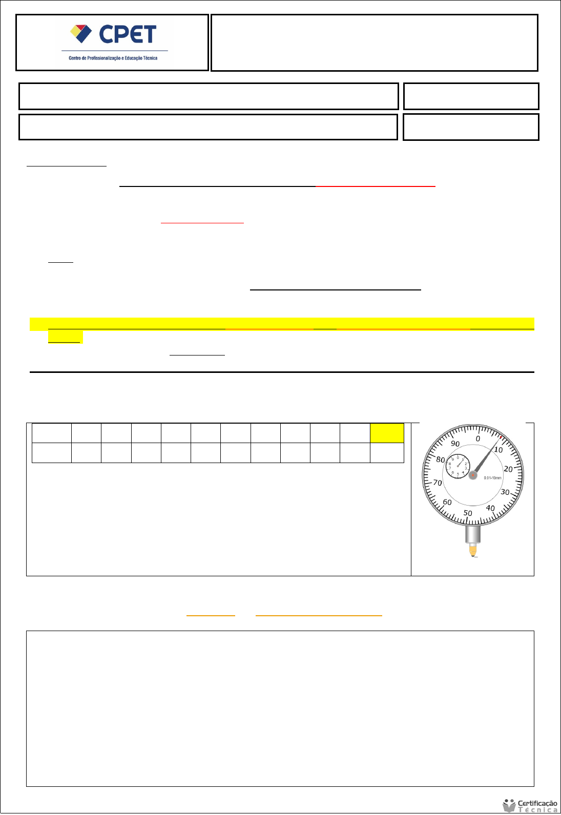 Metrologia II Data: 23/04/2024 Aluno (a): Patricia Darros Avaliação Prática Final INSTRUÇÕES: POR FAVOR, LEIA AS INSTRUÇÕES: · Preencha os dados no Cabeçalho para sua identificação; · Esta Avaliação contém 03 (três) questões, totalizando 10 (dez) pontos; · Leia com atenção os enunciados e faça o que se pede; · As respostas devem ser digitadas abaixo de cada pergunta; · NÃO serão aceitas respostas e textos retirados da íntegra Internet, assim como imagens (desde que seja pedida). A interpretação e execução fazem parte do processo. · Ao terminar grave o arquivo com o nome APF Disciplina – Nome do Aluno; · Só serão aceitas as extensões .docx (M.S. Word) ou .PDF; · Envie o arquivo pelo sistema no local indicado; · Atividades enviadas “em branco”, plagiadas de sites ou repetidas de outros alunos, terão notas ZERO. · Verifiquem no campo de comentário o feedback dado pelo tutor. · Em caso de dúvidas consulte o seu Tutor. Calcule a média das medidas realizada por um relógio comparador. Ao final informe se a média foi superior ao valor verdadeiro lido no micrômetro da figura abaixo. Medida 1 2 3 4 5 6 7 8 9 10 Média Valor (mm) 1,09 1,12 1,11 1,12 1,10 1,11 1,08 1,10 1,08 1,13 Para calcular a média basta somar todas as medidas e dividir pelo número de medidas realizadas. Valor da média é 1,10 está superior, pois o valor do instrumento é 1,08. 1) A metrologia utiliza-se definição de conceitos fundamentais em sua aplicação no dia-dia. Apresente as definições de Exatidão e Incerteza de medição, por fim cite exemplos de aplicações. Exatidão: Segundo o Vocabulário Internacional de Metrologia — VIM (VOCABULÁRIO..., 2012, p. 20), a exatidão de uma medida pode ser definida como o “grau de concordância entre um valor medido e um valor verdadeiro de um mensurando”. A exatidão de medição não é uma grandeza e não lhe é atribuído um valor numérico, ou seja, a exatidão é uma medida qualitativa. Incerteza de medição: O valor da incerteza de medição pode ser descrito por um parâmetro não negativo, que caracteriza a dispersão dos valores atribuídos a um mensurando. Como regra geral, quanto menor a incerteza em determinado sistema de medição, maior a necessidade de utilizar equipamentos mais precisos e maior o custo para realizar essa medição. Assim, maiores serão os investimentos em equipamentos/instrumentos de medição, treinamento de mão de obra e padrões usados na calibração. Imagine que você precisa adquirir para um hospital um termômetro para medição da temperatura do corpo humano. Nesse caso, você precisa de um termômetro confiável e com resolução baixa, que possa auxiliar o corpo médico na determinação de problemas de saúde. Ao realizar orçamento em várias empresas, você identifica que o menor valor encontra-se com uma empresa do Japão. Como você pode verificar se o termômetro tem um erro de medição aceitável? No momento da compra do termômetro, o valor indicado pelo fornecedor é apenas o da incerteza de medição. 2) O que é a resolução de um instrumento e como essa informação pode ser utilizada como critério para uso/escolha de determinado instrumento de medição? A resolução é o valor de uma divisão de um instrumento de medição, portanto, é a que pode ser observada no instrumento menor indicação. Por exemplo: se em um paquímetro, a indicação do valor medido é realizada de 0,02 em 0,02 mm, a resolução do paquímetro é de 0,02mm. Devemos saber qual a precisão da medida que queremos ter, pois temos instrumentos com mais precisão que outros, como o paquímetro que mede 0,02mm não é uma medida muito garantida, já para peças com medidas exatas seria mais garantida a medição com um micrometro. O micrômetro é um instrumento de medida voltado para a medição de pequenas peças com extrema precisão. Metrologia II Metrologia II image1.png image3.jpeg image2.png
