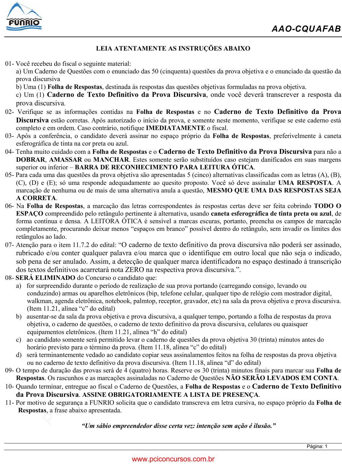 pcimarkpci MjgwNDowMTRjOjViYWU6ODBiMjphODllOmQ3ZTE6NDI5YTozMmI4:RnJpLCAyNCBKYW4gMjAyNSAyMToxOToxOCAtMDMwMA== www.pciconcursos.com.br AAO-CQUAFAB Página: 1 LEIA ATENTAMENTE AS INSTRUÇÕES ABAIXO 01- Você recebeu do fiscal o seguinte material: a) Um Caderno de Questões com o enunciado das 50 (cinquenta) questões da prova objetiva e o enunciado da questão da prova discursiva b) Uma (1) Folha de Respostas, destinada às respostas das questões objetivas formuladas na prova objetiva. c) Um (1) Caderno de Texto Definitivo da Prova Discursiva, onde você deverá transcrever a resposta da prova discursiva. 02- Verifique se as informações contidas na Folha de Respostas e no Caderno de Texto Definitivo da Prova Discursiva estão corretas. Após autorizado o início da prova, e somente neste momento, verifique se este caderno está completo e em ordem. Caso contrário, notifique IMEDIATAMENTE o fiscal. 03- Após a conferência, o candidato deverá assinar no espaço próprio da Folha de Respostas, preferivelmente à caneta esferográfica de tinta na cor preta ou azul. 04- Tenha muito cuidado com a Folha de Respostas e o Caderno de Texto Definitivo da Prova Discursiva para não a DOBRAR, AMASSAR ou MANCHAR. Estes somente serão substituídos caso estejam danificados em suas margens superior ou inferior – BARRA DE RECONHECIMENTO PARA LEITURA ÓTICA. 05- Para cada uma das questões da prova objetiva são apresentadas 5 (cinco) alternativas classificadas com as letras (A), (B), (C), (D) e (E); só uma responde adequadamente ao quesito proposto. Você só deve assinalar UMA RESPOSTA. A marcação de nenhuma ou de mais de uma alternativa anula a questão, MESMO QUE UMA DAS RESPOSTAS SEJA A CORRETA. 06- Na Folha de Respostas, a marcação das letras correspondentes às respostas certas deve ser feita cobrindo TODO O ESPAÇO compreendido pelo retângulo pertinente à alternativa, usando caneta esferográfica de tinta preta ou azul, de forma contínua e densa. A LEITORA ÓTICA é sensível a marcas escuras, portanto, preencha os campos de marcação completamente, procurando deixar menos “espaços em branco” possível dentro do retângulo, sem invadir os limites dos retângulos ao lado. 07- Atenção para o item 11.7.2 do edital: “O caderno de texto definitivo da prova discursiva não poderá ser assinado, rubricado e/ou conter qualquer palavra e/ou marca que o identifique em outro local que não seja o indicado, sob pena de ser anulado. Assim, a detecção de qualquer marca identificadora no espaço destinado à transcrição dos textos definitivos acarretará nota ZERO na respectiva prova discursiva.”. 08- SERÁ ELIMINADO do Concurso o candidato que: a) for surpreendido durante o período de realização de sua prova portando (carregando consigo, levando ou conduzindo) armas ou aparelhos eletrônicos (bip, telefone celular, qualquer tipo de relógio com mostrador digital, walkman, agenda eletrônica, notebook, palmtop, receptor, gravador, etc) na sala da prova objetiva e prova discursiva. (Item 11.21, alínea “c” do edital) b) ausentar-se da sala da prova objetiva e prova discursiva, a qualquer tempo, portando a folha de respostas da prova objetiva, o caderno de questões, o caderno de texto definitivo da prova discursiva, celulares ou quaisquer equipamentos eletrônicos. (Item 11.21, alínea “h” do edital) c) ao candidato somente será permitido levar o caderno de questões da prova objetiva 30 (trinta) minutos antes do horário previsto para o término da prova. (Item 11.18, alínea “c” do edital) d) será terminantemente vedado ao candidato copiar seus assinalamentos feitos na folha de respostas da prova objetiva ou no caderno de texto definitivo da prova discursiva. (Item 11.18, alínea “d” do edital) 09- O tempo de duração das provas será de 4 (quatro) horas. Reserve os 30 (trinta) minutos finais para marcar sua Folha de Respostas. Os rascunhos e as marcações assinaladas no Caderno de Questões NÃO SERÃO LEVADOS EM CONTA. 10- Quando terminar, entregue ao fiscal o Caderno de Questões, a Folha de Respostas e o Caderno de Texto Definitivo da Prova Discursiva. ASSINE OBRIGATORIAMENTE A LISTA DE PRESENÇA. 11- Por motivo de segurança a FUNRIO solicita que o candidato transcreva em letra cursiva, no espaço próprio da Folha de Respostas, a frase abaixo apresentada. “Um sábio empreendedor disse certa vez: intenção sem ação é ilusão.” www.pciconcursos.com.br pcimarkpci MjgwNDowMTRjOjViYWU6ODBiMjphODllOmQ3ZTE6NDI5YTozMmI4:RnJpLCAyNCBKYW4gMjAyNSAyMToxOToxOCAtMDMwMA== www.pciconcursos.com.br AAO-CQUAFAB Página: 3 ♦ Língua Portuguesa ♦ Questão 01 Segundo a gramática normativa, o substantivo sempre há de pertencer a um gênero, o que não ocorre com o adjetivo que assumirá o gênero em que o substantivo está empregado. Assim sendo, assinale a alternativa em que ambos os adjetivos não se flexionam em gênero: A) Cientista hindu; homem célebre. B) Costume andaluz; material lúdico-instrutivo. C) Elemento motor; tratamento médico-dentário. D) Esforço vão; passeio matinal. E) Juiz arrogante; sentimento fraterno. Questão 02 Há certo número de substantivos cuja significação varia de acordo com a mudança de gênero imposta a ele pela estrutura frasal em que ocorre: a partir dessa informação, assinale o item em que todas as palavras mudam de significado de acordo com o gênero em que são empregadas: A) capital – nascente – cabeça. B) cura – diabete – edema. C) grama – sanduíche – plasma. D) motocicleta – apendicite – cisma. E) telefonema – trema – diadema. Questão 03 Considerando a classe das palavras MAL e MAU e o seu emprego frasal, numere a 1ª coluna de acordo com a 2ª. Em seguida, assinale, na coluna 3, a letra que contém a série numérica cuja ordenação representa corretamente a relação que une a coluna 1 à 2: Coluna 1 Coluna 2 ( ) Faz mau tempo (1) Substantivo comum concreto ( ) Os maus serão punidos (2