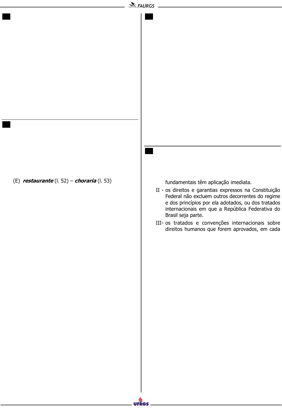 FAURGS – PROGESP – Edital 02/2013 13 – Engenheiro/Área: Química Pág. 8 23. Assinale as afirmações abaixo com V (verdadeiro) ou F (falso), no que se refere à caracterização morfológica de palavras do texto. ( ) abacateiro (l. 04) – palavra composta ( ) mesmo (l. 23) – palavra invariável quanto ao número ( ) eficiência (l. 40) – substantivo de gênero único ( ) fluorescente (l. 50-51) – palavra prefixada (A) F – V – V – F (B) F – F – V – F (C) F – F – V – V (D) V – F – V – F (E) V – V – F – V 24. Assinale a alternativa em que todas as palavras possuem a mesma classificação quanto à posição da sílaba tônica. (A) parece (l. 01) – acreditar (l. 07) (B) mora (l. 12) – Tentei (l. 14) (C) era (l. 23) – sei (l. 44) (D) banal (l. 43) – guardanapo (l. 45) (E) restaurante (l. 52) – choraria (l. 53) 25. Assinale a alternativa que, conforme a Constituição Federal, contém os entes que devem obedecer aos princípios da legalidade, impessoalidade, moralidade, publicidade e eficiência: (A) a administração pública direta e indireta de qual- quer dos Poderes da União, dos Estados, do Distrito Federal e dos Municípios. (B) somente a administração pública direta dos Poderes da União, em razão do sistema federativo. (C) somente a administração pública direta dos Poderes dos Estados e dos Municípios, pela força constitu- cional cogente. (D) somente a administração pública da União e do Distrito Federal, por força do sistema de compar- tilhamento constitucional. (E) a administração pública da União, do Distrito Federal e das nações amigas com as quais o Brasil mantenha tratados internacionais. 26. Considere as alternativas abaixo, relativas aos direitos e garantias fundamentais inscritos na Constituição Federal: I - as normas definidoras dos direitos e garantias fundamentais têm aplicação imediata. II - os direitos e garantias expressos na Constituição Federal não excluem outros decorrentes do regime e dos princípios por ela adotados, ou dos tratados internacionais em que a República Federativa do Brasil seja parte. III - os tratados e convenções internacionais sobre direitos humanos que forem aprovados, em cada Casa do Congresso Nacional, em dois turnos, por três quintos dos votos dos respectivos membros, serão equivalentes às emendas constitucionais. Quais estão corretas? (A) Apenas I. (B) Apenas II. (C) Apenas III. (D) Apenas I e II. (E) I, II e III. FAURGS – PROGESP – Edital 02/2013 13 – Engenheiro/Área: Química Pág. 9 27. Conforme a Constituição Federal, o prazo de validade do concurso público será de (A) cinco anos, improrrogável. (B) dois anos, improrrogável. (C) até quatro anos, prorrogável duas vezes, por igual período. (D) até dois anos, prorrogável uma vez, por igual período. (E) um ano, prorrogável quatro vezes pelo mesmo período. 28. O servidor público será aposentado compulsoriamente (A) aos sessenta e cinco anos de idade. (B) aos setenta anos de idade. (C) aos setenta e cinco anos de idade. (D) aos oitenta anos de idade. (E) a partir dos setenta anos, a critério da Adminis- tração. 29. Conforme a Constituição Federal, considere as seguintes assertivas: I - são incondicionalmente estáveis após três anos de efetivo exercício os servidores nomeados para cargo de provimento efetivo em virtude de concurso público. II - o servidor regularmente investido em cargo público e detentor de estabilidade não poderá perder o cargo em qualquer hipótese. III - é condição obrigatória para a aquisição da estabi- lidade a avaliação especial de desempenho por comissão instituída para essa finalidade. Quais estão corretas? (A) Apenas I. (B) Apenas II. (C) Apenas III. (D) Apenas I e II. (E) I, II e III. 30. Conforme a Lei n.º 8.112/1990, considere as assertivas abaixo. I - A Lei institui o Regime Jurídico dos Servidores Públicos Civis da União, dos Estados, do Distrito Federal e dos Municípios, bem como de suas autarquias e fundações públicas ou instituídas em regime privado. II - Servidor é a pessoa legalmente investida em cargo público. III - Cargo público é o conjunto de atribuições e responsabilidades previstas na estrutura organi- zacional que devem ser cometidas a um servidor. Quais estão corretas? (A) Apenas I. (B) Apenas II. (C) Apenas III. (D) Apenas II e III. (E) I, II e III. 31. Considere as assertivas abaixo, conforme a Lei n.º 8.112/1990. I - A juízo discricionário do gestor público, viabiliza-se a abertura de novo concurso ainda que haja candidato aprovado em concurso anterior com prazo de validade não expirado. II - Não se admitirá a posse por procuração. III - Exercício é o efetivo desempenho das atribuições do cargo. Quais estão corretas? (A) Apenas I. (B) Apenas II. (C) Apenas III. (D) Apenas II e III. (E) I, II e III. 32. Conforme a Lei n.º 8.112/1990, um servidor que venha a ser investido em cargo de atribuições e responsabilidades compatíveis com a limitação que tenha sofrido em sua capacidade física ou mental, verificada em inspeção médica, estará (A) exonerado. (B) revertido. (C) readaptado. (D) removido. (E) redistribuído.