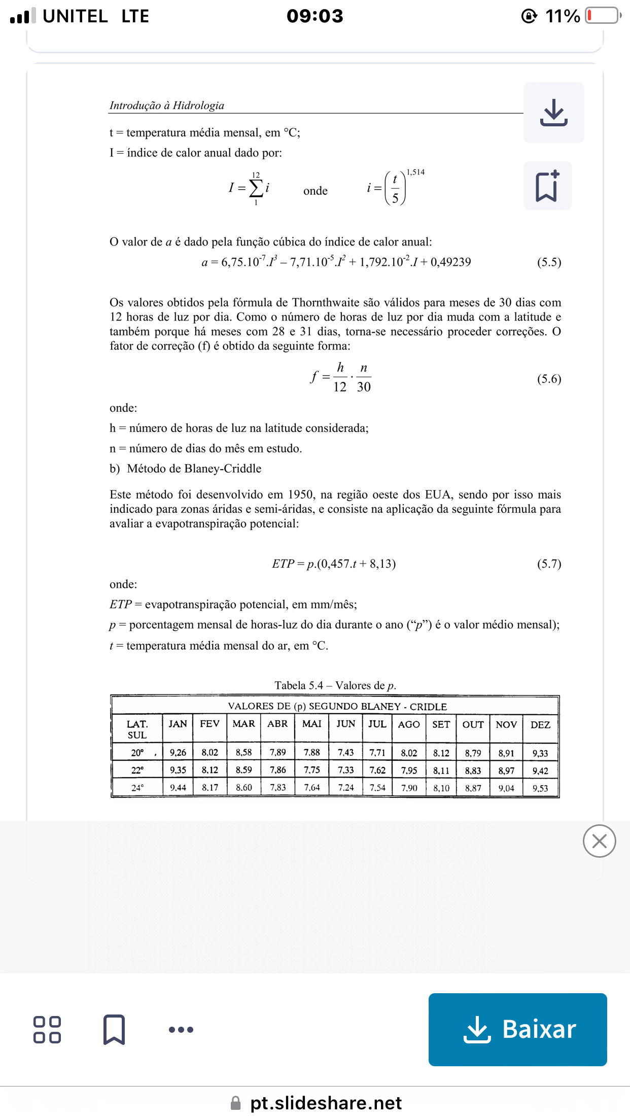 UNITEL LTE 09:03 11% Introdução à Hidrologia t = temperatura média mensal, em °C; I = índice de calor anual dado por: 12 1,514 onde valor de a é dado pela função cúbica do índice de calor anual: 0,49239 (5.5) Os valores obtidos pela fórmula de Thornthwaite são válidos para meses de 30 dias com 12 horas de luz por dia. Como o número de horas de luz por dia muda com a latitude e também porque há meses com 28 e 31 dias. torna-se necessário proceder correções. fator de correção (f) é obtido da seguinte forma: f = h n (5.6) 12 30 onde: h = número de horas de luz na latitude considerada; n = número de dias do mês em estudo. b) Método de Blaney-Criddle Este método foi desenvolvido em 1950, na região oeste dos EUA, sendo por isso mais indicado para zonas áridas e semi-áridas, e consiste na aplicação da seguinte fórmula para avaliar a evapotranspiração potencial: = (5.7) onde: ETP = evapotranspiração potencial, em mm/mês; p = porcentagem mensal de horas-luz do dia durante o ano ("p") é o valor médio mensal); t = temperatura média mensal do ar, em °C. Tabela 5.4 Valores de p. VALORES DE (p) SEGUNDO BLANEY CRIDLE LAT. JAN FEV MAR ABR MAI JUN JUL AGO SET OUT NOV DEZ SUL 9,26 8.02 8.58 7.89 7.88 7,43 8.02 8.12 8.79 8,91 9.33 9.35 8.12 8.59 7,86 7.75 7.33 7,62 7.95 8.11 8.83 8,97 9.42 24° 9.44 8.17 8.60 7.83 7.64 7.24 7.54 7,90 8.10 8.87 Baixar pt.slideshare.net