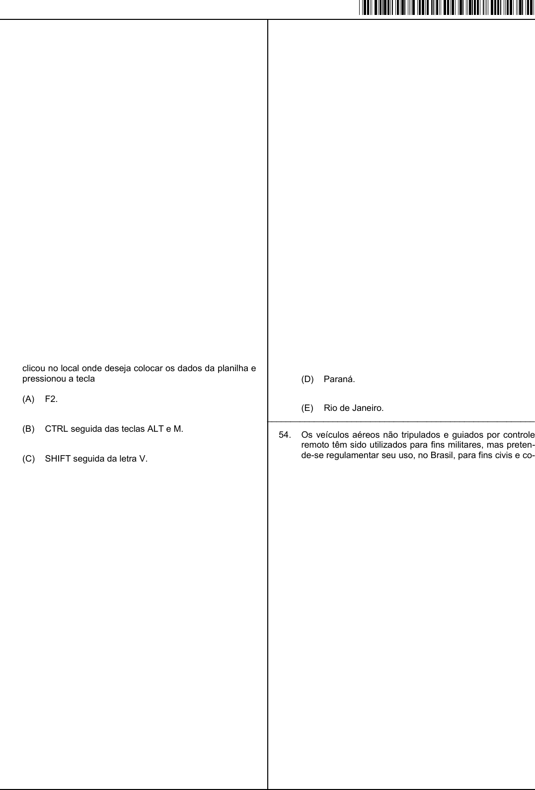 SABES-Est. Ens.-Superior 11 49. Considere que a planilha de consumo mensal de água e esgoto foi gravada anteriormente no HD com o nome controleConsumo.xls. Em uma apresentação criada no PowerPoint 2007 em português, Paulo deseja inserir esta planilha em um slide. Para realizar tal procedimento, clicou na guia Inserir e selecionou no grupo Texto a opção ...... . Ao clicar nesta opção, uma janela foi apresentada na tela. Nesta janela, Paulo selecionou a opção Criar do arquivo e realizou a sequência adequada para localizar e selecionar o arquivo controleConsumo.xls no HD. Preenche corretamente a lacuna, o que se encontra em: (A) Planilha. (B) Tabela. (C) Importar. (D) Objeto. (E) Dados Externos. _________________________________________________________ 50. Paula abriu a planilha de consumo mensal de água e es- goto no Excel 2007 em português e um documento em branco, no Microsoft Word 2007 em português. Seu obje- tivo é copiar os dados da planilha do Excel para o do- cumento do Word. Para isso, selecionou os dados da pla- nilha, pressionou simultaneamente a tecla CTRL e a le- tra C. Em seguida, alternou para o documento do Word, clicou no local onde deseja colocar os dados da planilha e pressionou a tecla (A) F2. (B) CTRL seguida das teclas ALT e M. (C) SHIFT seguida da letra V. (D) SHIFT seguida da letra X. (E) CTRL seguida da letra V. _________________________________________________________ Atualidades 51. Com a globalização, os blocos econômicos tornaram-se importantes protagonistas da economia internacional. Dos blocos atualmente existentes, aquele que desfruta de maior nível de integração, inclusive com a adoção de moe- da única, é (A) a Associação Latino-Americana de Integração − ALADI. (B) o Mercado Comum do Sul − MERCOSUL. (C) o Acordo de Livre Comércio da América do Norte − NAFTA. (D) a União Europeia − UE. (E) a Área de Livre Comércio das Américas − ALCA. 52. Segundo o Atlas do Desenvolvimento Humano no Brasil 2013, o município brasileiro que apresentou melhor Índice de Desenvolvimento Humano (IDH-M), formado por indica- dores de longevidade (saúde), educação e renda, foi (A) São Paulo (SP). (B) Jundiaí (SP). (C) São Caetano do Sul (SP). (D) Porto Alegre (RS). (E) Salvador (BA). _________________________________________________________ 53. A soma dos bens e serviços produzidos em um país, ou seja, o Produto Interno Bruto (PIB), é o principal indicador de seu crescimento econômico. No Brasil, os dados con- solidados para 2011 indicaram que o estado responsável por mais de 30% de todo o valor gerado pela economia brasileira foi (A) São Paulo. (B) Minas Gerais. (C) Rio Grande do Sul. (D) Paraná. (E) Rio de Janeiro. _________________________________________________________ 54. Os veículos aéreos não tripulados e guiados por controle remoto têm sido utilizados para fins militares, mas preten- de-se regulamentar seu uso, no Brasil, para fins civis e co- merciais. Tais veículos são conhecidos pelo nome de (A) clones. (B) drones. (C) closes. (D) clouds. (E) corns. _________________________________________________________ 55. A fim de evitar desperdício no consumo de energia elé- trica, estão sendo substituídas, no Brasil, de modo grada- tivo, as lâmpadas (A) dicroicas. (B) fluorescentes. (C) halógenas. (D) de LED. (E) incandescentes. Caderno de Prova ’35’, Tipo 001 www.pciconcursos.com.br 12 SABES-Est. Ens.-Superior 56. São cidades-sede dos jogos da Copa do Mundo de 2014, entre outras, (A) Curitiba, Fortaleza e Campo Grande. (B) Belo Horizonte, Manaus e Belém. (C) Rio de Janeiro, São Paulo e Cuiabá. (D) Natal, Goiânia e Recife. (E) Porto Alegre, Maceió e Salvador. _________________________________________________________ 57. Nas eleições gerais, que serão realizadas no Brasil em 5 de outubro de 2014, estarão em disputa os cargos de (A) governador, deputado estadual, deputado federal e vereador. (B) presidente da República, governador, senador, de- putado federal e deputado estadual ou distrital. (C) presidente da República, governador e prefeito. (D) vereador, deputado estadual e governador. (E) senador, deputado estadual e vereador. _________________________________________________________ 58. O Censo de 2010 identificou aumento no grau de urbani- zação do Brasil, que passou de 81,2%, em 2000, para 84,0%, em 2010, mostrando também as unidades da fede- ração com maiores percentuais da população vivendo em áreas urbanas. Tais unidades são: (A) São Paulo, Paraná e Rio de Janeiro. (B) São Paulo, Piauí e Bahia. (C) Distrito Federal, Pará e Rio de Janeiro. (D) Rio de Janeiro, São Paulo e Santa Catarina. (E) Rio de Janeiro, Distrito Federal e São Paulo. _________________________________________________________ 59. O aumento da temperatura média, o derretimento do gelo nos polos e a elevação do nível do mar constituem evidências do atual processo de aquecimento global, cujas causas são atribuídas (A) às radiações provocadas pelo uso intensivo de apa- relhos eletrônicos wireless. (B) às mudanças no movimento de translação da Terra em torno do Sol. (C) às tempestades magnéticas ocorridas na superfície do Sol. (D) aos gases de efeito estufa, emitidos em praticamen- te todas as atividades humanas. (E) à perfuração de poços de petróleo em águas oceâni- cas profundas. _________________________________________________________ 60. A operação Onda Verde, na Amazônia, dedica-se a com- bater (A) o desmatamento e outros crimes ambientais. (B) o contrabando de produtos eletrônicos. (C) a fabricação e distribuição de dólares falsos. (D) o tráfico e o consumo de drogas. (E) a prática de esportes radicais na região. Caderno de Prova ’35’, Tipo 001 www.pciconcursos.com.br