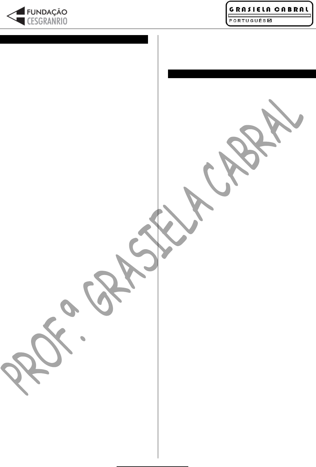 www.grasielacabral.com.br -1- FFOONNÉÉTTIICCAA 01) (CESGRANRIO / REFAP / SUPERIOR / 2007) A sequência em que a letra x corresponde ao mesmo fonema em todas as palavras é: (A) exonerar – expelir – extinto. (B) sexo – afixar – inexequível. (C) exuberante – excitar – exótico. (D) máximo – sintaxe – tórax. (E) exuberante – exumar – exonerar. 02) (CESGRANRIO / PROFESSOR TO / SUPERIOR / 2009) Assinale a opção em que todas as palavras contêm dígrafos. (A) Autoclismo, vendiam, foguete. (B) Cheguei, serviram, peúgas. (C) Comprar, elétrico, meias. (D) Descarga, vendiam, desci. (E) Expresso, bonde, cafezinho. 03) (CESGRANRIO / CONTROLADOR DE TRÁFEGO AÉREO / 2007) A sequência cujas palavras têm o mesmo número de fonemas é: (A) chuva – Paulo – vento. (B) irreal – amigo – contei. (C) guiando – convém – presente. (D) noite – trouxe – desceu. (E) uma – sim – meu. 04) (CESGRANRIO / CONTROLADOR DE TRÁFEGO AÉREO / 2007) Há um ditongo na palavra: (A) mitologia. (B) abaixo. (C) navio. (D) ainda. (E) reencadernar. 05) (CESGRANRIO / PROMINP / 2007) Uma das palavras escritas abaixo está com ERRO, na separação das sílabas. Assinale-a. (A) Re – jun – tar. (B) Ma – te – ri – ais. (C)Com – bus – tí – vel. (D)Pe – tró – leo. (E) Ar – ga – ma – ssa. GABARITO 1) E 2) E 3) B 4) B 5) E AACCEENNTTUUAAÇÇÃÃOO GGRRÁÁFFIICCAA 01) (CESGRANRIO / BNDES / MÉDIO / 2008) Analise os comentários gramaticais apresentados a seguir, e julgue os itens: ふáぶàásàpala┗ヴasàさj=ざàeàさミルsざàs?oàaIeミtuadasàeマàfuミç?oàdaà mesma regra de acentuação gráfica. (B) As lacunas das palavras exce__ão e percep__ão não são preenchidas com a mesma letra. 02) (CESGRANRIO / BNDES / SUPERIOR / 2008) As pala┗ヴasàケueàseàaIeミtuaマàpelaàマesマaàヴegヴaàdeàさpヴY┗iaざàeà さatYざ,àヴespeIti┗aマeミte,às?o (A) raízes e só. (B) inútil e baú. (C) infindáveis e você. (D) idéia e sofá. (E) hífen e saída. 03) (CESGRANRIO / PROMINP / 2007) A palavra que apresenta ERRO de acentuação é: (A) elétrico. (B) potência. (C) tratorísta. (D)óleo. (E) mecânico. 04) (CESGRANRIO / PROMINP / 2007) O vocábulo que deve receber acento gráfico é: (A) tatu. (B) tainha. (C) gratuito. (D) incluido. (E) padaria. 05) (CESGRANRIO / PROMINP / 2007) A palavra que obedece à mesma regra de acentuação de fenômeno é: (A) biocombustíveis. (B) energética. (C) agricultável. (D) suínos. (E) país. 06) (CESGRANRIO / TCE / RO / SUPERIOR / 2007) A ausência do sinal gráfico de acentuação cria outro sentido para a palavra: (A) trânsito. www.grasielacabral.com.br -2- (B) características. (C) inevitável. (D) infrutíferas. (E) anônimas. 07) (CESGRANRIO / PETROBRAS / MÉDIO / 2008) As palavras NÃO se acentuam pela mesma regra em ふáぶàさsaíヴaマざà– さ┗isioミ=ヴiaざ ふBぶàさ┗oIZざà– さatYざ ふCぶàさsoHヴe┗i┗ZミIiaざà– さミeIess=ヴiaざ ふDぶàさfYざà– さYざ ふEぶàさestíマuloざà– さdes>ミiマoざ 08) (CESGRANRIO / CAPES / MÉDIO / 2008) Assinale a frase em que a concordância do verbo com o sujeito se apresenta INCORRETA. (A) De onde vocês vêm a esta hora? (B) Todos os fiéis crêem nos poderes divinos. (C) Os pais vêem seus filhos crescerem. (D) As águas dos rios vem de suas nascentes. (E) Quero que os herdeiros dêem os bens aos necessitados 09) (CESGRANRIO / BNDES / SUPERIOR / 2008) Julgue o item: さ...até duヴaミteà oà Haミho.ざà eà さ...através do prazer da desIoHeヴta,ざ.àOsà┗oI=HulosàdestaIadosàaIeミtuaマ-se pela mesma regra 10) (CESGRANRIO / TÉCNICO DE NÍVEL SUPERIOR / 2006) Em relação ao comentário gramatical, assinale o item INCORRETO. (A) Os vocáHulosà destaIadosà eマà さTヴeiミaヴà a memória equivale a tヴeiミaヴà osà マúsIulosà doà Ioヴpoざà peヴteミIeマà aà classes gramaticais diferentes. ふBぶàEマàさTヴeiミaヴàaàマeマルヴiaàeケui┗aleàaàtヴeiミaヴàosàマúsIulosà do corpo - é preciso usá-la...ざà oà pヴoミoマeà oHlíケuoà fazà referência semântica(E) subordinada adverbial. GABARITO 1) D 2) E 3) A 4) E 5) A 6) C OORRAAÇÇÕÕEESS SSUUBBOORRDDIINNAADDAASS AADDJJEETTIIVVAASS 01) (CESGRANRIO / PROFESSOR TO / SUPERIOR / 2009) NoàtヴeIhoàさOàfiミalàque ele daí imaginou foi um: que, um dia, o Faustino pegava também a ter medo, queria ヴe┗ogaヴà oà ajuste!ざ, a palavra que desempenha nas orações, respectivamente, quanto à sintaxe, os valores de: (A) coordenação e de objeto direto. (B) coordenação e de sujeito. (C) subordinação e de objeto direto. (D) subordinação e de predicativo. (E) subordinação e de sujeito. 02) (CESGRANRIO / BNDES / SUPERIOR / JANEIRO/ 2008) Analise os comentários gramaticais apresentados a seguir, e JULGUE O ITEM: ふáぶàNaàpassageマàさÉàaàseミsaç?o,àpoヴàe┝eマplo,àケueàdoマiミaà uマaà pessoa...ざ,à oà pヴoミoマeà ヴelati┗oà さケueざà eケui┗aleà aà a qual. 03) (CESGRANRIO / PROMINP / 2008) A vida é como um espelho. Olhe para você mesmo e reflita...A cada dia você tem que decidir se continua do jeito que é ou muda! Só depende de você. Continue refletindo, olhe-se no espelho! Seja sincero com você. Não culpe ninguém, nem sua empresa pelos seus erros. Não tenha medo de mudar, não tenha medo de vencer! Se o medo de mudar vencer, você ficará amarrado, paralisado e não se transformará em agente de mudança. Só é vencido aquele que admite a si mesmo que está derrotado. Assinale a opção cuja classificação da oração destacada está INCORRETA. ふáぶà さOlheà paヴaà ┗oIZà マesマo...ざà – oração coordenada assindética. ふBぶàさ...ケueàY...ざà– oração adjetiva restritiva. ふCぶàさ“ルàdepeミdeàdeà┗oIZ.ざà– oração principal. ふDぶà さ...deà マudaヴ,ざà – ora