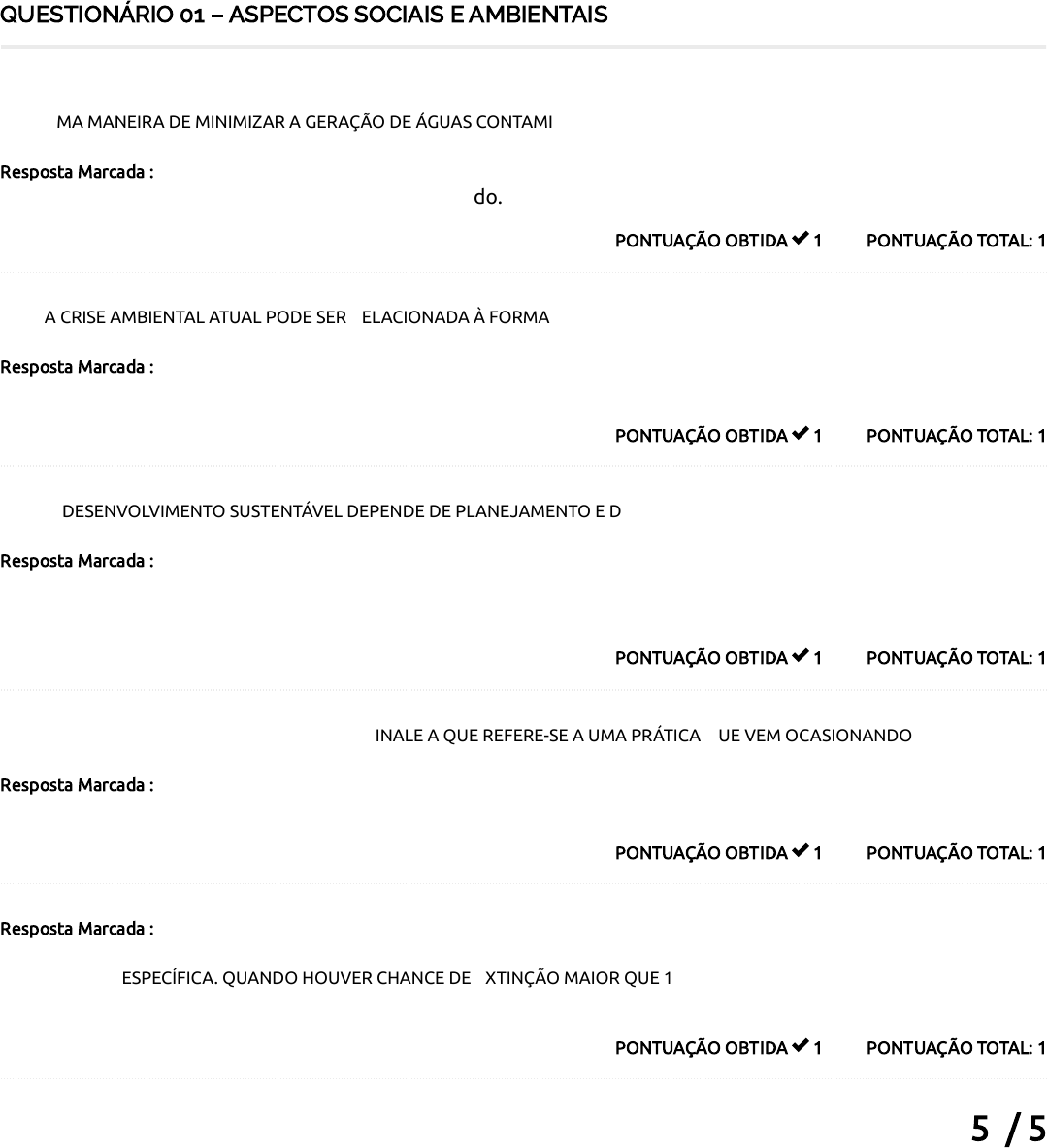 5 / 5 QUESTIONÁRIO 01 – ASPECTOS SOCIAIS E AMBIENTAIS UMA MANEIRA DE MINIMIZAR A GERAÇÃO DE ÁGUAS CONTAMINADAS É POR MEIO DO REUSO DA ÁGUA. DESSA FORMA, PROMOVE-SE O DESENVOLVIMENTO SUSTENTÁVEL. ASSINALE A ALTERNATIVA CORRETA SOBRE ESSE ASSUNTO. PONTUAÇÃO TOTAL: 1PONTUAÇÃO OBTIDA 1 Resposta Marcada : O reuso direto pode ser considerado um ciclo fechado. A CRISE AMBIENTAL ATUAL PODE SER RELACIONADA À FORMA COMO O HOMEM COMPREENDE SUA RELAÇÃO COM O AMBIENTE. SOBRE ESSA AFIRMAÇÃO, ASSINALE A ALTERNATIVA CORRETA. PONTUAÇÃO TOTAL: 1PONTUAÇÃO OBTIDA 1 Resposta Marcada : A crise ambiental atual tende a aumentar, pois o homem tem como prioridade dominar os recursos naturais. O DESENVOLVIMENTO SUSTENTÁVEL DEPENDE DE PLANEJAMENTO E DO RECONHECIMENTO DE QUE OS RECURSOS NATURAIS SÃO FINITOS. EM RELAÇÃO AO DESENVOLVIMENTO SUSTENTÁVEL, ASSINALE A ALTERNATIVA CORRETA. PONTUAÇÃO TOTAL: 1PONTUAÇÃO OBTIDA 1 Resposta Marcada : O desenvolvimento sustentável precisa, necessariamente, conciliar a harmonia entre os seres humanos, a economia e a natureza. DENTRE AS ALTERNATIVAS A SEGUIR, ASSINALE A QUE REFERE-SE A UMA PRÁTICA QUE VEM OCASIONANDO NA EXTINÇÃO EM MASSA DE ESPÉCIES (ANIMAIS E VEGETAIS). PONTUAÇÃO TOTAL: 1PONTUAÇÃO OBTIDA 1 Resposta Marcada : Destruição antrópica do ambiente, como desmatamento. EXTINÇÃO É A MORTE, O DESAPARECIMENTO TOTAL DAS ESPÉCIES, COMO ANIMAIS E PLANTAS, PODENDO OCORRER DE DIVERSAS MANEIRAS, ALGUMAS INEVITÁVEIS E OUTRAS COM UMA CAUSA ESPECÍFICA. QUANDO HOUVER CHANCE DE EXTINÇÃO MAIOR QUE 10%, EM 100 ANOS, DIZ-SE QUE A ESPÉCIE ESTÁ: PONTUAÇÃO TOTAL: 1PONTUAÇÃO OBTIDA 1 Resposta Marcada : vulnerável. Total de Pontos 15/01/2025, 14:26 Course Status – AVA Saúde Unifaveni https://ava.saude.unifaveni.com.br/course-status/ 1/1