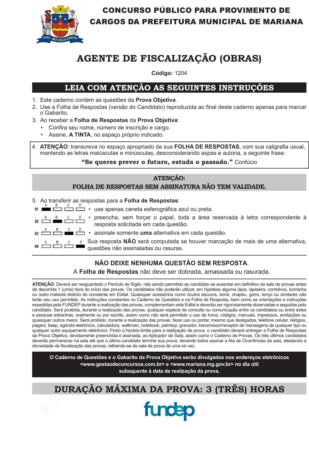 pcimarkpci MDAwMDowMDAwOjAwMDA6MDAwMDowMDAwOmZmZmY6OTU0ZTpiYjZm:V2VkLCAyOSBKYW4gMjAyNSAyMDoyNTozOCAtMDMwMA== www.pciconcursos.com.br CONCURSO PÚBLICO PARA PROVIMENTO DE CARGOS DA PREFEITURA MUNICIPAL DE MARIANA AGENTE DE FISCALIZAÇÃO (OBRAS) Código: 1204 LEIA COM ATENÇÃO AS SEGUINTES INSTRUÇÕES 1. Este caderno contém as questões da Prova Objetiva. 2. Use a Folha de Respostas (versão do Candidato) reproduzida ao final deste caderno apenas para marcar o Gabarito. 3. Ao receber a Folha de Respostas da Prova Objetiva: • Confira seu nome, número de inscrição e cargo. • Assine, A TINTA, no espaço próprio indicado. 4. ATENÇÃO: transcreva no espaço apropriado da sua FOLHA DE RESPOSTAS, com sua caligrafia usual, mantendo as letras maiúsculas e minúsculas, desconsiderando aspas e autoria, a seguinte frase: “Se queres prever o futuro, estuda o passado.” Confúcio ATENÇÃO: FOLHA DE RESPOSTAS SEM ASSINATURA NÃO TEM VALIDADE. 5. Ao transferir as respostas para a Folha de Respostas: • use apenas caneta esferográfica azul ou preta. • preencha, sem forçar o papel, toda a área reservada à letra correspondente à resposta solicitada em cada questão. • assinale somente uma alternativa em cada questão. Sua resposta NÃO será computada se houver marcação de mais de uma alternativa, questões não assinaladas ou rasuras. NÃO DEIXE NENHUMA QUESTÃO SEM RESPOSTA. A Folha de Respostas não deve ser dobrada, amassada ou rasurada. ATENÇÃO: Deverá ser resguardado o Período de Sigilo, não sendo permitido ao candidato se ausentar em definitivo da sala de provas antes de decorrida 1 (uma) hora do início das provas. Os candidatos não poderão utilizar, em hipótese alguma lápis, lapiseira, corretivos, borracha ou outro material distinto do constante em Edital. Quaisquer acessórios como óculos escuros, boné, chapéu, gorro, lenço ou similares não terão seu uso permitido. As instruções constantes no Caderno de Questões e na Folha de Resposta, bem como as orientações e instruções expedidas pela FUNDEP durante a realização das provas, complementam este Edital e deverão ser rigorosamente observadas e seguidas pelo candidato. Será proibida, durante a realização das provas, qualquer espécie de consulta ou comunicação entre os candidatos ou entre estes e pessoas estranhas, oralmente ou por escrito, assim como não será permitido o uso de livros, códigos, manuais, impressos, anotações ou quaisquer outros meios. Será proibido, durante a realização das provas, fazer uso ou portar, mesmo que desligados, telefone celular, relógios, pagers, beep, agenda eletrônica, calculadora, walkman, notebook, palmtop, gravador, transmissor/receptor de mensagens de qualquer tipo ou qualquer outro equipamento eletrônico. Findo o horário-limite para a realização da prova, o candidato deverá entregar a Folha de Respostas da Prova Objetiva, devidamente preenchida e assinada, ao Aplicador de Sala, assim como o Caderno de Provas. Os três últimos candidatos deverão permanecer na sala até que o último candidato termine sua prova, devendo todos assinar a Ata de Ocorrências da sala, atestando a idoneidade da fiscalização das provas, retirando-se da sala de prova de uma só vez. O Caderno de Questões e o Gabarito da Prova Objetiva serão divulgados nos endereços eletrônicos e no dia útil subsquente à data de realização da prova. DURAÇÃO MÁXIMA DA PROVA: 3 (TRÊS) HORAS pcimarkpci MDAwMDowMDAwOjAwMDA6MDAwMDowMDAwOmZmZmY6OTU0ZTpiYjZm:V2VkLCAyOSBKYW4gMjAyNSAyMDoyNTozOCAtMDMwMA== www.pciconcursos.com.br ATENÇÃO Sr.(a) Candidato(a), Antes de começar a fazer a prova, confira se este caderno contém, ao todo, 40 (quarenta) questões de múltipla escolha, cada uma constituída de 4 (quatro) alternativas de respostas, assim distribuídas: 10 (dez) questões de Língua Portuguesa, 5 (cinco) questões de Matemática, 5 (cinco) questões de Conhecimentos de Informática, 5 (cinco) questões de Atualidades, 5 (cinco) questões de Legislação e 10 (dez) questões de Conhecimentos Específicos, todas perfeitamente legíveis. Havendo algum problema, informe imediatamente ao aplicador de provas para que ele tome as providências necessárias. Caso não observe essa recomendação, não lhe caberá qualquer reclamação ou recursos posteriores. pcimarkpci MDAwMDowMDAwOjAwMDA6MDAwMDowMDAwOmZmZmY6OTU0ZTpiYjZm:V2VkLCAyOSBKYW4gMjAyNSAyMDoyNTozOCAtMDMwMA== www.pciconcursos.com.br 3 LÍNGUA PORTUGUESA INSTRUÇÃO: Leia o trecho de obra a seguir, para responder às questões de 1 a 10. A revolução dos bichos O Sr. Jones, proprietário da Granja do Solar, fechou o galinheiro à noite, mas estava bêbado demais para lembrar-se de fechar também as vigias. Com o facho de luz da sua lanterna balançando de um lado para o outro, atravessou cambaleante o pátio, tirou as botas na porta dos fundos, tomou um último copo de cerveja do barril que havia na copa, e foi para a cama, onde sua mulher já ressonava. Tão logo apagou-se a luz do quarto, houve um grande alvoroço em todos os galpões da granja. Correra, durante o dia, o boato de que o velho Major, um porco que já se sagrara grande campeão numa exposição, tivera um sonho muito estranho na noite anterior e desejava contá-lo aos outros animais. Haviam combinado encontrar-se no celeiro, assim que Jones se retirasse. O velho Major (chamavam-no assim, muito embora ele houvesse comparecido a exposição com o nome de “Beleza de Willingdon”) gozava de tão alto conceito na granja, que todos estavam dispostos a perder uma hora de sono só para ouvi-lo. Ao fundo do grande celeiro, sobre uma espécie de estrado, estava o Major refestelado em sua cama de palha, sob um lampião que pendia de uma viga. Com doze anos de idade, já bastante corpulento, era ainda um porco de porte majestoso, com um ar sábio e benevolente, a despeito de suas presas jamais terem sido cortadas. Os outros animais chegavam e punham-se a cômodo, c