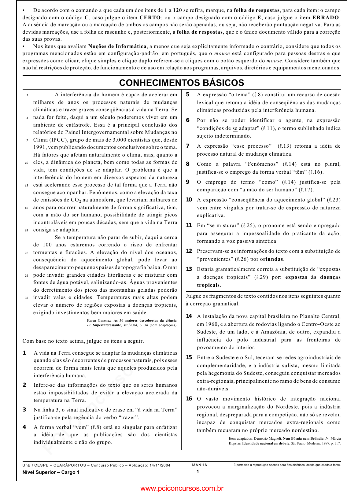 pcimarkpci MDAwMDowMDAwOjAwMDA6MDAwMDowMDAwOmZmZmY6OTU0ZTpiOTRj:VGh1LCAzMCBKYW4gMjAyNSAwMzozNToyOSAtMDMwMA== www.pciconcursos.com.br UnB / CESPE – CEARÁPORTOS – Concurso Público – Aplicação: 14/11/2004 MANHÃ É permitida a reprodução apenas para fins didáticos, desde que citada a fonte. Nível Superior – Cargo 1 – 1 – • De acordo com o comando a que cada um dos itens de 1 a 120 se refira, marque, na folha de respostas, para cada item: o campo designado com o código C , caso julgue o item CERTO ; ou o campo designado com o código E, caso julgue o item ERRADO . A ausência de marcação ou a marcação de ambos os campos não serão apenadas, ou seja, não receberão pontuação negativa. Para as devidas marcações, use a folha de rascunho e, posteriormente, a folha de respostas, que é o único documento válido para a correção das suas provas. • Nos itens que avaliam Noções de Informática, a menos que seja explicitamente informado o contrário, considere que todos os programas mencionados estão em configuração-padrão, em português, que o mouse está configurado para pessoas destras e que expressões como clicar, clique simples e clique duplo referem-se a cliques com o botão esquerdo do mouse. Considere também que não há restrições de proteção, de funcionamento e de uso em relação aos programas, arquivos, diretórios e equipamentos mencionados. CONHECIMENTOS BÁSICOS 1 A interferência do homem é capaz de acelerar em milhares de anos os processos naturais de mudanças climáticas e trazer graves conseqüências à vida na Terra. Se 4 nada for feito, daqui a um século poderemos viver em um ambiente de catástrofe. Essa é a principal conclusão dos relatórios do Painel Intergovernamental sobre Mudanças no 7 Clima (IPCC), grupo de mais de 3.000 cientistas que, desde 1991, vem publicando documentos conclusivos sobre o tema. Há fatores que afetam naturalmente o clima, mas, quanto a 10 eles, a dinâmica do planeta, bem como todas as formas de vida, tem condições de se adaptar. O problema é que a interferência do homem em diversos aspectos da natureza 13 está acelerando esse processo de tal forma que a Terra não consegue acompanhar. Fenômenos, como a elevação da taxa 2de emissões de CO na atmosfera, que levariam milhares de 16 anos para ocorrer naturalmente de forma significativa, têm, com a mão do ser humano, possibilidade de atingir picos incontroláveis em poucas décadas, sem que a vida na Terra 19 consiga se adaptar. Se a temperatura não parar de subir, daqui a cerca de 100 anos estaremos correndo o risco de enfrentar 22 tormentas e furacões. A elevação do nível dos oceanos, conseqüência do aquecimento global, pode levar ao desaparecimento pequenos países de topografia baixa. O mar 25 pode invadir grandes cidades litorâneas e se misturar com fontes de água potável, salinizando-as. Águas provenientes do derretimento dos picos das montanhas geladas poderão 28 invadir vales e cidades. Temperaturas mais altas podem elevar o número de regiões expostas a doenças tropicais, exigindo investimentos bem maiores em saúde. Karen Gimenez. As 30 maiores descobertas da ciência. In: Superinteressante, set./2004, p. 34 (com adaptações). Com base no texto acima, julgue os itens a seguir. 1 A vida na Terra consegue se adaptar às mudanças climáticas quando elas são decorrentes de processos naturais, pois esses ocorrem de forma mais lenta que aqueles produzidos pela interferência humana. 2 Infere-se das informações do texto que os seres humanos estão impossibilitados de evitar a elevação acelerada da temperatura na Terra. 3 Na linha 3, o sinal indicativo de crase em “à vida na Terra” justifica-se pela regência do verbo “trazer”. 4 A forma verbal “vem” (�.8) está no singular para enfatizar a idéia de que as publicações são dos cientistas individualmente e não do grupo. 5 A expressão “o tema” (�.8) constitui um recurso de coesão lexical que retoma a idéia de conseqüências das mudanças climáticas produzidas pela interferência humana. 6 Por não se poder identificar o agente, na expressão “condições de se adaptar” (�.11), o termo sublinhado indica sujeito indeterminado. 7 A expressão “esse processo” (�.13) retoma a idéia de processo natural de mudança climática. 8 Como a palavra “Fenômenos” (�.14) está no plural, justifica-se o emprego da forma verbal “têm” (�.16). 9 O emprego do termo “como” (�.14) justifica-se pela comparação com “a mão do ser humano” (�.17). 10 A expressão “conseqüência do aquecimento global” (�.23) vem entre vírgulas por tratar-se de expressão de natureza explicativa. 11 Em “se misturar” (�.25), o pronome está sendo empregado para assegurar a impessoalidade do praticante da ação, formando a voz passiva sintética. 12 Preservam-se as informações do texto com a substituição de “provenientes” (�.26) por oriundas. 13 Estaria gramaticalmente correta a substituição de “expostas a doenças tropicais” (�.29) por: expostas às doenças tropicais. Julgue os fragmentos de texto contidos nos itens seguintes quanto à correção gramatical. 14 A instalação da nova capital brasileira no Planalto Central, em 1960, e a abertura de rodovias ligando o Centro-Oeste ao Sudeste, de um lado, e à Amazônia, de outro, expandiu a influência do polo industrial para as fronteiras de povoamento do interior. 15 Entre o Sudeste e o Sul, teceram-se redes agroindustriais de complementaridade, e a indústria sulista, mesmo limitada pela hegemonia do Sudeste, conseguiu conquistar mercados extra-regionais, principalmente no ramo de bens de consumo não-duráveis. 16 O vasto movimento histórico de integração nacional provocou a marginalização do Nordeste, pois a indústria regional, despreparada para a competição, não só se revelou incapaz de conquistar mercados extra-regionais como também recuaram no 