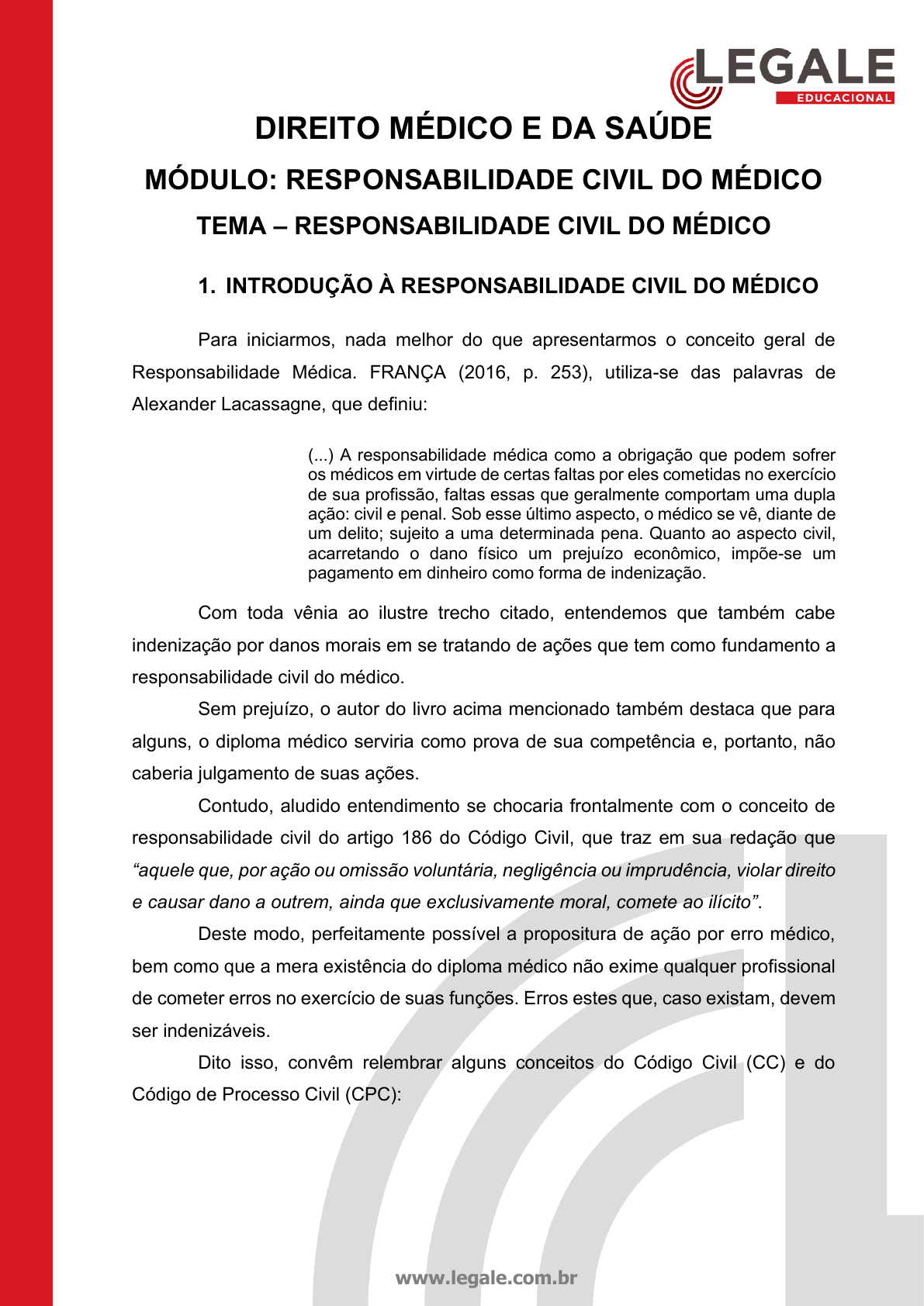www.legale.com.br DIREITO MÉDICO E DA SAÚDE MÓDULO: RESPONSABILIDADE CIVIL DO MÉDICO TEMA – RESPONSABILIDADE CIVIL DO MÉDICO 1. INTRODUÇÃO À RESPONSABILIDADE CIVIL DO MÉDICO Para iniciarmos, nada melhor do que apresentarmos o conceito geral de Responsabilidade Médica. FRANÇA (2016, p. 253), utiliza-se das palavras de Alexander Lacassagne, que definiu: (...) A responsabilidade médica como a obrigação que podem sofrer os médicos em virtude de certas faltas por eles cometidas no exercício de sua profissão, faltas essas que geralmente comportam uma dupla ação: civil e penal. Sob esse último aspecto, o médico se vê, diante de um delito; sujeito a uma determinada pena. Quanto ao aspecto civil, acarretando o dano físico um prejuízo econômico, impõe-se um pagamento em dinheiro como forma de indenização. Com toda vênia ao ilustre trecho citado, entendemos que também cabe indenização por danos morais em se tratando de ações que tem como fundamento a responsabilidade civil do médico. Sem prejuízo, o autor do livro acima mencionado também destaca que para alguns, o diploma médico serviria como prova de sua competência e, portanto, não caberia julgamento de suas ações. Contudo, aludido entendimento se chocaria frontalmente com o conceito de responsabilidade civil do artigo 186 do Código Civil, que traz em sua redação que “aquele que, por ação ou omissão voluntária, negligência ou imprudência, violar direito e causar dano a outrem, ainda que exclusivamente moral, comete ao ilícito”. Deste modo, perfeitamente possível a propositura de ação por erro médico, bem como que a mera existência do diploma médico não exime qualquer profissional de cometer erros no exercício de suas funções. Erros estes que, caso existam, devem ser indenizáveis. Dito isso, convêm relembrar alguns conceitos do Código Civil (CC) e do Código de Processo Civil (CPC): Andrielly Von Stein Andrade - 10131182943 www.legale.com.br BEVILÁQUIA, citado por RODRIGUES (2006, p. 324) define a prescrição como “a perda de uma ação atribuída a um direito e de toda sua capacidade defensiva, em consequência do não-uso delas, durante um determinado tempo”. Significa dizer que, não sendo proposta determina ação dentro de um período – geralmente, definido por lei – perde-se a oportunidade de pleitear em juízo um eventual direito subjetivo violado. No caso do Direito Médico, para identificarmos os prazos prescricionais, é importante traçar uma diferenciação quando estamos diante de atendimento de médico particular e atendimento por médico do estado (servidor público). Enquanto no atendimento particular estaremos diante de uma relação de consumo, no atendimento feito por médico do estado, não. Para melhor expor a diferença mencionada, precisamos fazer uma breve digressão ao Código de Defesa do Consumidor (CDC), já que no art. 3º, § 2º é considerado como serviço protegido pela lei consumerista, aqueles realizados mediante remuneração. Veja que, para caso de contrato de planos de saúde, aludido entendimento foi consolidado pela Súmula 608 do STJ, a qual aduz que “aplica-se o Código de Defesa do Consumidor aos contratos de plano de saúde, salvo os administrados por entidades de autogestão". Desta forma, o prazo prescricional para propor uma ação pautada em erro médico é de 5 (cinco) anos, nos termos do art. 27 do Código de Defesa do Consumidor. Mencionado prazo é contado a partir do conhecimento do ato ilícito: Art. 27. Prescreve em cinco anos a pretensão à reparação pelos danos causados por fato do produto ou do serviço prevista na Seção II deste Capítulo, iniciando-se a contagem do prazo a partir do conhecimento do dano e de sua autoria. Para que não pairem dúvidas acerca do momento em que se inicia a contagem do prazo, imaginemos que um paciente adentrou o seu escritório relatando que realizou uma cirurgia em 2010 e que, no mesmo ano em que compareceu no seu escritório, começou a sentir fortes dores naquela mesmo região, de modo que, após exames de imagem realizados dias antes ao comparecimento em seu escritório, constatou que houve o esquecimento de uma gaze naquele mesmo local, algo que lhe proporcionou lesões naquele local. Nesse sentido, não terá ocorrido a prescrição neste caso, uma vez que o conhecimento do fato se deu recentemente, passando, Andrielly Von Stein Andrade - 10131182943 www.legale.com.br assim, a computar a prescrição a partir dessa peculiaridade e não da data da realização da cirurgia em si. Desta forma, o prazo prescricional será a partir do momento em que se descobriu que a gaze se fazia presente, e não na data do ato médico, já que, até então, não se sabia da existência do corpo estranho no paciente. 2. BASES PARA ELABORAÇÃO DA PETIÇÃO INICIAL A base de uma petição inicial é o art. 319 do Código de Processo Civil (CPC). Ou seja, o procedimento comum. Vejamos tal dispositivo abaixo: Art. 319. A petição inicial indicará: I - o juízo a que é dirigida; II - os nomes, os prenomes, o estado civil, a existência de união estável, a profissão, o número de inscrição no Cadastro de Pessoas Físicas ou no Cadastro Nacional da Pessoa Jurídica, o endereço eletrônico, o domicílio e a residência do autor e do réu; III - o fato e os fundamentos jurídicos do pedido; IV - o pedido com as suas especificações; V - o valor da causa; VI - as provas com que o autor pretende demonstrar a verdade dos fatos alegados; VII - a opção do autor pela realização ou não de audiência de conciliação ou de mediação. § 1º Caso não disponha das informações previstas no inciso II, poderá o autor, na petição inicial, requerer ao juiz diligências necessárias a sua obtenção. § 2º A petição inicial não será indeferida se, a despeito da falta de informações a que se refere o inciso II, for possível a citação do réu. § 3º A petição inicial não ser