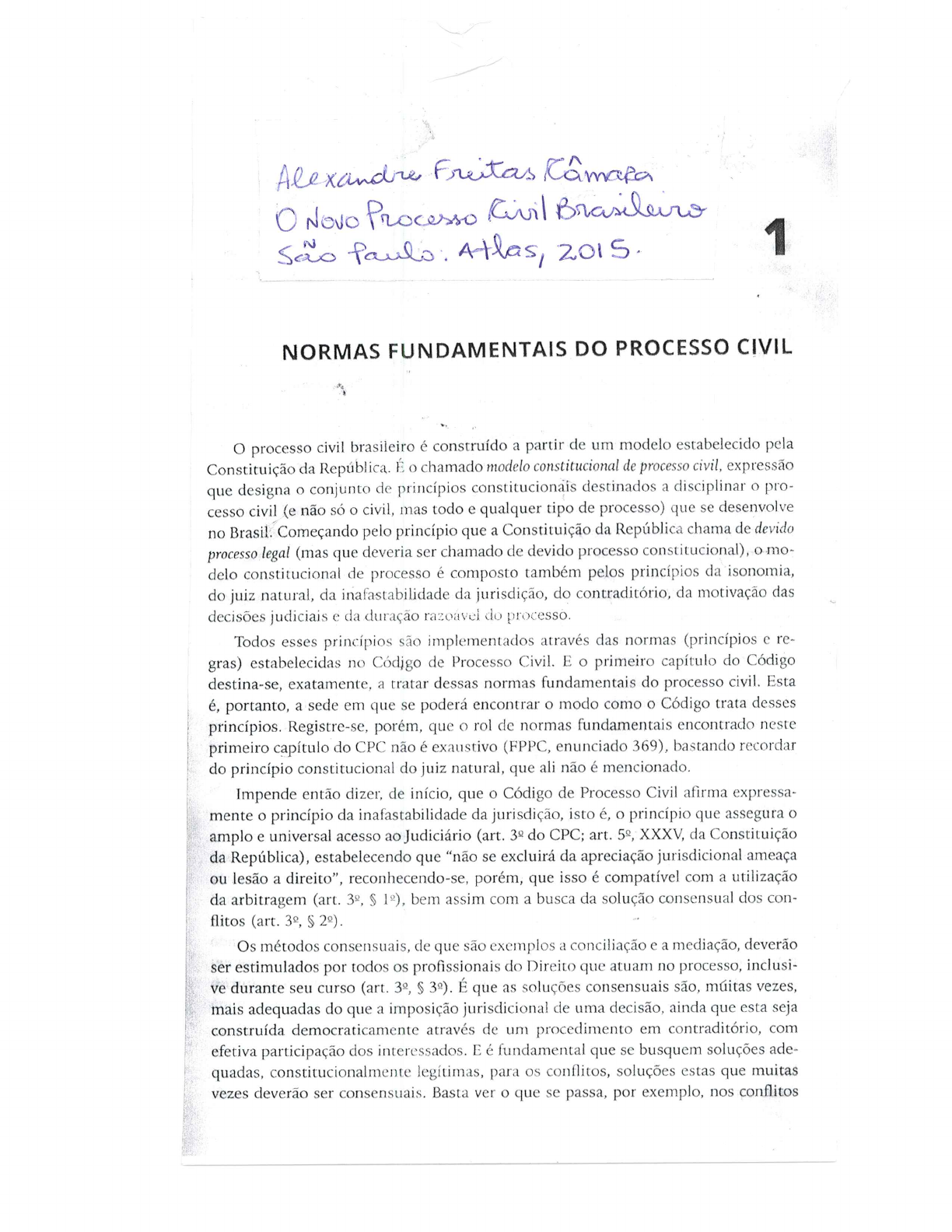 Alexandre Freitas Camara 0 Novo Processo Brasileiro Atlas, 2015 1 NORMAS FUNDAMENTAIS DO PROCESSO CIVIL O processo civil brasileiro é construído a partir de um modelo estabelecido pela Constituição da É chamado modelo constitucional de processo civil, expressão que designa conjunto de princípios constitucionais destinados a disciplinar pro- cesso civil (e não só civil, mas todo e qualquer tipo de processo) que se desenvolve no Brasil. Começando pelo princípio que a Constituição da República chama de devido processo legal (mas que deveria ser chamado de devido processo constitucional), delo constitucional de processo é composto também pelos princípios da isonomia, do juiz natural, da inafastabilidade da jurisdição, do contraditório, da motivação das decisões judiciais e da duração razoável do processo. Todos esses princípios são implementados através das normas (princípios e re- gras) estabelecidas no Código de Processo Civil. E primeiro capítulo do Código destina-se, exatamente, a tratar dessas normas fundamentais do processo civil. Esta é, portanto, a sede em que se poderá encontrar o modo como Código trata desses princípios. Registre-se, porém, que rol de normas fundamentais encontrado neste primeiro capítulo do CPC não é exaustivo (FPPC, enunciado 369), bastando recordar do princípio constitucional do juiz natural, que ali não é mencionado. Impende então dizer, de início, que O Código de Processo Civil afirma expressa- mente o princípio da inafastabilidade da jurisdição, isto é, princípio que assegura O amplo e universal acesso ao Judiciário (art. do CPC; art. XXXV, da Constituição da República), estabelecendo que "não se excluirá da apreciação jurisdicional ameaça ou lesão a direito", reconhecendo-se, porém, que isso é compatível com a utilização da arbitragem (art. § bem assim com a busca da solução consensual dos con- flitos (art. § Os métodos consensuais, de que são exemplos a conciliação e a mediação, deverão ser estimulados por todos os profissionais do Direito que atuam no processo, inclusi- ve durante seu curso (art. § É que as soluções consensuais são, múitas vezes, mais adequadas do que a imposição jurisdicional de uma decisão, ainda que esta seja construída democraticamente através de um procedimento em contraditório, com efetiva participação dos interessados. E é fundamental que se busquem soluções ade- quadas, constitucionalmente legítimas, para os conflitos, soluções estas que muitas vezes deverão ser consensuais. Basta ver que se passa, por exemplo, nos conflitos6 NOVO PROCESSO CIVIL BRASILEIRO Câmara de A solução consensual é certamente muito mais adequada, já que os víncu- los intersubjetivos existentes entre os sujeitos em conflito (e também entre pessoas estranhas ao litígio, mas por ele afetadas, como se dá com filhos nos conflitos que se estabelecem entre seus pais) permanecerão mesmo depois de definida a solução da causa. Daí a importância da valorização da busca de soluções adequadas (sejam elas jurisdicionais ou parajurisdicionais) para os litígios. A solução da causa deve ser obtida em tempo razoável (art. do CPC; art. 5°, LXXVIII, da Constituição da República), incluída a atividade necessária à satisfação prática do direito (o que significa dizer que não basta obter-se a sentença em tempo razoável, devendo ser tempestiva também a entrega do resultado de eventual ativi- dade executiva) A garantia de duração razoável do processo deve ser compreendida, então, de forma panorâmica, pensando-se na duração total do processo, e não só no tempo necessário para se produzir a sentença do processo de conhecimento. Busca-se, então, assegurar a duração razoável do processo, sendo relevante desta- car o compromisso do Código de Processo Civil com esse princípio Há uma nítida opção do sistema pela construção de um sistema destinado a permitir a produção do resultado do processo sem dilações indevidas. Vale destacar, porém, que se todos têm direito a um processo sem dilações indevidas, daí se extrai que ninguém tem direito a um processo sem as dilações devidas. Em outros termos, o sistema é comprometido com a duração razoável do processo, sem que isso implique uma busca desenfreada pela celeridade processual a qualquer preço. E isto porque um processo que respeita as garantias fundamentais é, necessariamente, um processo que demora algum tempo. O amplo debate que deve existir entre os sujeitos do procedimento em contraditório exige tempo. A adequada dilação probatória também exige tempo. A fi- xação de prazos razoáveis para a prática de atos relevantes para a defesa dos interesses em juízo, como a contestação e os recursos, faz com que processo demore algum tempo. Mas estas são dilações devidas, compatíveis com as garantias constitucionais do processo. A observância de um sistema de vinculação a precedentes, especialmente no que concerne às causas repetitivas; a construção de mecanismos de antecipação de tutela, tanto para situações de urgência como para casos em que a se funda na evidência; a melhoria do sistema recursal, com diminuição de oportunidades recur- sais; tudo isso contribui para a duração mais razoável do processo. É, porém, sempre importante ter claro que só se pode cogitar de duração razoável do processo quando este é capaz de produzir os resultados a que se dirige. E estes são resultados que ne- cessariamente têm de ser constitucionalmente legítimos, pois resultados constitucio- nalmente legítimos exigem algum tempo para serem alcançados. Um processo rápido e que não produz resultados constitucionalmente adequa- dos não é eficiente. E a eficiência é também um princípio do processo civil (art. Impõe-se, assim, a busca do equilíbrio, evitando-se demoras desnecessárias, punin- do-se aqueles que busquem protelar processo (e daí a legit