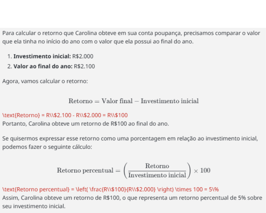 Supondo que o lucro líquido do exercício de 20X1 e 20X2 tenham sido, respectivamente, de $8. 720 e $12. 410, podemos aCarolina sempre foi aficionada por entender os conceitos básicos de finanças e aprendeu desde cedo a guardar suas economias em um velho porquinho de vidro. Visando um investimento mais lucrativo, decidiu depositar R$2. 000 na sua conta poupança. Ao final do ano corrente totalizava R$2. 100 em sua conta. Quanto de retorno Carolina obteve? Afirmar que (utilizando a análise horizontal). image1.png image2.png