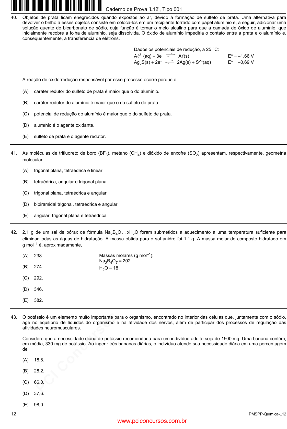 pcimarkpci MjgwNDowMTRjOjViYWU6ODBiMjphODllOmQ3ZTE6NDI5YTozMmI4:U2F0LCAyNSBKYW4gMjAyNSAxODoxMTowNCAtMDMwMA== www.pciconcursos.com.br 12 PMSPP-Química-L12 40. Objetos de prata ficam enegrecidos quando expostos ao ar, devido à formação de sulfeto de prata. Uma alternativa para devolver o brilho a esses objetos consiste em colocá-los em um recipiente forrado com papel alumínio e, a seguir, adicionar uma solução quente de bicarbonato de sódio, cuja função é tornar o meio alcalino para que a camada de óxido de alumínio, que inicialmente recobre a folha de alumínio, seja dissolvida. O óxido de alumínio impediria o contato entre a prata e o alumínio e, consequentemente, a transferência de elétrons. Dados os potenciais de redução, a 25 °C: A3+(aq) + 3e− A(s) E° = −1,66 V Ag2S(s) + 2e− 2Ag(s) + S2−(aq) E° = −0,69 V A reação de oxidorredução responsável por esse processo ocorre porque o (A) caráter redutor do sulfeto de prata é maior que o do alumínio. (B) caráter redutor do alumínio é maior que o do sulfeto de prata. (C) potencial de redução do alumínio é maior que o do sulfeto de prata. (D) alumínio é o agente oxidante. (E) sulfeto de prata é o agente redutor. 41. As moléculas de trifluoreto de boro (BF3), metano (CH4) e dióxido de enxofre (SO2) apresentam, respectivamente, geometria molecular (A) trigonal plana, tetraédrica e linear. (B) tetraédrica, angular e trigonal plana. (C) trigonal plana, tetraédrica e angular. (D) bipiramidal trigonal, tetraédrica e angular. (E) angular, trigonal plana e tetraédrica. 42. 2,1 g de um sal de bórax de fórmula Na2B4O7 . xH2O foram submetidos a aquecimento a uma temperatura suficiente para eliminar todas as águas de hidratação. A massa obtida para o sal anidro foi 1,1 g. A massa molar do composto hidratado em g mol−1 é, aproximadamente, (A) 238. (B) 274. (C) 292. (D) 346. (E) 382. 43. O potássio é um elemento muito importante para o organismo, encontrado no interior das células que, juntamente com o sódio, age no equilíbrio de líquidos do organismo e na atividade dos nervos, além de participar dos processos de regulação das atividades neuromusculares. Considere que a necessidade diária de potássio recomendada para um indivíduo adulto seja de 1500 mg. Uma banana contém, em média, 330 mg de potássio. Ao ingerir três bananas diárias, o indivíduo atende sua necessidade diária em uma porcentagem de (A) 18,8. (B) 28,2. (C) 66,0. (D) 37,6. (E) 98,0. Massas molares (g mol−1): Na2B4O7 = 202 H2O = 18 Caderno de Prova ’L12’, Tipo 001 www.pciconcursos.com.br pcimarkpci MjgwNDowMTRjOjViYWU6ODBiMjphODllOmQ3ZTE6NDI5YTozMmI4:U2F0LCAyNSBKYW4gMjAyNSAxODoxMTowNCAtMDMwMA== www.pciconcursos.com.br PMSPP-Química-L12 13 44. Uma solução tampão alcalina é formada quando as seguintes substâncias são misturadas em solução aquosa: (A) ácido clorídrico e cloreto de sódio. (B) hidróxido de sódio e cloreto de sódio. (C) cloreto de sódio e acetato de sódio. (D) ácido clorídrico e hidróxido de sódio. (E) ácido bórico e borato de sódio. 45. O produto de solubilidade (Kps) do Ba(IO3)2 (s) é dado pela expressão (A) + + _ 3 2 IOBa . (B) 2_ 3 2 IOBa + + . (C) + _ 3 2 IO.Ba . (D) 2_ 3 2 IO/Ba + . (E) 2_ 3 2 IO.Ba + . 46. Sobre os grupos de elementos que constituem a tabela periódica, nas condições ambiente, os (A) gases nobres são elementos muito reativos e ocorrem em abundância na Terra. (B) metais alcalinos formam compostos com o oxigênio. (C) metais de transição apresentam-se no estado líquido. (D) metais alcalino-terrosos formam compostos covalentes. (E) halogênios são os elementos menos reativos da tabela periódica. 47. Considerando os dados da tabela abaixo, Ligação Energia média de ligação (kJ . mol−1) C–H 413 C–C 242 C–C 338 H–C 431 é possível prever que a reação CH4 (g) + C2 (g) → CH3C (g) + HC (g) tenha ΔH, em kJ, da ordem de (A) –3902 e seja exotérmica. (B) –114 e seja exotérmica. (C) +3902 e seja endotérmica. (D) +114 e seja endotérmica. (E) –1353 e seja exotérmica. Caderno de Prova ’L12’, Tipo 001 www.pciconcursos.com.br