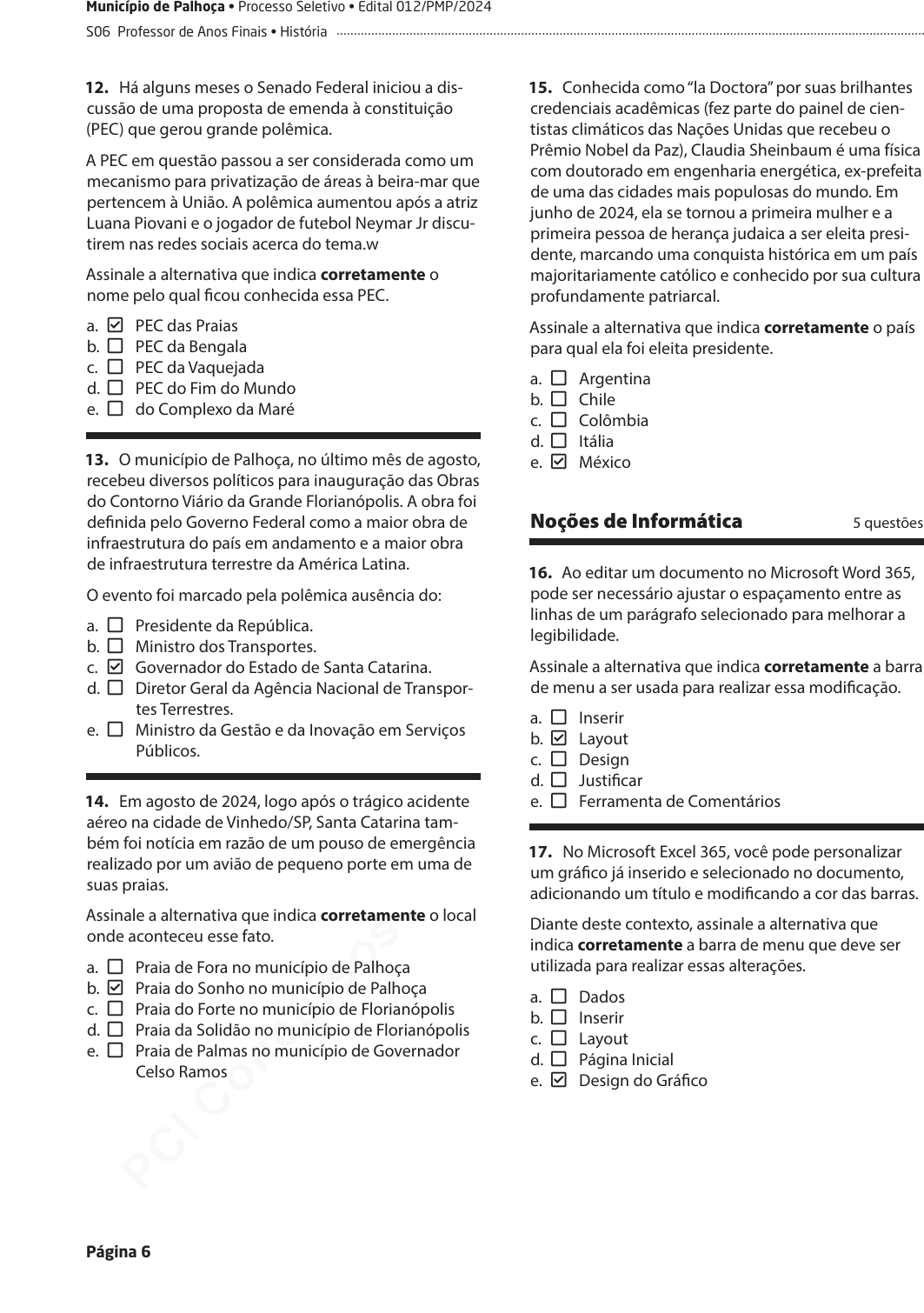 pcimarkpci MjgwNDowMTRjOjViYWU6ODBiMjozNTg2OjE4MmI6ZDY2YTpmMWEx:TW9uLCAyNyBKYW4gMjAyNSAxNzoyNTo1OCAtMDMwMA== www.pciconcursos.com.br Página 6 Município de Palhoça • Processo Seletivo • Edital 012/PMP/2024 S06 Professor de Anos Finais • História 12. Há alguns meses o Senado Federal iniciou a dis- cussão de uma proposta de emenda à constituição (PEC) que gerou grande polêmica. A PEC em questão passou a ser considerada como um mecanismo para privatização de áreas à beira-mar que pertencem à União. A polêmica aumentou após a atriz Luana Piovani e o jogador de futebol Neymar Jr discu- tirem nas redes sociais acerca do tema.w Assinale a alternativa que indica corretamente o nome pelo qual ficou conhecida essa PEC. a. Check-square PEC das Praias b. SQUARE PEC da Bengala c. SQUARE PEC da Vaquejada d. SQUARE PEC do Fim do Mundo e. SQUARE do Complexo da Maré 13. O município de Palhoça, no último mês de agosto, recebeu diversos políticos para inauguração das Obras do Contorno Viário da Grande Florianópolis. A obra foi definida pelo Governo Federal como a maior obra de infraestrutura do país em andamento e a maior obra de infraestrutura terrestre da América Latina. O evento foi marcado pela polêmica ausência do: a. SQUARE Presidente da República. b. SQUARE Ministro dos Transportes. c. Check-square Governador do Estado de Santa Catarina. d. SQUARE Diretor Geral da Agência Nacional de Transpor- tes Terrestres. e. SQUARE Ministro da Gestão e da Inovação em Serviços Públicos. 14. Em agosto de 2024, logo após o trágico acidente aéreo na cidade de Vinhedo/SP, Santa Catarina tam- bém foi notícia em razão de um pouso de emergência realizado por um avião de pequeno porte em uma de suas praias. Assinale a alternativa que indica corretamente o local onde aconteceu esse fato. a. SQUARE Praia de Fora no município de Palhoça b. Check-square Praia do Sonho no município de Palhoça c. SQUARE Praia do Forte no município de Florianópolis d. SQUARE Praia da Solidão no município de Florianópolis e. SQUARE Praia de Palmas no município de Governador Celso Ramos 15. Conhecida como “la Doctora” por suas brilhantes credenciais acadêmicas (fez parte do painel de cien- tistas climáticos das Nações Unidas que recebeu o Prêmio Nobel da Paz), Claudia Sheinbaum é uma física com doutorado em engenharia energética, ex-prefeita de uma das cidades mais populosas do mundo. Em junho de 2024, ela se tornou a primeira mulher e a primeira pessoa de herança judaica a ser eleita presi- dente, marcando uma conquista histórica em um país majoritariamente católico e conhecido por sua cultura profundamente patriarcal. Assinale a alternativa que indica corretamente o país para qual ela foi eleita presidente. a. SQUARE Argentina b. SQUARE Chile c. SQUARE Colômbia d. SQUARE Itália e. Check-square México Noções de Informática 5 questões 16. Ao editar um documento no Microsoft Word 365, pode ser necessário ajustar o espaçamento entre as linhas de um parágrafo selecionado para melhorar a legibilidade. Assinale a alternativa que indica corretamente a barra de menu a ser usada para realizar essa modificação. a. SQUARE Inserir b. Check-square Layout c. SQUARE Design d. SQUARE Justificar e. SQUARE Ferramenta de Comentários 17. No Microsoft Excel 365, você pode personalizar um gráfico já inserido e selecionado no documento, adicionando um título e modificando a cor das barras. Diante deste contexto, assinale a alternativa que indica corretamente a barra de menu que deve ser utilizada para realizar essas alterações. a. SQUARE Dados b. SQUARE Inserir c. SQUARE Layout d. SQUARE Página Inicial e. Check-square Design do Gráfico pcimarkpci MjgwNDowMTRjOjViYWU6ODBiMjozNTg2OjE4MmI6ZDY2YTpmMWEx:TW9uLCAyNyBKYW4gMjAyNSAxNzoyNTo1OCAtMDMwMA== www.pciconcursos.com.br Página 7 Município de Palhoça • Processo Seletivo • Edital 012/PMP/2024 S06 Professor de Anos Finais • História 18. Dentro de um ambiente urbano, onde existe uma demanda significativa por largura de banda para suportar atividades como transmissão de vídeos em 4K, jogos online e trabalho a distância, qual seria a conexão de internet mais adequada para garantir um desempenho superior e a mínima latência? a. SQUARE Conexão DSL b. SQUARE Conexão Discada c. Check-square Conexão via Fibra Óptica d. SQUARE Conexão via Satélite e. SQUARE Conexão via Cabo 19. Para garantir a fácil localização de e-mails impor- tantes e o arquivamento adequado dos menos rele- vantes, é essencial organizar sua caixa de entrada. Dado esse cenário, qual é a opção correta para apri- morar a organização e eficiência no gerenciamento de e-mails? a. SQUARE Deletar todos os e-mails recebidos regular- mente para evitar acúmulos de informações. b. SQUARE Encaminhar e-mails importantes para você mesmo para garantir que sejam lembrados. c. SQUARE Manter todos os e-mails na caixa de entrada e usar a função de anexo para encontrar mensa- gens específicas. d. Check-square Usar pastas e etiquetas para categorizar e orga- nizar e-mails de acordo com tópicos, projetos ou remetentes. e. SQUARE Desativar notificações de e-mails para evi- tar distrações e acessar os e-mails apenas esporadicamente. 20. Você precisa liberar espaço no seu computador com Windows 10, mas deseja assegurar a possibili- dade de recuperação de arquivos importantes em um curto prazo. Assinale a alternativa que indica corretamente o pro- cedimento que você deve realizar para excluir arqui- vos, permitindo sua recuperação futura, se necessário. a. SQUARE Formatar o disco rígido. b. Check-square Arrastar os arquivos para a Lixeira. c. SQUARE Pressionar Shift + Delete para apagar os arqui- vos diretamente. d. SQUARE Usar o Gerenciador de Tarefas para finalizar processos desnecessários. e. SQUARE Desinstalar programas que você não utiliza mais. Conhecimentos Específicos 20 questões 21. De acordo com o artigo 3º da Lei de Dire