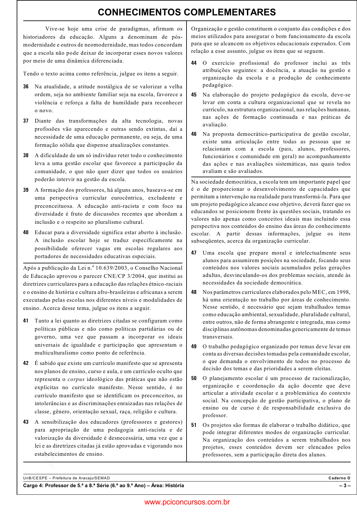 pcimarkpci MjgwNDowMTRjOjViYWU6ODBiMjozNTg2OjE4MmI6ZDY2YTpmMWEx:TW9uLCAyNyBKYW4gMjAyNSAxNzowMToyMiAtMDMwMA== www.pciconcursos.com.br UnB/CESPE – Prefeitura de Aracaju/SEMAD Caderno D Cargo 4: Professor de 5.ª a 8.ª Série (6.º ao 9.º Ano) – Área: História – 3 – CONHECIMENTOS COMPLEMENTARES Vive-se hoje uma crise de paradigmas, afirmam os historiadores da educação. Alguns a denominam de pós- modernidade e outros de neomodernidade, mas todos concordam que a escola não pode deixar de incorporar esses novos valores por meio de uma dinâmica diferenciada. Tendo o texto acima como referência, julgue os itens a seguir. 36 Na atualidade, a atitude nostálgica de se valorizar a velha ordem, seja no ambiente familiar seja na escola, favorece a violência e reforça a falta de humildade para reconhecer o novo. 37 Diante das transformações da alta tecnologia, novas profissões vão aparecendo e outras sendo extintas, daí a necessidade de uma educação permanente, ou seja, de uma formação sólida que dispense atualizações constantes. 38 A dificuldade de um só indivíduo reter todo o conhecimento leva a uma gestão escolar que favorece a participação da comunidade, o que não quer dizer que todos os usuários poderão intervir na gestão da escola. 39 A formação dos professores, há alguns anos, baseava-se em uma perspectiva curricular eurocêntrica, excludente e preconceituosa. A educação anti-racista e com foco na diversidade é fruto de discussões recentes que abordam a inclusão e o respeito ao pluralismo cultural. 40 Educar para a diversidade significa estar aberto à inclusão. A inclusão escolar hoje se traduz especificamente na possibilidade oferecer vagas em escolas regulares aos portadores de necessidades educativas especiais. Após a publicação da Lei n. 10.639/2003, o Conselho Nacionalo de Educação aprovou o parecer CNE/CP 3/2004, que institui as diretrizes curriculares para a educação das relações étnico-raciais e o ensino de história e cultura afro-brasileiras e africanas a serem executadas pelas escolas nos diferentes níveis e modalidades de ensino. Acerca desse tema, julgue os itens a seguir. 41 Tanto a lei quanto as diretrizes citadas se configuram como políticas públicas e não como políticas partidárias ou de governo, uma vez que passam a incorporar os ideais universais de igualdade e participação que apresentam o multiculturalismo como ponto de referência. 42 É sabido que existe um currículo manifesto que se apresenta nos planos de ensino, curso e aula, e um currículo oculto que representa o corpus ideológico das práticas que não estão explícitas no currículo manifesto. Nesse sentido, é no currículo manifesto que se identificam os preconceitos, as intolerâncias e as discriminações enraizadas nas relações de classe, gênero, orientação sexual, raça, religião e cultura. 43 A sensibilização dos educadores (professores e gestores) para apropriação de uma pedagogia anti-racista e de valorização da diversidade é desnecessária, uma vez que a lei e as diretrizes citadas já estão aprovadas e vigorando nos estabelecimentos de ensino. Organização e gestão constituem o conjunto das condições e dos meios utilizados para assegurar o bom funcionamento da escola para que se alcancem os objetivos educacionais esperados. Com relação a esse assunto, julgue os itens que se seguem. 44 O exercício profissional do professor inclui as três atribuições seguintes: a docência, a atuação na gestão e organização da escola e a produção de conhecimento pedagógico. 45 Na elaboração do projeto pedagógico da escola, deve-se levar em conta a cultura organizacional que se revela no currículo, na estrutura organizacional, nas relações humanas, nas ações de formação continuada e nas práticas de avaliação. 46 Na proposta democrático-participativa de gestão escolar, existe uma articulação entre todas as pessoas que se relacionam com a escola (pais, alunos, professores, funcionários e comunidade em geral) no acompanhamento das ações e nas avaliações sistemáticas, nas quais todos avaliam e são avaliados. Na sociedade democrática, a escola tem um importante papel que é o de proporcionar o desenvolvimento de capacidades que permitam a intervenção na realidade para transformá-la. Para que um projeto pedagógico alcance esse objetivo, deverá fazer que os educandos se posicionem frente às questões sociais, tratando os valores não apenas como conceitos ideais mas incluindo essa perspectiva nos conteúdos do ensino das áreas do conhecimento escolar. A partir dessas informações, julgue os itens subseqüentes, acerca da organização curricular. 47 Uma escola que prepare moral e intelectualmente seus alunos para assumirem posições na sociedade, focando seus conteúdos nos valores sociais acumulados pelas gerações adultas, desvinculando-os dos problemas sociais, atende às necessidades da sociedade democrática. 48 Nos parâmetros curriculares elaborados pelo MEC, em 1998, há uma orientação no trabalho por áreas de conhecimento. Nesse sentido, é necessário que sejam trabalhados temas como educação ambiental, sexualidade, pluralidade cultural, entre outros, não de forma abrangente e integrada, mas como disciplinas autônomas denominadas genericamente de temas transversais. 49 O trabalho pedagógico organizado por temas deve levar em conta as diversas decisões tomadas pela comunidade escolar, o que demanda o envolvimento de todos no processo de decisão dos temas e das prioridades a serem eleitas. 50 O planejamento escolar é um processo de racionalização, organização e coordenação da ação docente que deve articular a atividade escolar e a problemática do contexto social. Na concepção de gestão participativa, o plano de ensino ou de curso é de responsabilidade exclusiva do professor. 51 Os projetos são formas de elaborar o trabalho didático, que pode integrar diferente