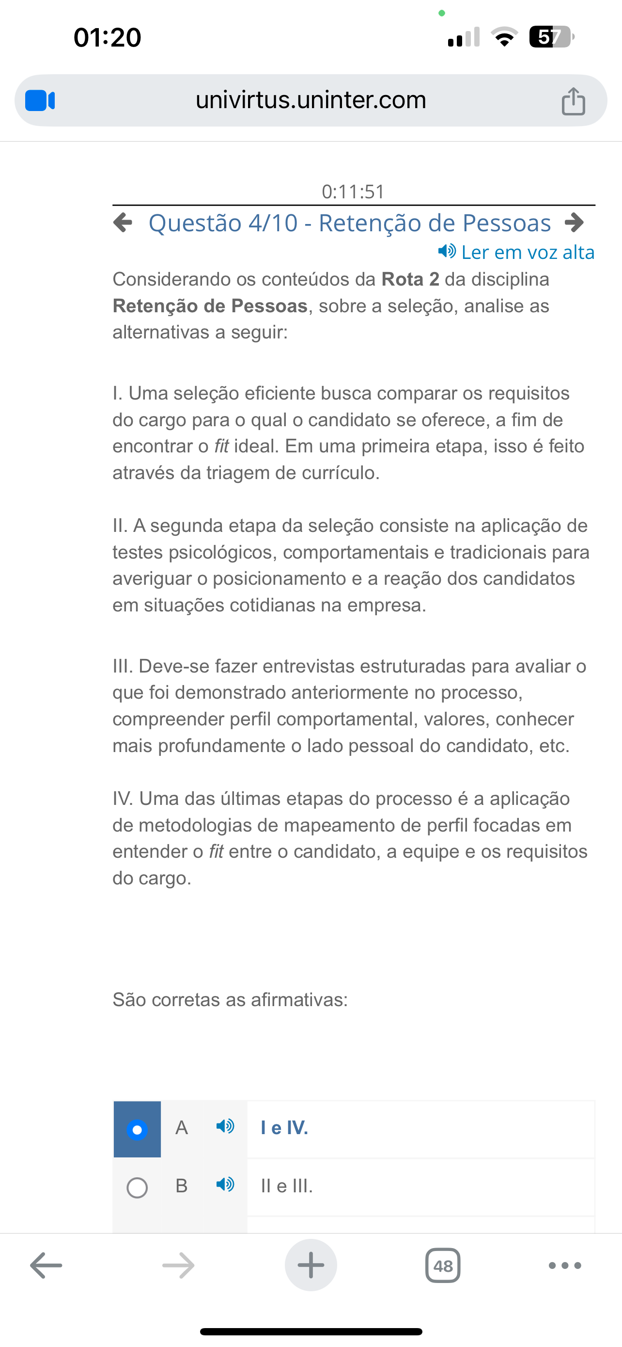 01:20 51 univirtus.uninter.com 0:11:51 Questão 4/10 - Retenção de Pessoas Ler em alta Considerando os conteúdos da Rota 2 da disciplina Retenção de Pessoas, sobre a seleção, analise as alternativas a seguir: I. Uma seleção eficiente busca comparar os requisitos do cargo para o qual o candidato se oferece, a fim de encontrar fit ideal. Em uma primeira etapa, isso é feito através da triagem de currículo. II. A segunda etapa da seleção consiste na aplicação de testes psicológicos, comportamentais e tradicionais para averiguar o posicionamento e a reação dos candidatos em situações cotidianas na empresa. III. Deve-se fazer entrevistas estruturadas para avaliar o que foi demonstrado anteriormente no processo, compreender perfil comportamental, valores, conhecer mais profundamente o lado pessoal do candidato, etc. IV. Uma das últimas etapas do processo é a aplicação de metodologias de mapeamento de perfil focadas em entender o fit entre o candidato, a equipe e os requisitos do cargo. São corretas as afirmativas: A I e IV. B + 48