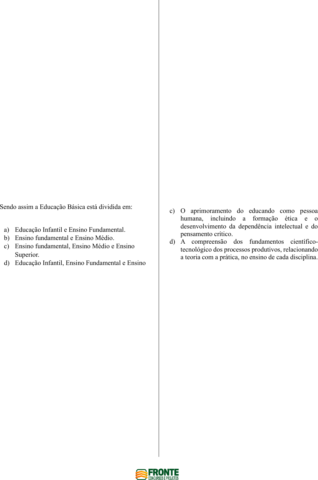 Questão 16 – Sobre o Projeto Político-Pedagógico, é correto dizer que: a) É elaborado com base em lei municipal, conforme a Constituição Federal de 1988. b) É elaborado com base em normas de gestão democrática e tem como princípio a participação de profissionais de educação, das comunidades escolar e local, além dos Conselhos e Fóruns Escolares ou equivalentes. c) É elaborado exclusivamente com base no Plano de Trabalho do docente, respeitada a autonomia profissional. d) É elaborado com base nas diretrizes escolares e submetido obrigatoriamente à votação discente. Questão 17 – A BNCC está estruturada de modo a explicitar as competências que os alunos devem desenvolver ao longo de toda a Educação Básica e em cada etapa da escolaridade, como expressão dos direitos de aprendizagem e desenvolvimento de todos os estudantes. Sendo assim a Educação Básica está dividida em: a) Educação Infantil e Ensino Fundamental. b) Ensino fundamental e Ensino Médio. c) Ensino fundamental, Ensino Médio e Ensino Superior. d) Educação Infantil, Ensino Fundamental e Ensino Médio. Questão 18 – João, estudante do 9º ano do Ensino Fundamental, precisará se ausentar da escola por 7 dias devido a questões religiosas, e com isso perderá prova. De acordo com a Lei de Diretrizes e Bases da Educação Nacional (LDB – Lei nº 9.394/1996), qual das opções abaixo está correta sobre como a escola deve proceder para garantir o cumprimento de suas obrigações educacionais? a) Prova ou aula de reposição, conforme o caso, a ser realizada em data alternativa, no turno de estudo do aluno ou em outro horário agendado com sua anuência expressa. b) Não é obrigada a repor a prova ou aula, já que é de responsabilidade de seus responsáveis. c) Agir de modo indiferente nessa situação. d) Prova ou aula de reposição, conforme o caso, a ser realizada em data estipulada, obrigatoriamente no turno de estudo do aluno. Questão 19 – De acordo com a Lei de Diretrizes e Bases da Educação Nacional (Lei nº 9394/1996), artigo 13, é dever do docente: a) Elaborar sozinho o Regimento Escolar. b) Participar da elaboração da proposta pedagógica do estabelecimento de ensino. c) Elaborar o calendário anual, quando determinado pela prefeitura. d) Elaborar o Plano Nacional de Educação, com auxílio de estagiários. Questão 20 – A LDB estabelece que o ensino médio, etapa final da educação básica, com duração mínima de três anos, terá como finalidades, exceto: a) A consolidação e o aprofundamento dos conhecimentos adquiridos no ensino fundamental, possibilitando o prosseguimento de estudos. b) A preparação básica para o trabalho e a cidadania do educando, para continuar aprendendo, de modo a ser capaz de se adaptar com flexibilidade a novas condições de ocupação ou aperfeiçoamento posteriores. c) O aprimoramento do educando como pessoa humana, incluindo a formação ética e o desenvolvimento da dependência intelectual e do pensamento crítico. d) A compreensão dos fundamentos científico- tecnológico dos processos produtivos, relacionando a teoria com a prática, no ensino de cada disciplina. Questão 21 – De acordo com o Estatuto da Criança e do Adolescente (ECA), considera-se adolescente aquela com idade entre: a) 10 e 18 anos. b) 12 e 18 anos. c) 13 e 18 anos. d) 12 e 21 anos. Questão 22 – Ao adolescente empregado, aprendiz, em regime familiar de trabalho, aluno de escola técnica, assistido em entidade governamental ou não- governamental, é vedado trabalho: a) Em todas as hipóteses. b) Nas hipóteses previstas expressamente na Constituição Federal de 1988. c) Noturno, realizado entre as vinte e duas horas de um dia e as cinco horas do dia seguinte. d) Noturno, realizado das 18h às 22h. Questão 23 – “É dever da___________, da ________, da sociedade em geral e do poder público assegurar, com absoluta prioridade, a efetivação dos direitos referentes à vida, à saúde, à alimentação, à educação, ao esporte, ao lazer, à profissionalização, à cultura, à dignidade, ao respeito, à liberdade e à convivência familiar e comunitária”. Os termos que completam corretamente as lacunas nesse trecho do ECA são: a) Família e comunidade. b) Comunidade e direção. c) Sociedade civil e Controladoria Geral da União. d) Escola pública e escola privada. Questão 24 – Segundo o Plano de Cargos e Carreiras do magistério Público Municipal de Costa Rica – MS (Lei Complementar n. 85, de 22 de outubro de 2019), a progressão funcional é a possibilidade de passagem do profissional do magistério para a classe subsequente, no mesmo nível de habilitação, observado o interstício de: a) 2 anos de efetivo exercício na classe em que estiver posicionado e o alcance de resultado satisfatório na avaliação de desempenho individual, na forma desta Lei. b) 3 anos de efetivo exercício na classe em que estiver posicionado e o alcance de resultado satisfatório na avaliação de desempenho individual, na forma desta Lei. c) 4 anos de efetivo exercício na classe em que estiver posicionado e o alcance de resultado satisfatório na avaliação de desempenho individual, na forma desta Lei. d) 5 anos de efetivo exercício na classe em que estiver posicionado e o alcance de resultado satisfatório na avaliação de desempenho individual, na forma desta Lei. Questão 25 – De acordo com a Lei Complementar nº 85, de 22 de outubro de 2019 que dispõe a reestruturação e gestão do Plano de Cargos e Carreira do Magistério Público do Município de Costa Rica, Estado de Mato Grosso do Sul, são níveis de habilitação da Carreira do magistério Público Municipal de Costa Rica – MS: a) Níveis I, II, III e IV. b) Níveis I, II, III, IV e V. c) Níveis I, II e III. d) Níveis I e II. Questão 26 – Os profissionais do magistério abrangidos pelo Plano de Cargos e Carreiras do magistério Público Municipal de Costa Rica terão preferênci