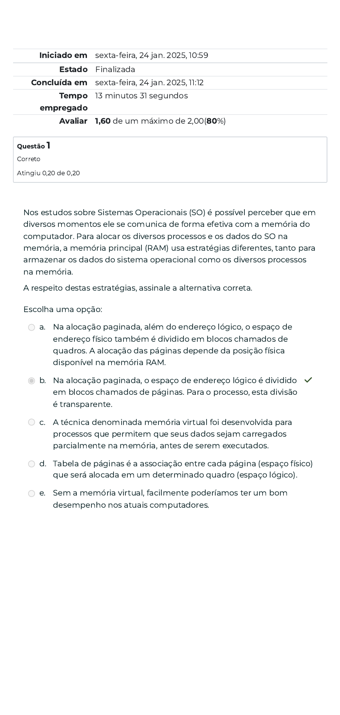 Iniciado em sexta-feira, 24 jan. 2025, 10:59 Estado Finalizada Concluída em sexta-feira, 24 jan. 2025, 11:12 Tempo empregado 13 minutos 31 segundos Avaliar 1,60 de um máximo de 2,00(80%) Questão 1 Correto Atingiu 0,20 de 0,20 Nos estudos sobre Sistemas Operacionais (SO) é possível perceber que em diversos momentos ele se comunica de forma efetiva com a memória do computador. Para alocar os diversos processos e os dados do SO na memória, a memória principal (RAM) usa estratégias diferentes, tanto para armazenar os dados do sistema operacional como os diversos processos na memória. A respeito destas estratégias, assinale a alternativa correta. Escolha uma opção: a. Na alocação paginada, além do endereço lógico, o espaço de endereço físico também é dividido em blocos chamados de quadros. A alocação das páginas depende da posição física disponível na memória RAM. b. Na alocação paginada, o espaço de endereço lógico é dividido em blocos chamados de páginas. Para o processo, esta divisão é transparente. ✓ c. A técnica denominada memória virtual foi desenvolvida para processos que permitem que seus dados sejam carregados parcialmente na memória, antes de serem executados. d. Tabela de páginas é a associação entre cada página (espaço físico) que será alocada em um determinado quadro (espaço lógico). e. Sem a memória virtual, facilmente poderíamos ter um bom desempenho nos atuais computadores. Questão 2 Incorreto Atingiu 0,00 de 0,20 Questão 3 Correto Atingiu 0,20 de 0,20 Sobre processo computacional ou simplesmente processo, é correto a�rmar que: Escolha uma opção: a. o estado de Execução (running) é a situação em que o processo está apto a utilizar o processador quando este estiver disponível. × b. processos paralelos são aqueles que ocorrem um de cada vez, um a um no tempo, serialmente, como que de forma exclusiva. c. quando um processo �naliza o uso de um recurso, o sistema operacional recolocará o processo na lista de processos em execução, através da transição denominada reativação ou Awake, o que faz com que o processo passe do estados Pronto para Bloqueado. d. um processo é um programa em execução, o que envolve o código do programa, os dados em uso, os registradores do processador, sua pilha (stack) e o contador de programa, além de outras informações relacionadas a sua execução. e. um processo é uma atividade que ocorre em meio computacional, usualmente possuindo um objetivo de�nido, tendo duração in�nita e utilizando uma quantidade limitada de recursos computacionais. Uma ligeira variação da ideia do micronúcleo é distinguir duas classes de processos, os servidores, que prestam algum serviço, e os clientes, que usam esses serviços. A A�rmação acima refere-se ao modelo: Escolha uma opção: a. Exonúcleos. b. Cliente-servidor. ✓ c. Operação de entrada e saída. d. Máquinas virtuais. e. Hardware & Software. Questão 4 Correto Atingiu 0,20 de 0,20 Em dado momento, um processo pode estar utilizando o processador ou esperando por isso. O esquema ilustrado na imagem a seguir foi criado por um analista de sistemas operacionais. Na �gura, cada elipse representa um estado distinto no qual um processo pode estar: De acordo com o exposto e analisando a ilustração apresentada, avalie as a�rmativas a seguir: I- Em execução (realmente usando a CPU naquele instante). II- Pronto (executável, temporariamente parado para deixar outro processo ser executado). III- Bloqueado (incapaz de ser executado até que algum evento externo aconteça). IV- Um processo que estava em execução e, em seguida, teve seu processamento interrompido por ação do escalonador de processos, deverá passar para o estado de “Em espera”. É correto o que se a�rma em: Escolha uma opção: a. I e II, apenas. b. I e IV, apenas. c. I, II, III apenas. ✓ d. I, III e IV, apenas. e. I e III, apenas. Questão 5 Incorreto Atingiu 0,00 de 0,20 Questão 6 Correto Atingiu 0,20 de 0,20 O processador é o dispositivo central de sistemas computacionais e é nele que ocorre a execução de processos e threads. Quando diversos processos concorrem pela utilização do processador, entra em cena o escalonador. Um Escalonador de Processos é responsável por decidir o momento em que cada processo obterá a CPU. É utilizado algoritmos de escalonamento que estabelecem a lógica de tal decisão. I – Um algoritmo de escalonamento tem a função de controlar o uso do processador pelos diversos programas de maneira a garantir que nenhum processo monopolize o processamento. II- Como o tempo de CPU é um recurso escasso nessas máquinas, um bom escalonador pode fazer uma grande diferença no desempenho percebido e satisfação do usuário. III- O escalonador não precisa se preocupar em fazer um uso e�ciente da CPU. IV- Um bom escalonador não faz grande diferença no desempenho percebido e satisfação do usuário É correto o que se a�rma em: Escolha uma opção: a. I e II apenas. b. I, III e IV, apenas. c. I, II, III apenas. × d. I e IV, apenas. e. I e III, apenas. “Parte física do computador. É tudo aquilo que pode ser tocado”. O Trecho acima da apostila refere-se a: Escolha uma opção: a. Hardware ✓ b. Aplicativos c. Periférico d. Memória e. Software Questão 7 Correto Atingiu 0,20 de 0,20 Questão 8 Correto Atingiu 0,20 de 0,20 Com relação ao conceito de Semáforos em sistemas operacionais, marque o item correto. Escolha uma opção: a. É garantido que uma vez que a operação de semáforo tenha começado, todos outro processo pode acessar o semáforo até que a operação tenha sido concluída ou bloqueada. b. A operação down em um semáforo confere para ver se o valor é maior do que 1. c. A operação up não incrementa o valor de um determinado semáforo. d. Semáforos são implementados no sistema operacional e não são considerados uma forma de comunicação entre processos. e. Semáforos s
