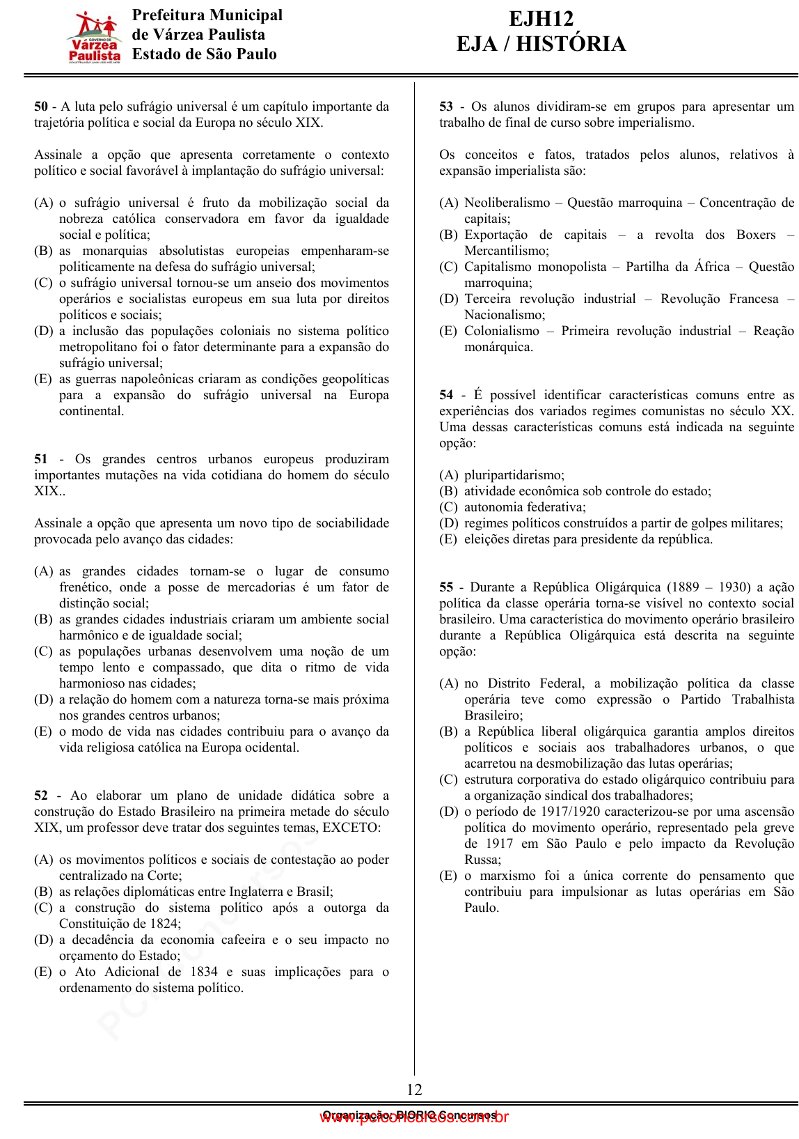 pcimarkpci MjgwNDowMTRjOjViYWU6ODBiMjo0ZjVhOmY1MTY6YzgzNDozOTJh:U3VuLCAyNiBKYW4gMjAyNSAxOToxMzoxNSAtMDMwMA== www.pciconcursos.com.br EJH12 EJA / HISTÓRIA 12 Organização: BIORIO Concursos Prefeitura Municipal de Várzea Paulista Estado de São Paulo 50 - A luta pelo sufrágio universal é um capítulo importante da trajetória política e social da Europa no século XIX. Assinale a opção que apresenta corretamente o contexto político e social favorável à implantação do sufrágio universal: (A) o sufrágio universal é fruto da mobilização social da nobreza católica conservadora em favor da igualdade social e política; (B) as monarquias absolutistas europeias empenharam-se politicamente na defesa do sufrágio universal; (C) o sufrágio universal tornou-se um anseio dos movimentos operários e socialistas europeus em sua luta por direitos políticos e sociais; (D) a inclusão das populações coloniais no sistema político metropolitano foi o fator determinante para a expansão do sufrágio universal; (E) as guerras napoleônicas criaram as condições geopolíticas para a expansão do sufrágio universal na Europa continental. 51 - Os grandes centros urbanos europeus produziram importantes mutações na vida cotidiana do homem do século XIX.. Assinale a opção que apresenta um novo tipo de sociabilidade provocada pelo avanço das cidades: (A) as grandes cidades tornam-se o lugar de consumo frenético, onde a posse de mercadorias é um fator de distinção social; (B) as grandes cidades industriais criaram um ambiente social harmônico e de igualdade social; (C) as populações urbanas desenvolvem uma noção de um tempo lento e compassado, que dita o ritmo de vida harmonioso nas cidades; (D) a relação do homem com a natureza torna-se mais próxima nos grandes centros urbanos; (E) o modo de vida nas cidades contribuiu para o avanço da vida religiosa católica na Europa ocidental. 52 - Ao elaborar um plano de unidade didática sobre a construção do Estado Brasileiro na primeira metade do século XIX, um professor deve tratar dos seguintes temas, EXCETO: (A) os movimentos políticos e sociais de contestação ao poder centralizado na Corte; (B) as relações diplomáticas entre Inglaterra e Brasil; (C) a construção do sistema político após a outorga da Constituição de 1824; (D) a decadência da economia cafeeira e o seu impacto no orçamento do Estado; (E) o Ato Adicional de 1834 e suas implicações para o ordenamento do sistema político. 53 - Os alunos dividiram-se em grupos para apresentar um trabalho de final de curso sobre imperialismo. Os conceitos e fatos, tratados pelos alunos, relativos à expansão imperialista são: (A) Neoliberalismo – Questão marroquina – Concentração de capitais; (B) Exportação de capitais – a revolta dos Boxers – Mercantilismo; (C) Capitalismo monopolista – Partilha da África – Questão marroquina; (D) Terceira revolução industrial – Revolução Francesa – Nacionalismo; (E) Colonialismo – Primeira revolução industrial – Reação monárquica. 54 - É possível identificar características comuns entre as experiências dos variados regimes comunistas no século XX. Uma dessas características comuns está indicada na seguinte opção: (A) pluripartidarismo; (B) atividade econômica sob controle do estado; (C) autonomia federativa; (D) regimes políticos construídos a partir de golpes militares; (E) eleições diretas para presidente da república. 55 - Durante a República Oligárquica (1889 – 1930) a ação política da classe operária torna-se visível no contexto social brasileiro. Uma característica do movimento operário brasileiro durante a República Oligárquica está descrita na seguinte opção: (A) no Distrito Federal, a mobilização política da classe operária teve como expressão o Partido Trabalhista Brasileiro; (B) a República liberal oligárquica garantia amplos direitos políticos e sociais aos trabalhadores urbanos, o que acarretou na desmobilização das lutas operárias; (C) estrutura corporativa do estado oligárquico contribuiu para a organização sindical dos trabalhadores; (D) o período de 1917/1920 caracterizou-se por uma ascensão política do movimento operário, representado pela greve de 1917 em São Paulo e pelo impacto da Revolução Russa; (E) o marxismo foi a única corrente do pensamento que contribuiu para impulsionar as lutas operárias em São Paulo. www.pciconcursos.com.br pcimarkpci MjgwNDowMTRjOjViYWU6ODBiMjo0ZjVhOmY1MTY6YzgzNDozOTJh:U3VuLCAyNiBKYW4gMjAyNSAxOToxMzoxNSAtMDMwMA== www.pciconcursos.com.br EJH12 EJA / HISTÓRIA 13 Organização: BIORIO Concursos Prefeitura Municipal de Várzea Paulista Estado de São Paulo 56 - A “Marcha para o Oeste” foi um dos capítulos da política de ocupação territorial do interior do Brasil conduzida pelo Estado Novo (1937-1945). Em relação a essa política de construção do Estado Nacional brasileiro é correto afirmar que: (A) a política de incentivo à ocupação do Centro-Oeste valorizava o trabalhador nacional; (B) o Estado Novo favoreceu uma política de incentivo à entrada de estrangeiros; (C) a construção de Brasília representou uma iniciativa ousada de Getúlio Vargas para a execução do projeto de ocupação do Centro-Oeste; (D) foi viabilizada graças ao encaminhamento da reforma agrária, que impulsionou o camponês a ocupar as terras do Centro-Oeste; (E) a política varguista articulava-se com proposta de criação de cidades industriais no Centro-Oeste. 57 - Os anos de 1960 e 1970 foram marcados por regimes militares na América Latina. Assinale a opção que apresenta o contexto histórico que deu origem aos regimes autoritários latino-americanos: (A) o fim do bloco soviético no Leste Europeu favoreceu a articulação de ações golpistas dos militares latino- americanos; (B) o medo da influência da Revolução Cubana mobilizou os setores políticos conservadores no apoio aos regimes auto