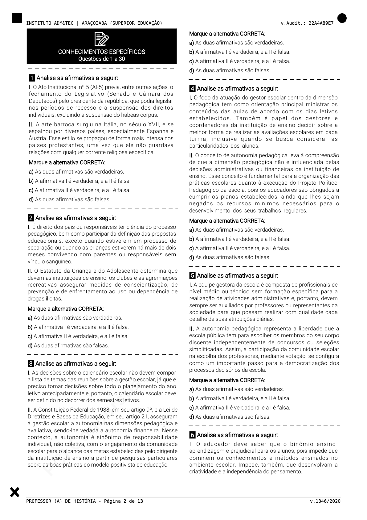 pcimarkpci MjgwNDowMTRjOjViYWU6ODBiMjo0ZjVhOmY1MTY6YzgzNDozOTJh:U3VuLCAyNiBKYW4gMjAyNSAxNjo0NToyMSAtMDMwMA== www.pciconcursos.com.br INSTITUTO ADM&TEC | ARAÇOIABA (SUPERIOR EDUCAÇÃO) v.Audit.: 22A4A89E7 PROFESSOR (A) DE HISTÓRIA - Página 2 de 13 v.1346/2020 CONHECIMENTOS ESPECÍFICOS Questões de 1 a 30 1 Analise as afirmativas a seguir: I. O Ato Institucional nº 5 (AI-5) previa, entre outras ações, o fechamento do Legislativo (Senado e Câmara dos Deputados) pelo presidente da república, que podia legislar nos períodos de recesso e a suspensão dos direitos individuais, excluindo a suspensão do habeas corpus. II. A arte barroca surgiu na Itália, no século XVII, e se espalhou por diversos países, especialmente Espanha e Áustria. Esse estilo se propagou de forma mais intensa nos países protestantes, uma vez que ele não guardava relações com qualquer corrente religiosa específica. Marque a alternativa CORRETA: a) As duas afirmativas são verdadeiras. b) A afirmativa I é verdadeira, e a II é falsa. c) A afirmativa II é verdadeira, e a I é falsa. d) As duas afirmativas são falsas. 2 Analise as afirmativas a seguir: I. É direito dos pais ou responsáveis ter ciência do processo pedagógico, bem como participar da definição das propostas educacionais, exceto quando estiverem em processo de separação ou quando as crianças estiverem há mais de dois meses convivendo com parentes ou responsáveis sem vínculo sanguíneo. II. O Estatuto da Criança e do Adolescente determina que devem as instituições de ensino, os clubes e as agremiações recreativas assegurar medidas de conscientização, de prevenção e de enfrentamento ao uso ou dependência de drogas ilícitas. Marque a alternativa CORRETA: a) As duas afirmativas são verdadeiras. b) A afirmativa I é verdadeira, e a II é falsa. c) A afirmativa II é verdadeira, e a I é falsa. d) As duas afirmativas são falsas. 3 Analise as afirmativas a seguir: I. As decisões sobre o calendário escolar não devem compor a lista de temas das reuniões sobre a gestão escolar, já que é preciso tomar decisões sobre todo o planejamento do ano letivo antecipadamente e, portanto, o calendário escolar deve ser definido no decorrer dos semestres letivos. II. A Constituição Federal de 1988, em seu artigo 9º, e a Lei de Diretrizes e Bases da Educação, em seu artigo 21, asseguram à gestão escolar a autonomia nas dimensões pedagógica e avaliativa, sendo-lhe vedada a autonomia financeira. Nesse contexto, a autonomia é sinônimo de responsabilidade individual, não coletiva, com o engajamento da comunidade escolar para o alcance das metas estabelecidas pelo dirigente da instituição de ensino a partir de pesquisas particulares sobre as boas práticas do modelo positivista de educação. Marque a alternativa CORRETA: a) As duas afirmativas são verdadeiras. b) A afirmativa I é verdadeira, e a II é falsa. c) A afirmativa II é verdadeira, e a I é falsa. d) As duas afirmativas são falsas. 4 Analise as afirmativas a seguir: I. O foco da atuação do gestor escolar dentro da dimensão pedagógica tem como orientação principal ministrar os conteúdos das aulas de acordo com os dias letivos estabelecidos. Também é papel dos gestores e coordenadores da instituição de ensino decidir sobre a melhor forma de realizar as avaliações escolares em cada turma, inclusive quando se busca considerar as particularidades dos alunos. II. O conceito de autonomia pedagógica leva à compreensão de que a dimensão pedagógica não é influenciada pelas decisões administrativas ou financeiras da instituição de ensino. Esse conceito é fundamental para a organização das práticas escolares quanto à execução do Projeto Político- Pedagógico da escola, pois os educadores são obrigados a cumprir os planos estabelecidos, ainda que lhes sejam negados os recursos mínimos necessários para o desenvolvimento dos seus trabalhos regulares. Marque a alternativa CORRETA: a) As duas afirmativas são verdadeiras. b) A afirmativa I é verdadeira, e a II é falsa. c) A afirmativa II é verdadeira, e a I é falsa. d) As duas afirmativas são falsas. 5 Analise as afirmativas a seguir: I. A equipe gestora da escola é composta de profissionais de nível médio ou técnico sem formação específica para a realização de atividades administrativas e, portanto, devem sempre ser auxiliados por professores ou representantes da sociedade para que possam realizar com qualidade cada detalhe de suas atribuições diárias. II. A autonomia pedagógica representa a liberdade que a escola pública tem para escolher os membros do seu corpo discente independentemente de concursos ou seleções simplificadas. Assim, a participação da comunidade escolar na escolha dos professores, mediante votação, se configura como um importante passo para a democratização dos processos decisórios da escola. Marque a alternativa CORRETA: a) As duas afirmativas são verdadeiras. b) A afirmativa I é verdadeira, e a II é falsa. c) A afirmativa II é verdadeira, e a I é falsa. d) As duas afirmativas são falsas. 6 Analise as afirmativas a seguir: I . O educador deve saber que o binômio ensino- aprendizagem é prejudicial para os alunos, pois impede que dominem os conhecimentos e métodos ensinados no ambiente escolar. Impede, também, que desenvolvam a criatividade e a independência do pensamento. pcimarkpci MjgwNDowMTRjOjViYWU6ODBiMjo0ZjVhOmY1MTY6YzgzNDozOTJh:U3VuLCAyNiBKYW4gMjAyNSAxNjo0NToyMSAtMDMwMA== www.pciconcursos.com.br INSTITUTO ADM&TEC | ARAÇOIABA (SUPERIOR EDUCAÇÃO) v.Audit.: 22A4A89E7 PROFESSOR (A) DE HISTÓRIA - Página 3 de 13 v.1346/2020 II. O educador deve dispor o contato dos alunos com objetos e situações, problematizando-os de modo que o educando seja impedido de ter acesso a novos conteúdos e possa elaborar respostas aos problemas suscitados, elaborando conhecimento de forma crítica, criativa e pouco significativa. Marque a alternativ