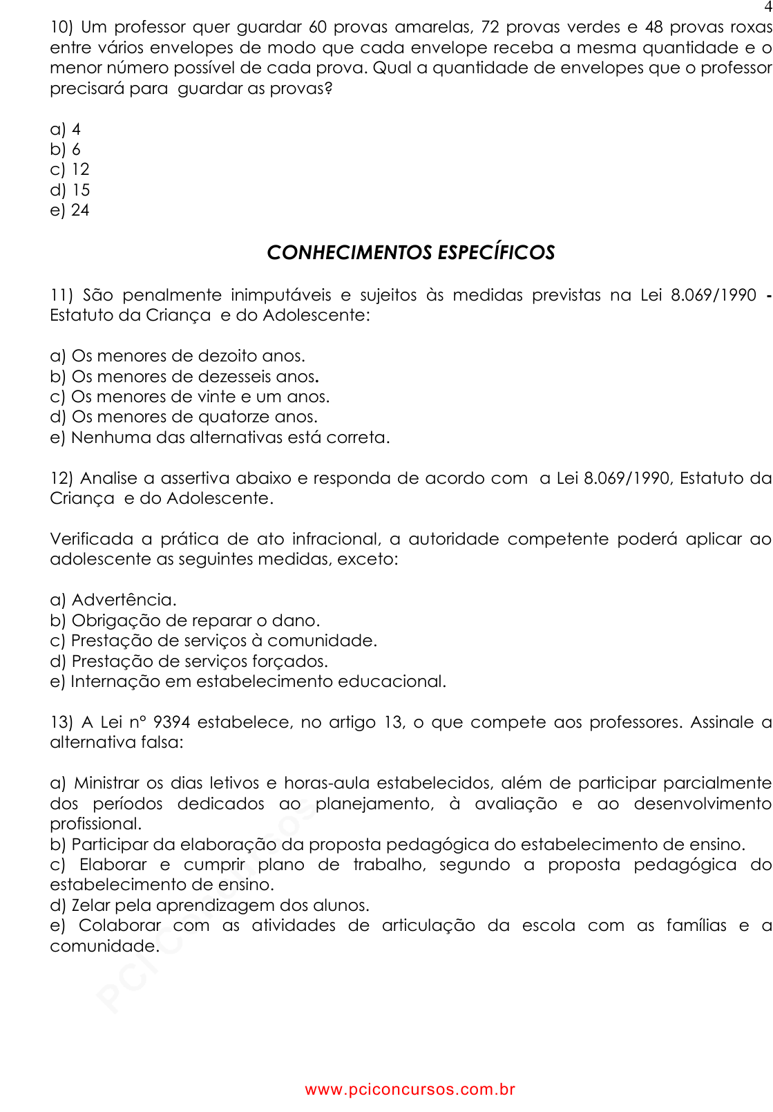 pcimarkpci MjgwNDowMTRjOjViYWU6ODBiMjo0ZjVhOmY1MTY6YzgzNDozOTJh:U3VuLCAyNiBKYW4gMjAyNSAxNzo1MDo1MyAtMDMwMA== www.pciconcursos.com.br 4 10) Um professor quer guardar 60 provas amarelas, 72 provas verdes e 48 provas roxas entre vários envelopes de modo que cada envelope receba a mesma quantidade e o menor número possível de cada prova. Qual a quantidade de envelopes que o professor precisará para guardar as provas? a) 4 b) 6 c) 12 d) 15 e) 24 CONHECIMENTOS ESPECÍFICOS 11) São penalmente inimputáveis e sujeitos às medidas previstas na Lei 8.069/1990 - Estatuto da Criança e do Adolescente: a) Os menores de dezoito anos. b) Os menores de dezesseis anos. c) Os menores de vinte e um anos. d) Os menores de quatorze anos. e) Nenhuma das alternativas está correta. 12) Analise a assertiva abaixo e responda de acordo com a Lei 8.069/1990, Estatuto da Criança e do Adolescente. Verificada a prática de ato infracional, a autoridade competente poderá aplicar ao adolescente as seguintes medidas, exceto: a) Advertência. b) Obrigação de reparar o dano. c) Prestação de serviços à comunidade. d) Prestação de serviços forçados. e) Internação em estabelecimento educacional. 13) A Lei n° 9394 estabelece, no artigo 13, o que compete aos professores. Assinale a alternativa falsa: a) Ministrar os dias letivos e horas-aula estabelecidos, além de participar parcialmente dos períodos dedicados ao planejamento, à avaliação e ao desenvolvimento profissional. b) Participar da elaboração da proposta pedagógica do estabelecimento de ensino. c) Elaborar e cumprir plano de trabalho, segundo a proposta pedagógica do estabelecimento de ensino. d) Zelar pela aprendizagem dos alunos. e) Colaborar com as atividades de articulação da escola com as famílias e a comunidade. www.pciconcursos.com.br pcimarkpci MjgwNDowMTRjOjViYWU6ODBiMjo0ZjVhOmY1MTY6YzgzNDozOTJh:U3VuLCAyNiBKYW4gMjAyNSAxNzo1MDo1MyAtMDMwMA== www.pciconcursos.com.br 5 14) A Lei de Diretrizes e Bases da Educação Nacional disciplina, no Título VI, sobre a formação dos profissionais da educação. Analise as afirmativas: I - A formação docente, exceto para a educação superior, incluirá prática de ensino de, no mínimo, trezentas horas. II - Os sistemas de ensino promoverão a valorização dos profissionais da educação, assegurando-lhes, inclusive nos termos dos estatutos e dos planos de carreira do magistério público. III - A experiência docente não é pré-requisito para o exercício de quaisquer outras funções do magistério, nos termos das normas de cada sistema de ensino. IV - A formação de profissionais da educação, de modo a atender aos objetivos dos diferentes níveis e modalidades de ensino e as características de cada fase do desenvolvimento do educando terá como fundamentos: a associação entre teoria de práticas, inclusive mediante a capacitação em serviço e aproveitamento da formação e experiências anteriores em instituições de ensino e outras atividades. V - A formação de docentes para atuar na educação básica far-se-á em nível superior, em curso de licenciatura plena, em universidades e institutos superiores de educação, admitida, como formação mínima para o exercício do magistério na educação infantil e nas quatro séries iniciais do ensino fundamental, a oferecida em nível médio, na modalidade. Assinale a alternativa correta: a) Estão corretas apenas as afirmativas I, II e III. b) Está incorreta apenas a afirmativa III. c) Estão corretas apenas as afirmativas I, II, III e V. d) Estão corretas apenas as afirmativas I, II, III, IV e V. e) Todas as afirmativas estão incorretas. 15) Assinale a alternativa incorreta. De acordo com o Art. 3º da LDB/96, o ensino será ministrado com base nos seguintes princípios: I - igualdade de condições para o acesso e permanência na escola; II - liberdade de aprender, ensinar, pesquisar e divulgar a cultura, o pensamento, a arte e o saber; III - pluralismo de ideias e de concepções determinadas pelo MEC; IV - respeito à liberdade e apreço à tolerância; V - coexistência de instituições públicas e privadas de ensino; VI - gratuidade do ensino público em estabelecimentos oficiais; VII - valorização do profissional da educação escolar; VIII - gestão democrática do ensino público com eleição dos diretores da escola. IX - garantia de padrão de qualidade; X - valorização da experiência extraescolar; XI - vinculação entre a educação escolar, o trabalho e as práticas sociais. Assinale a alternativa correta: a) Todos os itens estão corretos. b) Todos os itens estão incorretos. c) Apenas os itens I, II, III, IV, V, VI estão incorretos. d) Apenas os itens VII, IX, X e XI estão incorretos. e) Apenas os itens os itens III e VIII incorretos. www.pciconcursos.com.br