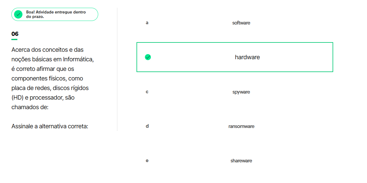 Boa! Atividade entregue dentro do prazo. a software 06 Acerca dos conceitos e das noções básicas em Informática, hardware é correto afirmar que os componentes físicos, como placa de redes, discos rígidos c spyware (HD) e processador, são chamados de: Assinale a alternativa correta: d ransomware e shareware