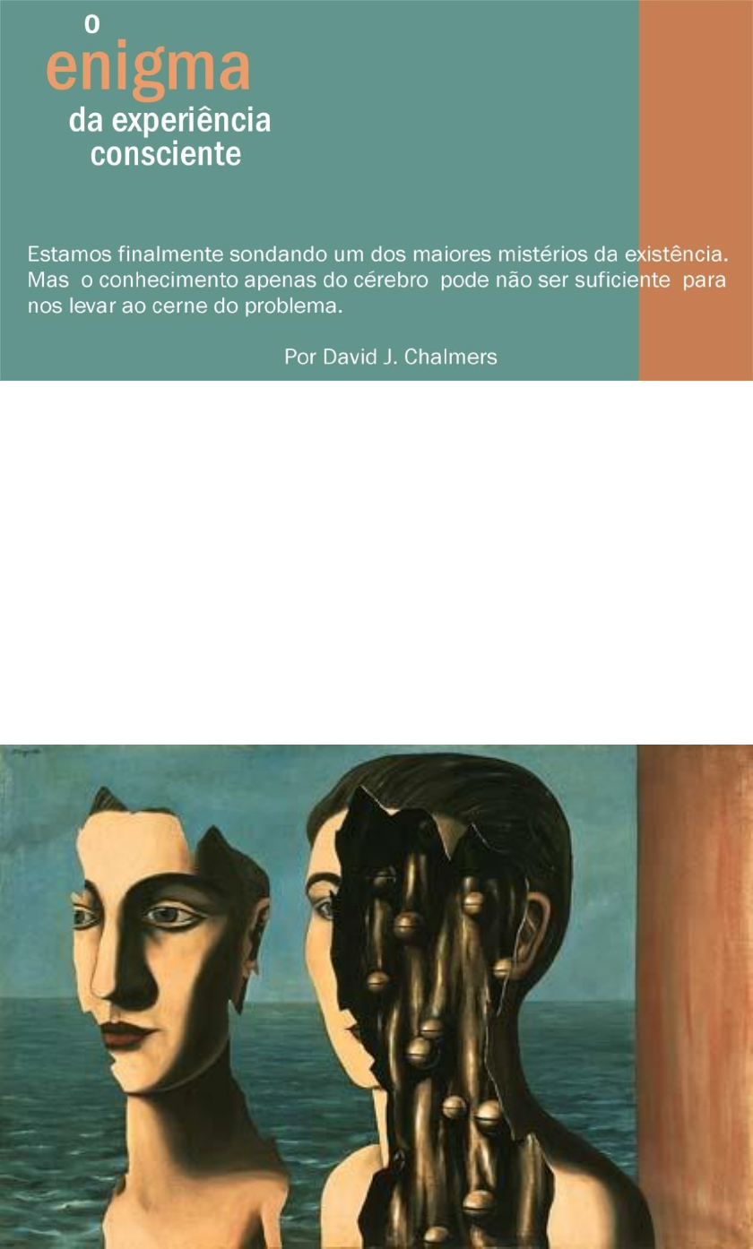 Original: CHALMERS, DAVID JOHN (1995). “The puzzle of conscious experience”. Scientific American 273(6): 80-86 (dezembro). Reimpressão, com nova diagramação e pintura do Magritte , disponível online em: http://consc.net/papers/puzzle.pdf . O presente texto é uma reimpressão, com pequenas modificações, da tradução feita em 2004 por Luís M.S. Augusto (Inst. de Filosofia, Universidade do Porto), em: http://criticanarede.com/ docs/chalmers.pdf. Outra versão em português: “O enigma da consciência”. Scientific American Brasil Especial 4, Segredos da Mente, junho 2004, p. 40-49. Há também uma versão abreviada em: BonJour, L. & Baker, A. (orgs.) (2010). Filosofia: textos fundamentais comentados. Trad. M.C. Santos Rocha et al. Porto Alegre: Artmed, pp. 260-5. Reimpressão preparada por Osvaldo Pessoa Jr. para a disciplina TCFC III – Filosofia das Ciências Neurais, FFLCH-USP, São Paulo, 2018. A paginação da versão original está indicada no texto, entre colchetes. René Magritte, Le double secret (1927) 1 Consciência, a experiência subjetiva do eu interior, constitui um dos maiores desafios da neurociência. Mesmo um conhecimento detalhado do funcionamento do cérebro e dos correlatos neurais da consciência pode não conseguir explicar como ou por que os seres humanos têm mentes conscientes de si e do mundo. [80] experiência consciente é ao mesmo tempo a coisa que melhor conhecemos no mundo e a mais misteriosa. Não há nada que conheçamos de forma mais direta do que a consciência, mas é incrivelmente difícil conciliá-la com o resto dos nossos conhecimentos. Por que é que existe? O que faz? Como é possível que nasça de processos neuronais no cérebro? Estas são algumas das questões mais intrigantes de toda a ciência. De um ponto de vista objetivo, o cérebro é compreendido de forma razoável. Quando o leitor olha para esta página, um turbilhão de processamentos tem lugar: fótons atingem a sua retina, sinais elétricos são transmitidos para o seu nervo óptico e entre diferentes áreas do seu cérebro. Você pode até responder com um sorriso, com um semblante de perplexidade ou com um comentário qualquer. Mas há também um aspecto subjetivo. Quando o leitor olha para a página, está consciente dela, vivenciando [experiencing] diretamente as imagens e as palavras como parte da sua vida mental privada. Tem impressões vívidas das cores e das formas das imagens. Ao mesmo tempo, pode estar sentindo algumas emoções e formando alguns pensamentos. Todas juntas essas experiências constituem a consciência: a vida interior, subjetiva, da mente. Durante muitos anos, os investigadores do cérebro e da mente evitaram deliberadamente a consciência. A visão predominante era a de que a ciência, dependente da objetividade, não podia incluir algo tão subjetivo como a consciência. O movimento behaviorista na psicologia, dominante em boa parte do século XX, concentrou-se no comportamento exterior e excluiu qualquer menção a processos mentais internos. Mais tarde, o desenvolvimento das ciências cognitivas focou a atenção nos processos que ocorrem no interior da cabeça. Contudo, a consciência continuava fora de alcance, prestando-se somente a ser um assunto de discussões pela noite afora por entre copos. Nos últimos anos, contudo, um número cada vez maior de neurocientistas, psicólogos e filósofos tem rejeitado a ideia de que a consciência não pode ser estudada e está agora tentando explorar os seus segredos. Como é de esperar de uma área tão recente, deparamo-nos com um emaranhado de teorias diferentes e antagônicas, as quais por vezes se servem dos mesmos conceitos básicos de formas incompatíveis. Para ajudar a desemaranhar este problema é fundamental o raciocínio filosófico. A multiplicidade de perspectivas dentro deste campo estende-se desde as teorias reducionistas, segundo as quais a consciência pode ser explicada pelos métodos convencionais da neurociência e da psicologia, até as posições chamadas “misterianas” [mysterians], que afirmam que jamais chegaremos a compreender a consciência. Penso que uma análise aturada pode mostrar que ambas as posições estão erradas e que a verdade se encontra em algum lugar a meio caminho entre ambas. Contra o reducionismo argumentarei que os instrumentos das neurociências não podem fornecer uma descrição completa da experiência consciente, apesar do muito que têm para oferecer. Contra os misterianos defenderei que a consciência pode ser explicada por um novo tipo de teoria. Os pormenores de uma tal teoria ainda não estão disponíveis, mas um raciocínio cuidadoso e inferências bem feitas podem revelar algo sobre a sua natureza geral. Por exemplo, uma tal teoria envolverá provavelmente novas leis fundamentais e o conceito de informação pode vir a desempenhar um papel central. A 2 Esta luz no fim do túnel sugere que a teoria da consciência pode vir a ter consequências espantosas no que diz respeito à nossa visão do universo e de nós próprios. O Problema Difícil s pesquisadores usam a palavra “consciência” de muitas maneiras diferentes. De modo a esclarecer a questão, temos que primeiramente separar os problemas que se encontram geralmente associados sob o manto deste substantivo. Para tal penso que é útil distinguirmos entre os “problemas fáceis” e o “problema difícil” [hard problem] da consciência. [81] Os problemas fáceis não são de maneira alguma triviais – pelo contrário, representam um desafio tão grande quanto a maioria dos problemas da psicologia e da biologia – mas é no problema difícil que se encontra o principal mistério. Entre os problemas fáceis da consciência incluem-se os seguintes: Como pode um sujeito humano discriminar estímulos sensoriais e reagir a eles de forma apropriada? Como é que o cérebro integra informação de muitas fontes diferentes e usa essa informação para controlar o comportamento? C