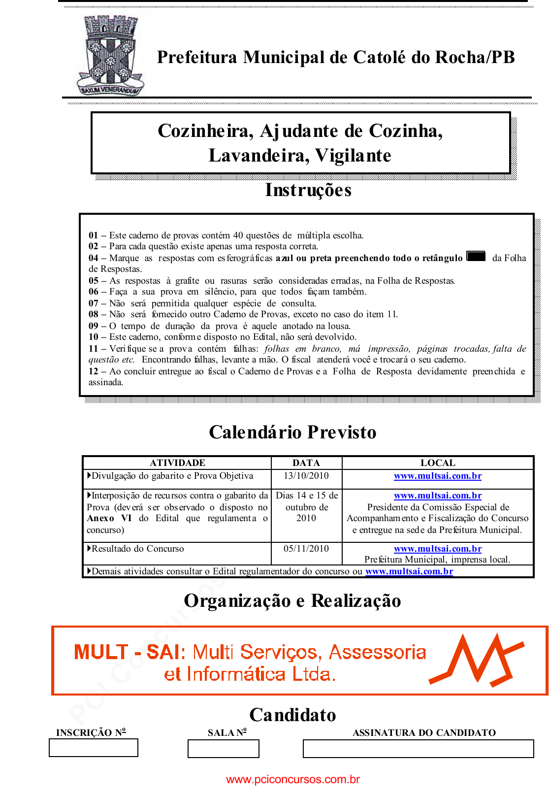 pcimarkpci MDAwMDowMDAwOjAwMDA6MDAwMDowMDAwOmZmZmY6OTU0ZTpiYTc5:U3VuLCAwMiBGZWIgMjAyNSAwMzoyMDowOSAtMDMwMA== www.pciconcursos.com.br Instruções Calendário Previsto ATIVIDADE DATA LOCAL �Divulgação do gabarito e Prova Objetiva 13/10/2010 www.multsai.com.br �Interposição de recursos contra o gabarito da Prova (deverá ser observado o disposto no Anexo VI do Edital que regulamenta o concurso) Dias 14 e 15 de outubro de 2010 www.multsai.com.br Presidente da Comissão Especial de Acompanhamento e Fiscalização do Concurso e entregue na sede da Prefeitura Municipal. �Resultado do Concurso 05/11/2010 www.multsai.com.br Prefeitura Municipal, imprensa local. �Demais atividades consultar o Edital regulamentador do concurso ou www.multsai.com.br Organização e Realização Candidato INSCRIÇÃO No SALA No ASSINATURA DO CANDIDATO Prefeitura Municipal de Catolé do Rocha/PB Cozinheira, Ajudante de Cozinha, Lavandeira, Vigilante 01 – Este caderno de provas contém 40 questões de múltipla escolha. 02 – Para cada questão existe apenas uma resposta correta. 04 – Marque as respostas com esferográficas azul ou preta preenchendo todo o retângulo da Folha de Respostas. 05 – As respostas à grafite ou rasuras serão consideradas erradas, na Folha de Respostas. 06 – Faça a sua prova em silêncio, para que todos façam também. 07 – Não será permitida qualquer espécie de consulta. 08 – Não será fornecido outro Caderno de Provas, exceto no caso do item 11. 09 – O tempo de duração da prova é aquele anotado na lousa. 10 – Este caderno, conforme disposto no Edital, não será devolvido. 11 – Veri fique se a prova contém falhas: folhas em branco, má impressão, páginas trocadas, falta de questão etc. Encontrando falhas, levante a mão. O fiscal atenderá você e trocará o seu caderno. 12 – Ao concluir entregue ao fiscal o Caderno de Provas e a Folha de Resposta devidamente preenchida e assinada. www.pciconcursos.com.br pcimarkpci MDAwMDowMDAwOjAwMDA6MDAwMDowMDAwOmZmZmY6OTU0ZTpiYTc5:U3VuLCAwMiBGZWIgMjAyNSAwMzoyMDowOSAtMDMwMA== www.pciconcursos.com.br Questões de 01 a 15 = Português. ►Leia, com atenção, os textos abaixo para responder às questões de 01 a 11. Texto I Texto II 01- Os dois textos têm como principal objetivo: A) Apenas informar a população sobre um problema; B) Alertar a população sobre um problema; C) Solucionar um problema; D) Apenas apresentar idéias sobre um problema. 02- Em “... se os atuais padrões de consumo e tratamento se mantiverem, duas em cada três pessoas no mundo vão sofrer com uma escassez de água moderada ou grave” (Texto I), explora-se a idéia de: A) Certeza; B) Segurança; C) Possibilidade; D) Indiferença. 03- De acordo com o Texto I, a Organização das Nações Unidas (ONU) tem uma preocupação que será refletida, principalmente: A) Num tempo presente; B) Num tempo passado; C) Num tempo futuro; D) Num tempo indeterminado. 04- Nas frases “Não desperdice água nem dinheiro lavando a calçada” e “Feche a torneira enquanto escova os dentes”, os tempos verbais transmitem um(a): A) Conselho; B) Ordem; C) Exagero; D) Hipótese. 05- De acordo com o Texto II, consumidor consciente é aquele que: A) Não se preocupa com problemas ambientais; B) Economiza água; C) Gasta menos dinheiro; D) Economiza bastante com produtos de limpeza. 06- ESCASSEZ, no Texto I, só NÃO significa: A) Pouco; B) Carência; C) Falta; D) Abundância. 07- Em “...não tem acesso à água potável” (Texto I), a palavra sublinhada signi fica: A) Que não pode ser consumida; B) Que pode ser consumida; C) Que está em falta; D) Que contém impurezas. 08- As palavras POPULAÇÃO, MUNDIAL e SEXTO (Texto I) são classificadas, respectivamente, como: A) Adjetivo, substantivo e numeral; B) Substantivo, substantivo e numeral; C) Substantivo, adjetivo e numeral; D) Numeral, adjetivo e numeral. 09- Assinale a ÚNICA palavra, transcrita do Texto II, que NÃO é polissílaba: A) Sanitário; B) Ensaboar; C) Desperdice; D) Torneira. 10- Das palavras transcritas dos Textos I e II, assinale a ÚNICA que não é paroxítona: A) Bilhão; B) Potável; C) Água; D) Sanitário. 11- Das palavras transcritas do texto II, assinale aquela que apresenta separação silábica correta: A) Sa-ni-tá-rio; B) Man-guei-ra; C) Ne-ce-ssá-rio; D) Ba-nho. ►Observe a tirinha abaixo para responder às questões de 12 a 15. 12- Pode-se deduzir, pela tirinha, que o personagem que está falando, é: A) Compreensivo; B) Generoso; C) Atencioso; D) Interesseiro. 13- Na tirinha, a plateia, diante do personagem que fala, demonstra: A) Admiração; B) Espanto; C) Alegria; D) Tristeza. 14- A frase, do último quadrinho da tirinha, é: A) Afirmativa; B) Negativa; C) Exclamativa; D) Interrogativa. 15- Em “...com você que está aí na plateia”, a palavra, em destaque, é: A) Monossílaba; B) Dissílaba; C) Trissílaba; D) Polissílaba. www.pciconcursos.com.br pcimarkpci MDAwMDowMDAwOjAwMDA6MDAwMDowMDAwOmZmZmY6OTU0ZTpiYTc5:U3VuLCAwMiBGZWIgMjAyNSAwMzoyMDowOSAtMDMwMA== www.pciconcursos.com.br Questões de 16 a 30 = Matemática. 16- Dada a sequência (9, 16, 23, 30, 37, ...). O próximo número da sucessão numérica é igual a: A) 42; B) 43; C) 44; D) 45. 17- O triplo de 27, somado com a décima parte de 1.000, resulta em: A) 180; B) 181; C) 182; D) N.A.A. 18- Um retângulo tem área de 126 cm². Sabendo-se que a sua base mede 14 cm, o seu perímetro é igual a: A) 14 cm; B) 46 cm; C) 63 cm; D) N.A.A. 19- Mário comprou um gelágua à vista por um valor de R$ 390,00, com um desconto de 22%. Qual o valor do gelágua sem esse desconto? A) R$ 500,00; B) R$ 480,00; C) R$ 460,00; D) R$ 458,00. 20- Dada a expressão algébrica: E = 2x² - 5y. Para x = 8 e y = 7, o valor de E, será igual a: A) 42; B) 53; C) 76; D) 93. 21- Uma caixa de leite condensado com 395g, custa R$ 2,95. Isadora Precisou comprar 7 caixas para fazer uma sobremesa para suas amigas. O valor pago por Isadora em 