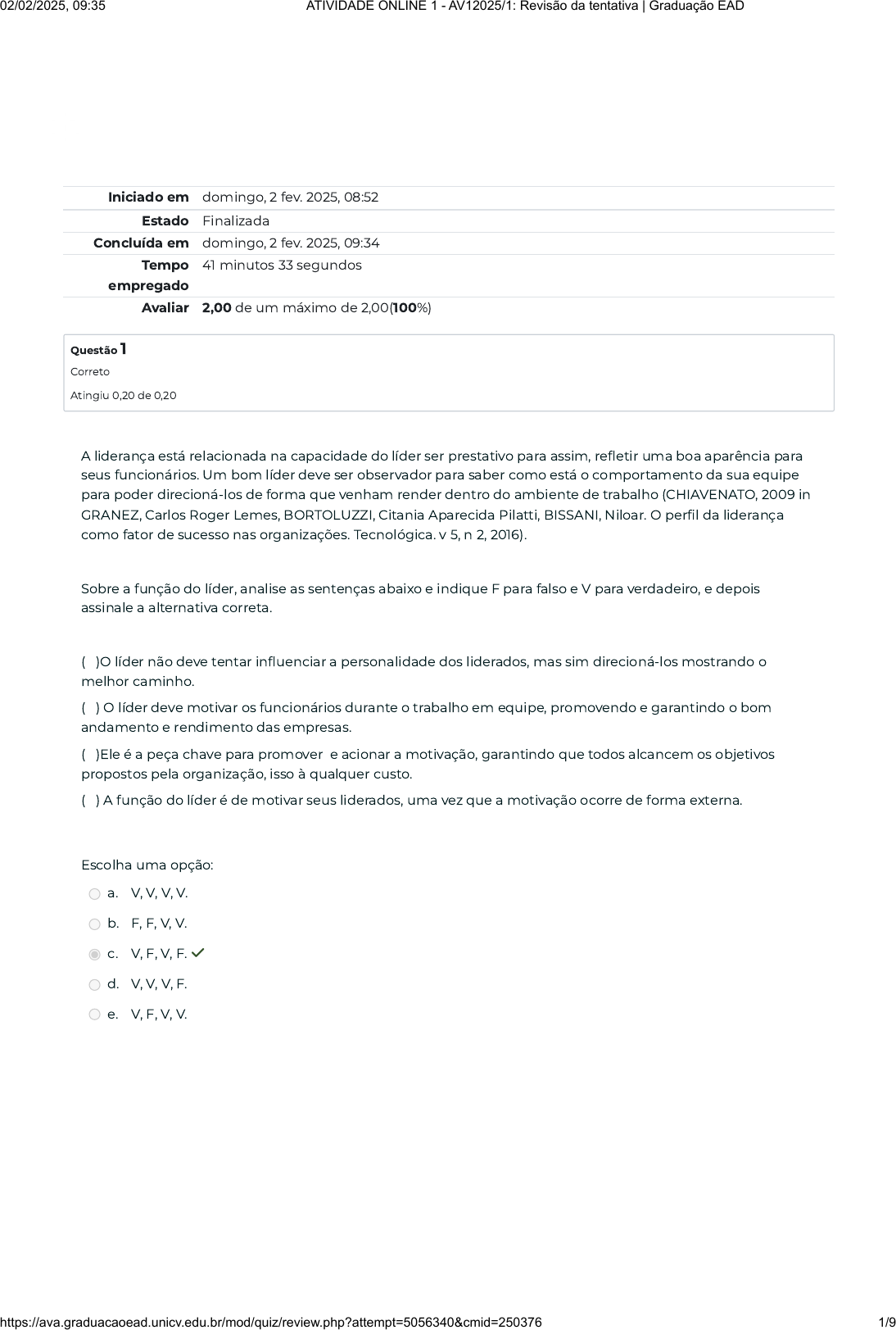 Iniciado em domingo, 2 fev. 2025, 08:52 Estado Finalizada Concluída em domingo, 2 fev. 2025, 09:34 Tempo empregado 41 minutos 33 segundos Avaliar 2,00 de um máximo de 2,00(100%) Questão 1 Correto Atingiu 0,20 de 0,20 A liderança está relacionada na capacidade do líder ser prestativo para assim, refletir uma boa aparência para seus funcionários. Um bom líder deve ser observador para saber como está o comportamento da sua equipe para poder direcioná-los de forma que venham render dentro do ambiente de trabalho (CHIAVENATO, 2009 in GRANEZ, Carlos Roger Lemes, BORTOLUZZI, Citania Aparecida Pilatti, BISSANI, Niloar. O perfil da liderança como fator de sucesso nas organizações. Tecnológica. v 5, n 2, 2016). Sobre a função do líder, analise as sentenças abaixo e indique F para falso e V para verdadeiro, e depois assinale a alternativa correta. ( )O líder não deve tentar influenciar a personalidade dos liderados, mas sim direcioná-los mostrando o melhor caminho. ( ) O líder deve motivar os funcionários durante o trabalho em equipe, promovendo e garantindo o bom andamento e rendimento das empresas. ( )Ele é a peça chave para promover e acionar a motivação, garantindo que todos alcancem os objetivos propostos pela organização, isso à qualquer custo. ( ) A função do líder é de motivar seus liderados, uma vez que a motivação ocorre de forma externa. Escolha uma opção: a. V, V, V, V. b. F, F, V, V. c. V, F, V, F. ✓ d. V, V, V, F. e. V, F, V, V. 02/02/2025, 09:35 ATIVIDADE ONLINE 1 - AV12025/1: Revisão da tentativa | Graduação EAD https://ava.graduacaoead.unicv.edu.br/mod/quiz/review.php?attempt=5056340&cmid=250376 1/9 Questão 2 Correto Atingiu 0,20 de 0,20 As dificuldades de comunicação e de chegar a um consenso sobre um assunto específico se tornam verdadeiras barreiras no relacionamento. Quando as pessoas não cedem ou não reconhecem seus equívocos, é preciso interferir para resolver a questão e afetar o mínimo possível os resultados da empresa. Assim é possível identificar alguns benefícios em ter uma equipe saudável e unida. Leia as sentenças abaixo, considerando quais retratam assertivamente sobre estes benefícios. I - Colaboradores com sentimento de pertencimento estão mais propensos a ser engajados e produtivos. II - Querer fazer certo e crescer individualmente nos projetos e idéias, mantendo um diálogo e colaboração. III - O princípio de coletividade é fundamental para um ambiente livre de conflito. IV - Ter uma automotivação, onde cada sujeito se percebe fiel e pertencente, a fim de obter um alto turnover. Escolha uma opção: a. I e II estão corretos. b. I e III estão corretos. ✓ c. III e IV estão corretos. d. I e IV estão corretos. e. II e IV estão corretos. 02/02/2025, 09:35 ATIVIDADE ONLINE 1 - AV12025/1: Revisão da tentativa | Graduação EAD https://ava.graduacaoead.unicv.edu.br/mod/quiz/review.php?attempt=5056340&cmid=250376 2/9 Questão 3 Correto Atingiu 0,20 de 0,20 A motivação pode ser conceituada, inicialmente, como aquilo que impulsiona uma pessoa a realizar determinada tarefa, a agir de determinada forma ou ter certo comportamento. E este impulso pode vir de um estímulo interno (intrínseco) ou externo (extrínseco) do ambiente em que o indivíduo vive. E a motivação envolve alguns fenômenos, tais como: emocionais, biológicos e sociais, sendo assim um processo que direciona o comportamento humano para o cumprimento de determinados objetivos. Leia as afirmações abaixo e responda o que se pede. AFIRMATIVA I Motivado não deve ser confundido com situações em que se experimentam momentos de alegria, de entusiasmo e bem-estar ou de euforia. AFIRMATIVA II A motivação possui três propriedades que a regem, uma é a direção, o foco da pessoa em sua meta e como realizar, outra é a intensidade. Escolha uma opção: a. A alternativa I e II estão corretas, sendo que a II justifica a I. b. A alternativa I está errada e a alternativa II correta. c. A alternativa I e II estão erradas. d. A alternativa I está correta e a alternativa II está errada. e. A alternativa I e II estão corretas, sendo que a II não justifica a I. ✓ 02/02/2025, 09:35 ATIVIDADE ONLINE 1 - AV12025/1: Revisão da tentativa | Graduação EAD https://ava.graduacaoead.unicv.edu.br/mod/quiz/review.php?attempt=5056340&cmid=250376 3/9 Questão 4 Correto Atingiu 0,20 de 0,20 No mundo contemporâneo do trabalho existem três fatores críticos segundo Muchinsky (2004): a grande quantidade de informações e opções de conhecimentos, a educação e treinamento dos gestores e as atividades de trabalho que estão mudando de forma rápida (AVILA, Robson Nery; COUTO, Sabrina Valverdade. A importância do trabalho em equipe: uma revisão de literatura. Faculdade Católica, 2013). Considerando os fatores, relacione eles com seus conceitos e depois assinale a alternativa correta. 1 - Grande quantidade de informações 2 - Educação e treinamento 3 - Mudança nas atividades de trabalho. ( ) Executivos mais qualificados e dispostos a atender as exigências do trabalho em equipe. ( ) as equipes recebe e adaptam as condições de trabalho que estão em mudanças. ( ) Informações de diversas pessoas que devem ser processadas a favor das questões do trabalho. Escolha uma opção: a. 2, 3, 1. ✓ b. 3, 1, 2. c. 2, 1, 3. d. 3, 2, 1. e. 1, 2, 3. 02/02/2025, 09:35 ATIVIDADE ONLINE 1 - AV12025/1: Revisão da tentativa | Graduação EAD https://ava.graduacaoead.unicv.edu.br/mod/quiz/review.php?attempt=5056340&cmid=250376 4/9 Questão 5 Correto Atingiu 0,20 de 0,20 Existem vários tipos de líderes, um bom líder é aquele que consegue bons resultados através do desempenho de sua equipe, incentivando o crescimento e preservando a concórdia do grupo. Nunca perder o foco e suas metas, dedicar um tempo para conversar com cada um de seus subordinados, para saber quais são suas expectativas, analisar seus pontos fortes e seus pontos a desenvolver, te