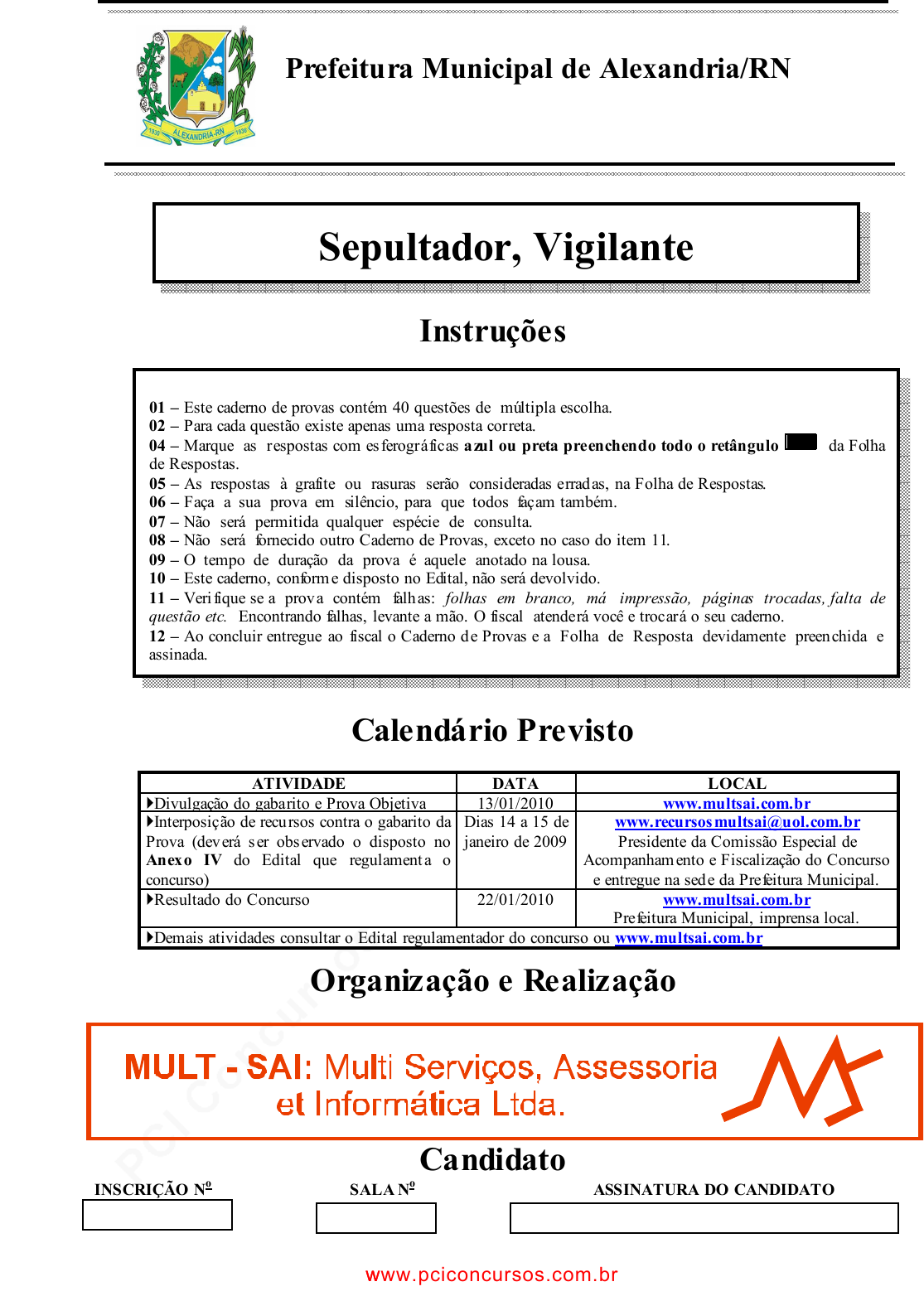pcimarkpci MDAwMDowMDAwOjAwMDA6MDAwMDowMDAwOmZmZmY6OTU0ZTpiYTc5:U3VuLCAwMiBGZWIgMjAyNSAwNDowNToyNSAtMDMwMA== www.pciconcursos.com.br Instruções Calendário Previsto ATIVIDADE DATA LOCAL �Divulgação do gabarito e Prova Objetiva 13/01/2010 www.multsai.com.br �Interposição de recursos contra o gabarito da Prova (deverá ser observado o disposto no Anexo IV do Edital que regulamenta o concurso) Dias 14 a 15 de janeiro de 2009 www.recursosmultsai@uol.com.br Presidente da Comissão Especial de Acompanhamento e Fiscalização do Concurso e entregue na sede da Prefeitura Municipal. �Resultado do Concurso 22/01/2010 www.multsai.com.br Prefeitura Municipal, imprensa local. �Demais atividades consultar o Edital regulamentador do concurso ou www.multsai.com.br Organização e Realização Candidato INSCRIÇÃO No SALA No ASSINATURA DO CANDIDATO Prefeitura Municipal de Alexandria/RN Sepultador, Vigilante 01 – Este caderno de provas contém 40 questões de múltipla escolha. 02 – Para cada questão existe apenas uma resposta correta. 04 – Marque as respostas com esferográficas azul ou preta preenchendo todo o retângulo da Folha de Respostas. 05 – As respostas à grafite ou rasuras serão consideradas erradas, na Folha de Respostas. 06 – Faça a sua prova em silêncio, para que todos façam também. 07 – Não será permitida qualquer espécie de consulta. 08 – Não será fornecido outro Caderno de Provas, exceto no caso do item 11. 09 – O tempo de duração da prova é aquele anotado na lousa. 10 – Este caderno, conforme disposto no Edital, não será devolvido. 11 – Veri fique se a prova contém falhas: folhas em branco, má impressão, páginas trocadas, falta de questão etc. Encontrando falhas, levante a mão. O fiscal atenderá você e trocará o seu caderno. 12 – Ao concluir entregue ao fiscal o Caderno de Provas e a Folha de Resposta devidamente preenchida e assinada. www.pciconcursos.com.br www.pciconcursos.com.br pcimarkpci MDAwMDowMDAwOjAwMDA6MDAwMDowMDAwOmZmZmY6OTU0ZTpiYTc5:U3VuLCAwMiBGZWIgMjAyNSAwNDowNToyNSAtMDMwMA== www.pciconcursos.com.br Questões de 01 a 15 = Português. ► Texto para as questões 01 e 02. 01- Assinale a ÚNICA alternativa que NÃO está de acordo com o texto: A) O autor do livro é Fernando Paixão; B) O nome do livro é Poesia a gente inventa; C) O livro foi publicado pela editora Ática; D) O livro é um romance. 02- As palavras CONVITE e VONTADE , retiradas do texto são: A) Monossílabas; B) Dissílabas; C) Trissílabas; D) Polissílabas. ►Textos para as questões de 03 a 06. 03- Os textos acima pertencem ao gênero: A) Bilhete; B) Carta; C) Aviso; D) Convite. 04- Esse gênero textual deve conter mensagens: A) Longas; B) Incompletas; C) Curtas; D) Complexas. 05- A função básica desse gênero textual é: A) Anunciar um produto; B) Dar pequenos recados; C) Fazer um convite; D) Dar longas notícias. 06- Das palavras abaixo, retiradas dos textos, assinale a ÚNICA que é substantivo próprio: A) Mamãe; B) Filho; C) Escola; D) Paulo. ►Leia, com atenção, o texto abaixo para responder às questões de 07 a 13. Um cavalo caiu no fundo de um poço. Seu dono, um fazendeiro, vendo a impossibilidade de retirá-lo de lá, ordenou aos seus empregados que jogassem terra no poço para enterrar o cavalo de vez e acabar com seu sofrimento. Assim foi feito. Os empregados começaram a jogar terra para dentro do buraco, de forma a cobrir o cavalo. Mas, à medida que ela caía em seu dorso, o animal a sacudia e a terra ia se acumulando no fundo, possibilitando ao cavalo ir subindo. Logo os homens perceberam que o cavalo não se deixava enterrar, pelo contrário, ia subindo à medida que a terra enchia o poço, até que finalmente conseguiu sair. Ao saber do caso, o fazendeiro fi cou muito satisfeito, e o cavalo viveu ainda muitos anos em sua companhia. Em nossa vida existem situações nas quais nos sentimos como esse cavalo, no fundo do poço. Tudo vai depender de não nos deixarmos vencer, lutando para sair da di ficuldade. (Para que minha vida se transforme – Maria Sallete e Wilma Ruggeri) 07- A idéia principal do texto é de que: A) Devemos nos conformar com a vida que temos; B) Devemos sempre esperar pela ajuda do próximo; C) Nunca devemos desistir de nossos objetivos; D) Devemos esperar sempre pela ajuda divina. 08- O texto nos passa uma mensagem: A) De religiosidade; B) De otimismo; C) De pessimismo; D) De indiferença. 09- O trecho “... à medida que a terra enchia o poço...”, apresenta uma palavra sublinhada. O antônimo dessa palavra é: A) Completava; B) Lotava; C) Preenchia; D) Esvaziava. 10- Assinale a alternativa cuja palavra apresenta o mesmo número de sílabas da palavra FAZENDEIRO : A) Empregados; B) Jogassem; C) Subindo; D) Acumulando. 11- Das palavras abaixo, retiradas do texto, a ÚNICA que apresenta a separação silábica correta é: A) Te-rra; B) Com-pan-hia; C) Jo-ga-ssem; D) En-ter-rar. 12- No trecho “Um cavalo caiu no fundo de um poço” , as palavras em destaque são: A) Artigos; B) Substantivos; C) Adjetivos; D) Verbos. 13- O verbo CAIU , que aparece na frase da questão anterior, está no tempo: A) Presente; B) Passado; C) Futuro; D) Não tem tempo definido. ► Texto para as questões 14 e 15. www.pciconcursos.com.br www.pciconcursos.com.br pcimarkpci MDAwMDowMDAwOjAwMDA6MDAwMDowMDAwOmZmZmY6OTU0ZTpiYTc5:U3VuLCAwMiBGZWIgMjAyNSAwNDowNToyNSAtMDMwMA== www.pciconcursos.com.br 14- No primeiro balão do segundo quadrinho, temos uma frase: A) Afirmativa; B) Interrogativa; C) Negativa; D) Exclamativa. 15- Na frase do último quadrinho, a palavra ELA é um: A) Artigo; B) Substantivo; C) Adjetivo; D) Pronome. Questões de 16 a 30 = Matemática. 16- 30% de 600 é igual a: A) 1,8; B) 18; C) 180; D) N.A.A. 17- Izolda ganhou de algumas amigas certa quantidade de mangas. Da 1ª amiga ganhou 10, da 2ª ganhou uma dúzia e da 3ª amiga ganhou 35. Ao todo, Izolda ganhou: A) 55 mangas; B) 57 mangas; C) 59 mangas; D)