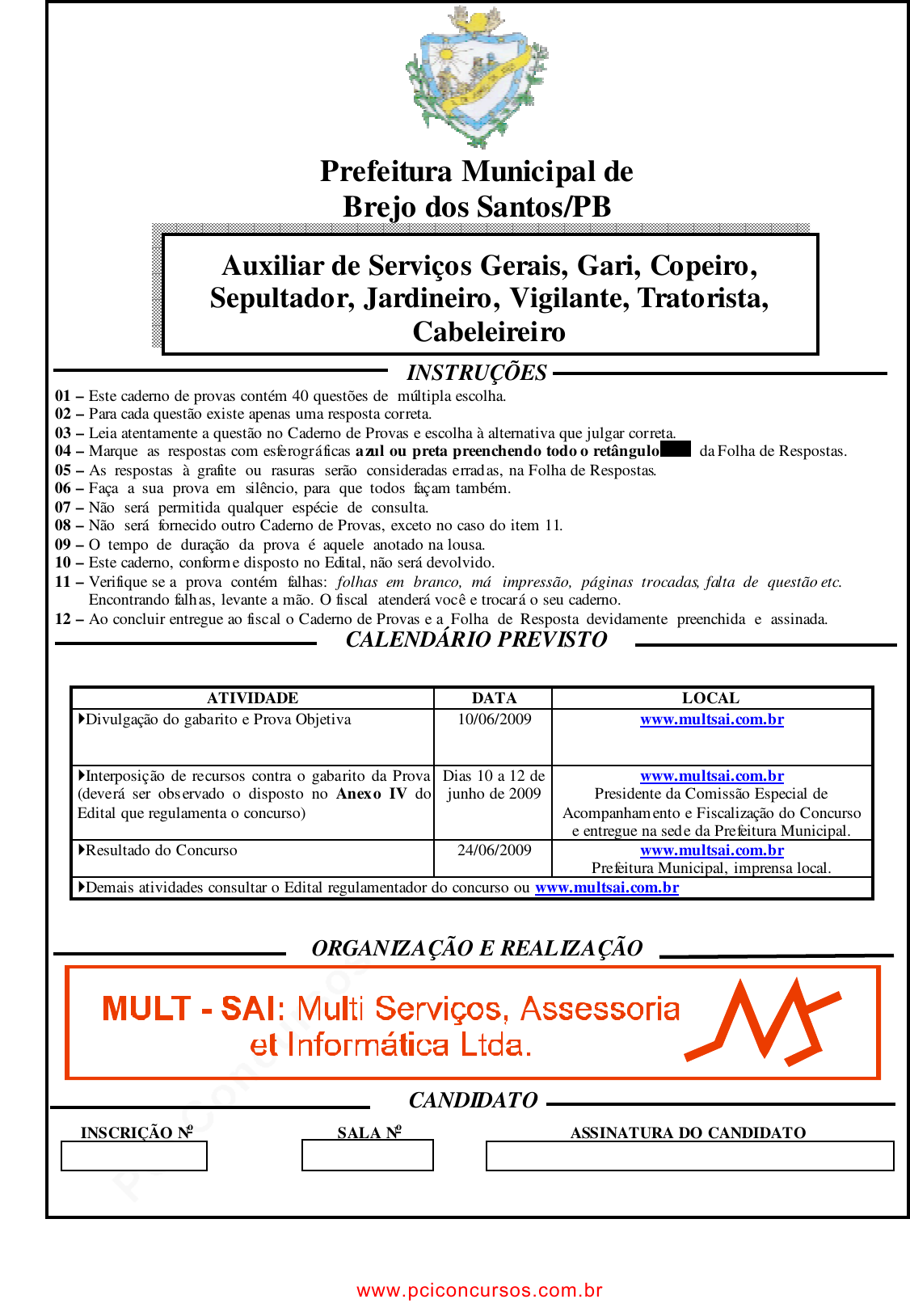 pcimarkpci MDAwMDowMDAwOjAwMDA6MDAwMDowMDAwOmZmZmY6OTU0ZTpiYTc5:U3VuLCAwMiBGZWIgMjAyNSAwNDowMjowMiAtMDMwMA== www.pciconcursos.com.br Prefeitura Municipal de Brejo dos Santos/PB INSTRUÇÕES 01 – Este caderno de provas contém 40 questões de múltipla escolha. 02 – Para cada questão existe apenas uma resposta correta. 03 – Leia atentamente a questão no Caderno de Provas e escolha à alternativa que julgar correta. 04 – Marque as respostas com esferográficas azul ou preta preenchendo todo o retângulo da Folha de Respostas. 05 – As respostas à grafite ou rasuras serão consideradas erradas, na Folha de Respostas. 06 – Faça a sua prova em silêncio, para que todos façam também. 07 – Não será permitida qualquer espécie de consulta. 08 – Não será fornecido outro Caderno de Provas, exceto no caso do item 11. 09 – O tempo de duração da prova é aquele anotado na lousa. 10 – Este caderno, conforme disposto no Edital, não será devolvido. 11 – Verifique se a prova contém falhas: folhas em branco, má impressão, páginas trocadas, falta de questão etc. Encontrando falhas, levante a mão. O fiscal atenderá você e trocará o seu caderno. 12 – Ao concluir entregue ao fiscal o Caderno de Provas e a Folha de Resposta devidamente preenchida e assinada. CALENDÁRIO PREVISTO ORGANIZAÇÃO E REALIZAÇÃO CANDIDATO INSCRIÇÃO No SALA No ASSINATURA DO CANDIDATO Auxiliar de Serviços Gerais, Gari, Copeiro, Sepultador, Jardineiro, Vigilante, Tratorista, Cabeleireiro ATIVIDADE DATA LOCAL �Divulgação do gabarito e Prova Objetiva 10/06/2009 www.multsai.com.br �Interposição de recursos contra o gabarito da Prova (deverá ser observado o disposto no Anexo IV do Edital que regulamenta o concurso) Dias 10 a 12 de junho de 2009 www.multsai.com.br Presidente da Comissão Especial de Acompanhamento e Fiscalização do Concurso e entregue na sede da Prefeitura Municipal. �Resultado do Concurso 24/06/2009 www.multsai.com.br Prefeitura Municipal, imprensa local. �Demais atividades consultar o Edital regulamentador do concurso ou www.multsai.com.br www.pciconcursos.com.br pcimarkpci MDAwMDowMDAwOjAwMDA6MDAwMDowMDAwOmZmZmY6OTU0ZTpiYTc5:U3VuLCAwMiBGZWIgMjAyNSAwNDowMjowMiAtMDMwMA== www.pciconcursos.com.br Questões de 01 a 15 = Português. � Leia, com atenção, o texto abaixo para responder às questões de 01 a 14. 01 – O texto lido pertence ao gênero: A) Convite; B) Bilhete; C) Carta; D) Aviso. 02 – Assinale a alternativa que indica a função básica desse gênero textual: A) Fazer um convite; B) Passar recados; C) Vender um produto; D) Dar longas notícias. 03 – Esse gênero textual deve conter mensagens: A) Curtas; B) Longas; C) Complexas; D) Incompletas. 04 – Pela leitura do texto, pode-se perceber que a mãe do garoto é: A) Brigona; B) Cuidadosa; C) Relaxada; D) Desorganizada. 05 – Assinale a úni ca alternativa que a informação NÃO se refere a palavra LUCAS. A) É quem enviou a mensagem; B) É quem recebeu a mensagem; C) É um substantivo próprio; D) A palavra possui duas sílabas. 06 – A data no final da mensagem corresponde a: A) 18 de feverei ro de 2005; B) 18 de março de 2005; C) 18 de abril de 2005; D) 18 de maio de 2005. 07 – Das palavras retiradas do texto, assinale a única que NÃO corresponde a um substantivo comum: A) Quarto; B) Brinquedos; C) Mamãe; D) Lucas. 08 – Das palavras retiradas do texto, assinale a única que possui quatro sílabas: A) Bagunça; B) Conversou; C) Preguiçoso; D) Escolar. 09 – Das palavras retiradas do texto, assinale a única que é trissílaba: A) Gente; B) Susto; C) Beijoca; D) Arrumado. 10 – No trecho “ Quando eu voltar do trabalho quero encontrar tudo arrumado”, assinale a alternativa que indica o ANTÔNIMO da palavra destacada: A) Organizado; B) Ajeitado; C) Em ordem; D) Bagunçado. 11 – O trecho “ A gente já conversou sobre isso, lembra?” é formado por uma frase: A) Exclamativa; B) Interrogativa; C) Afirmativa; D) Negativa. 12 – Das palavras retiradas do texto, assinale a única que apresent a a separação silábica INCORRETA. A) Pre-gui-ço-so; B) Le-vei; C) Ar-ru-ma-do; D) Pa-ssei. 13 – No texto, a palavra BRINQUEDOS apresent a as seguintes flexões: A) Feminino e singular; B) Feminino e plural; C) Masculino e singular; D) Masculino e plural. 14 – No trecho “ Deixe de ser preguiçoso, hein!”, a palavra destacada é um: A) Artigo; B) Substantivo; C) Adjetivo; D) Verbo. � Leia, com atenção, os quadrinhos abaixo para responder a questão 15 . 15 – No primeiro quadrinho da tirinha, temos: A) Três substantivos; B) Quatro substantivos; C) Cinco substantivos; D) Seis substantivos. Questões de 16 a 30 = Matemática. 16- O número da casa de Mário é formado pelos algarismos 3, 6 e 9, não necessari amente nessa ordem. Sabendo que nenhum algarismo se repet e, quantos são os possíveis números que a casa de Mário pode ser representado? A) 3; B) 4; C) 5; D) 6. 17- Para os festejos do nat al de 2008, a Mult-Sai, encomendou : . Três centos de empadas; . Um cento e meio de pastéis; . Um cento de canudos; . Meio cento de coxinhas. � Quantos salgados foram comprados ao todo para a referida festa? www.pciconcursos.com.br pcimarkpci MDAwMDowMDAwOjAwMDA6MDAwMDowMDAwOmZmZmY6OTU0ZTpiYTc5:U3VuLCAwMiBGZWIgMjAyNSAwNDowMjowMiAtMDMwMA== www.pciconcursos.com.br A) 550; B) 600; C) 650; D) 700. 18- O dobro de um número somado com a metade desse mesmo número, é igual a noventa e cinco. O número que me refiro é: A) 38; B) 40; C) 42; D) 44. 19- Itamara comprou uma biciclet a de passeio, aro 26, no início de maio. O pagamento foi feito da seguinte forma: . 1 entrada de R$ 32,60 (trinta e dois reais e sessenta centavos); . Mais 5 prestações fixas de R$ 28,40 (vinte e oito reais e quarenta centavos). o valor total que itamara pagou pela bicicleta foi de: A) R$ 174,00; B) R$ 174,40; C) R$ 174,60; D) R$ 174,80. 20- Patrícia tem 420 chocolates e irá distribuir em pacotes para 