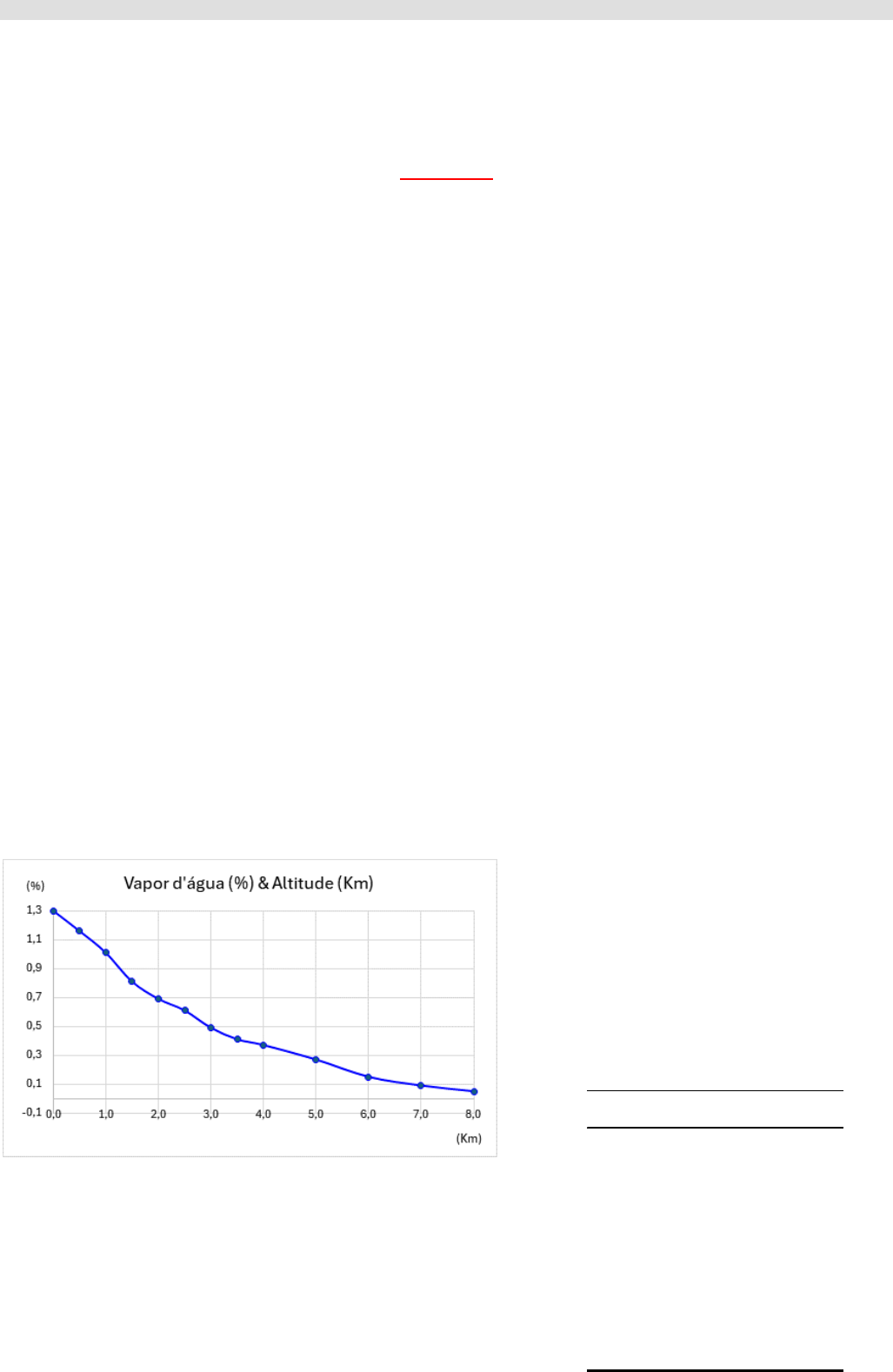 1 EXERCÍCIO PRÁTICO 4 – UMIDADE E PRECIPITAÇÃO ATMOSFÉRICA DISCIPLINA: CLIMATOLOGIA Prof. Wellington Lopes Assis PERÍODO: _______ TURNO:________________ DATA: / / ALUNO:___________________________________________________ MATRÍCULA: _________________ GABARITO 1) Quais seriam os pontos que indicam a importância do vapor d’água na atmosfera e na configuração dos tipos de tempo e climas observados no globo? a) É a matéria-prima para todas as formas de condensação e de precipitação. A quantidade de vapor d’água num certo volume de ar é uma indicação da capacidade potencial da atmosfera para produzir precipitação. b) O vapor d’água pode absorver tanto a radiação solar (ondas curtas) quanto a terrestre (ondas longas) e, assim, desempenha o papel de principal regulador térmico no sistema Terra-Atmosfera. c) O vapor d’água contém calor latente e essa energia é liberada quando o vapor se condensa. O calor latente contido no vapor d’água é importante fonte de energia para a circulação atmosférica e para o desenvolvimento de perturbações atmosféricas. d) Por conter o vapor d’água calor latente, a sua quantidade e distribuição vertical na atmosfera afeta a estabilidade do ar. e) A quantidade de vapor d’água no ar é importante fator que influencia a taxa de evaporação e de evapotranspiração. É, assim, uma importante forçante que determina a temperatura sentida pela pele humana e, em decorrência, o conforto humano. f) O vapor d’água, ao contrário de outros gases atmosféricos, pode passar para a forma líquida ou sólida no nível das temperaturas atmosféricas normais – mudança de estado físico. O vapor d’água constantemente muda de fase no sistema Terra-Atmosfera. 2) Qual é a relação entre umidade absoluta, temperatura do ponto de orvalho e saturação. Exemplifique. A umidade absoluta é expressa em gramas por metro cúbico de ar (gr/m3), é a massa total de água num dado volume de ar. A temperatura do ponto de orvalho é aquela em que ocorrerá saturação se o ar se esfriar a uma pressão constante, sem aumento ou diminuição de vapor d’água. E, por fim, a saturação é quando a condensação se iguala a evaporação num processo de equilíbrio termodinâmico. A relação entre esses elementos se deve ao fato de um determinado valor de umidade absoluta, para uma determinada temperatura do ponto de orvalho, atinge o ponto de saturação. 3) Considere os dados da tabela e represente graficamente os valores do vapor d’água em relação a altitude. Defina a relação entre altitude, temperatura e quantidade de vapor d’água presente na atmosfera. Assim como a temperatura, o vapor d’água diminui com a altitude. Altitude (Km) Vapor d'água (% do volume) 0,0 1,3 0,5 1,16 1,0 1,01 1,5 0,81 2,0 0,69 2,5 0,61 3,0 0,49 3,5 0,41 4,0 0,37 5,0 0,27 6,0 0,15 7,0 0,09 8,0 0,05 Fonte: Ayoade (1991) Distribuição Vertical Média do Vapor d'água nas Latitudes Médias 2 4) A temperatura no qual o ar se satura por resfriamento, sem acréscimo de vapor de água, denomina-se: a) umidade absoluta b) umidade específica c) umidade relativa d) temperatura do ponto de orvalho 5) Um volume de ar encontra-se saturado com umidade relativa de: a) 100% b) 25% c) 75% d) 4% 6) O psicrômetro é um instrumento que fornece os valores de: a) umidade relativa e ponto de orvalho b) nebulosidade e umidade absoluta c) ponto de orvalho e pressão d) pressão e temperatura 7) Um volume de ar que se satura com 200 gramas de vapor d’água, possuindo 150 gramas terá umidade relativa de: a) 40% b) 50% c) 75% d) 100% 8) Com base no valor da temperatura do bulbo seco (T), na temperatura do bulbo úmido (Tw), na depressão psicromêtrica (T – Tw) e consultando as tabelas 1 e 2 (anexo), determine a umidade relativa (UR%) e temperatura do ponto de orvalho (Td) para as seguintes situações: T (ºC) Tw (ºC) (T – Tw) (ºC) UR (%) Td (ºC) 26,0 20,0 6,0 57 17 20,0 10,0 10,0 23 -2 32,0 32,0 0,0 100 32 18,0 16,0 2,0 81 15 24,0 18,0 6,0 55 14 12,0 6,0 6,0 38 -2 30,0 15,0 15,0 16 1 -4,0 -6,0 2,0 54 -11 -2,0 -4,0 2,0 58 -8 0,0 -2,0 2,0 63 -6 9) Quanto mais próximos estiverem os valores da temperatura do ar e do ponto de orvalho temos: a) ar mais seco b) ar mais úmido c) menos umidade d) menor precipitação 10) O fenômeno provocado por gotículas de água em suspensão na atmosfera que confere aos objetos a distância uma tonalidade azul-cinza, denomina-se: a) névoa-seca b) névoa-úmida c) ponto de orvalho d) poeira 11) Define-se coalescência como sendo o/a: a) condensação do chuvisco b) condensação do nevoeiro c) processo que origina a precipitação d) geada, orvalho e chuvisco 12) Dentre as alternativas abaixo, identifique aquela que apresenta somente hidrometeoros precipitados: a) geada, neve e granizo b) chuva, chuvisco e neve c) orvalho, chuva e fumaça d) geada, orvalho e chuvisco 3 13) Dentre as nuvens do estágio médio, uma costuma não produzir precipitação e quando o faz, esta não atinge o solo (virga). Este gênero de nuvem denomina-se: a) Altostratus (As) b) Altocumulus (Ac) c) Nimbostratus (Ns) d) Cirrostratus (Ci) 14) Das nuvens abaixo, aquela cuja constituição física é somente de cristais de gelo: a) Cirrus (Ci) b) Altostratus (As) c) Altocumulus (Ac) d) Cumulonimbus (Cb) 15) O nevoeiro formado pelo resfriamento noturno, em noites claras, sem nuvens, especialmente no inverno e primavera, denomina-se nevoeiro: a) marítimo b) orográfico c) de radiação d) advecção 16) Das alternativas relacionadas abaixo, indique aquela em que não há elementos necessários à formação de nuvens: a) escassez de núcleos higroscópicos b) resfriamento do ar por contato c) inversão da temperatura de superfície d) existência de elevada umidade relativa 17) A temperatura de uma parcela de ar na superfície é de 26,0ºC e a temperatura do ar externo a essa parcela a 400 metros de altura é de 23,0ºC. Se essa parcela de ar subir che