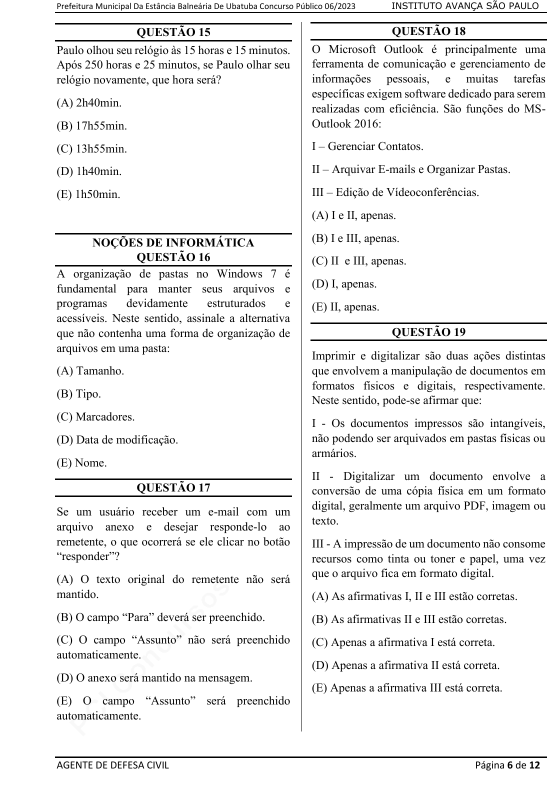 pcimarkpci MDAwMDowMDAwOjAwMDA6MDAwMDowMDAwOmZmZmY6YmZiOTphZTFk:U3VuLCAwMiBGZWIgMjAyNSAyMTozMjowMCAtMDMwMA== www.pciconcursos.com.br Prefeitura Municipal Da Estância Balneária De Ubatuba Concurso Público 06/2023 INSTITUTO AVANÇA SÃO PAULO AGENTE DE DEFESA CIVIL Página 6 de 12 QUESTÃO 15 Paulo olhou seu relógio às 15 horas e 15 minutos. Após 250 horas e 25 minutos, se Paulo olhar seu relógio novamente, que hora será? (A) 2h40min. (B) 17h55min. (C) 13h55min. (D) 1h40min. (E) 1h50min. NOÇÕES DE INFORMÁTICA QUESTÃO 16 A organização de pastas no Windows 7 é fundamental para manter seus arquivos e programas devidamente estruturados e acessíveis. Neste sentido, assinale a alternativa que não contenha uma forma de organização de arquivos em uma pasta: (A) Tamanho. (B) Tipo. (C) Marcadores. (D) Data de modificação. (E) Nome. QUESTÃO 17 Se um usuário receber um e-mail com um arquivo anexo e desejar responde-lo ao remetente, o que ocorrerá se ele clicar no botão “responder”? (A) O texto original do remetente não será mantido. (B) O campo “Para” deverá ser preenchido. (C) O campo “Assunto” não será preenchido automaticamente. (D) O anexo será mantido na mensagem. (E) O campo “Assunto” será preenchido automaticamente. QUESTÃO 18 O Microsoft Outlook é principalmente uma ferramenta de comunicação e gerenciamento de informações pessoais, e muitas tarefas específicas exigem software dedicado para serem realizadas com eficiência. São funções do MS- Outlook 2016: I – Gerenciar Contatos. II – Arquivar E-mails e Organizar Pastas. III – Edição de Vídeoconferências. (A) I e II, apenas. (B) I e III, apenas. (C) II e III, apenas. (D) I, apenas. (E) II, apenas. QUESTÃO 19 Imprimir e digitalizar são duas ações distintas que envolvem a manipulação de documentos em formatos físicos e digitais, respectivamente. Neste sentido, pode-se afirmar que: I - Os documentos impressos são intangíveis, não podendo ser arquivados em pastas físicas ou armários. II - Digitalizar um documento envolve a conversão de uma cópia física em um formato digital, geralmente um arquivo PDF, imagem ou texto. III - A impressão de um documento não consome recursos como tinta ou toner e papel, uma vez que o arquivo fica em formato digital. (A) As afirmativas I, II e III estão corretas. (B) As afirmativas II e III estão corretas. (C) Apenas a afirmativa I está correta. (D) Apenas a afirmativa II está correta. (E) Apenas a afirmativa III está correta. pcimarkpci MDAwMDowMDAwOjAwMDA6MDAwMDowMDAwOmZmZmY6YmZiOTphZTFk:U3VuLCAwMiBGZWIgMjAyNSAyMTozMjowMCAtMDMwMA== www.pciconcursos.com.br Prefeitura Municipal Da Estância Balneária De Ubatuba Concurso Público 06/2023 INSTITUTO AVANÇA SÃO PAULO AGENTE DE DEFESA CIVIL Página 7 de 12 QUESTÃO 20 O Microsoft Word, Excel e PowerPoint são aplicativos da suíte Office da Microsoft e compartilham várias ações comuns devido à sua natureza de processamento de documentos e apresentações. Pode-se afirmar que são ações comuns entre esses softawares: I – Copiar e colar conteúdos. II – Formatar texto. III – Criar planilhas. (A) I e II, apenas. (B) I e III, apenas. (C) II e III, apenas. (D) I, apenas. (E) II, apenas. CONHECIMENTOS ESPECÍFICOS QUESTÃO 21 Efeitos como compressão, cisalhamento ou distorções ocorrem nos maciços de terra por causa das variações de tensões efetivas. Sendo o solo um meio particulado, suas deformações causam principalmente a mudança de volume e forma, que resultam no deslocamento relativo das partículas. A contração e expansão dos solos são consequências da presença de água, ou seja, a secagem proporciona a contração, enquanto o umedecimento causa a expansão. Por outro lado, a compressão, tração e cisalhamento são fenômenos produzidos por: (A) Esforços mecânicos. (B) Processos químicos. (C) Esforços com resultante nula. (D) Processos ionizantes. (E) Esforços geotérmicos. QUESTÃO 22 O operador de máquinas, ao se deparar com a Muitas são as tensões que atuam no solo. Elas podem ser geradas pelo próprio peso do solo ou por causa de aplicações de cargas externas. Nossos solos são formados por várias camadas, assim, as pressões geostáticas são definidas pela somatória das tensões devidas ao peso próprio de cada um dos solos. Observe a ilustração a seguir que representa uma superfície de um terreno horizontal e assinale a alternativa que apresenta uma afirmação verdadeira: (A) As pressões geradas pelo Solo 01 não se transferem integralmente para o Solo 02. (B) As pressões geradas pelo Solo 02 se transferem para o Solo 01. (C) As pressões geradas pelo Solo 02 não se Transferem para o último nível do Solo. (D) As pressões geradas pelo Solo 01 não tem reflexo no último nível do Solo. (E) As pressões geradas pelo Solo 1 se transferem integralmente para o Solo 2, enquanto as tensões geradas pelo Solo 2 são transmitidas totalmente para o último nível do Solo.