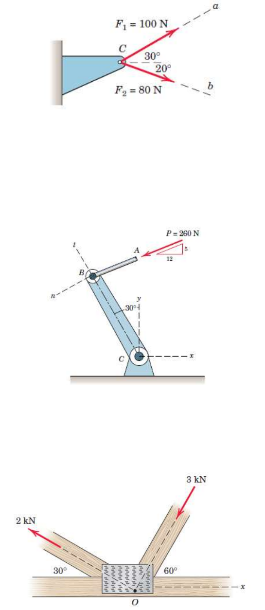1° Lista de Exercícios – Sistemas de Forças Bidimensionais 1 – Determine a Força Resultante que age no ponto C. R = 163,4 N 2 – Na representação de um sistema de controle, está determinado que o elemento AB transmite 260 N para o elemento BC. Determine as decomposições da força em X e Y. Px = -240 N Py = -100 N 3 – Dois elementos estruturais estão submetidos a esforços como mostrado na figura abaixo. Determine a magnitude da força resultante R no ponto O e o ângulo que R faz com o eixo X positivo no sentido anti-horário. R = 3,61 kN e Ɵ = 206° 4 – Em qual ângulo Ɵ deve ser aplicada a força de 400 N para que a resultante R das duas forças seja igual a 1000 N? Para essas condições, qual será o ângulo β entre R e a horizontal? Ɵ = 51,3° e β = 18,19° 5 – Determine a magnitude de F1 e a sua direção Ɵ para que a resultante do sistema de forças seja de 800 N no sentido vertical positivo. F1 = 275 N e Ɵ = 29,1° 6 – Uma pessoa aplica uma força de 120 N na maçanete de uma bomba d’água. Determine o momento que essa força realiza em torno do ponto O. Mo = 14,74 N.m (SH) 7 – Um mecânico aplica uma força de 140 N na chave acoplada ao parafuso. Determine o momento que essa força realiza no ponto O. Mo = 13,10 N.m (SAH) 8 – Determine o momento gerado no ponto O. Mo = 2,81 N.m (SH) 9 – Determine a magnitude da força T para que o momento no ponto O seja igual a zero. T = 4,04 kN 10 - Se o homem em B exerce uma força P = 150 N sobre sua corda, determine a intensidade da força F que o homem em C precisa exercer para impedir que o poste gire; ou seja, para que o momento resultante em A devido as duas forças seja zero. Considere 1 ft = 0,3 m. F = 198.9 N