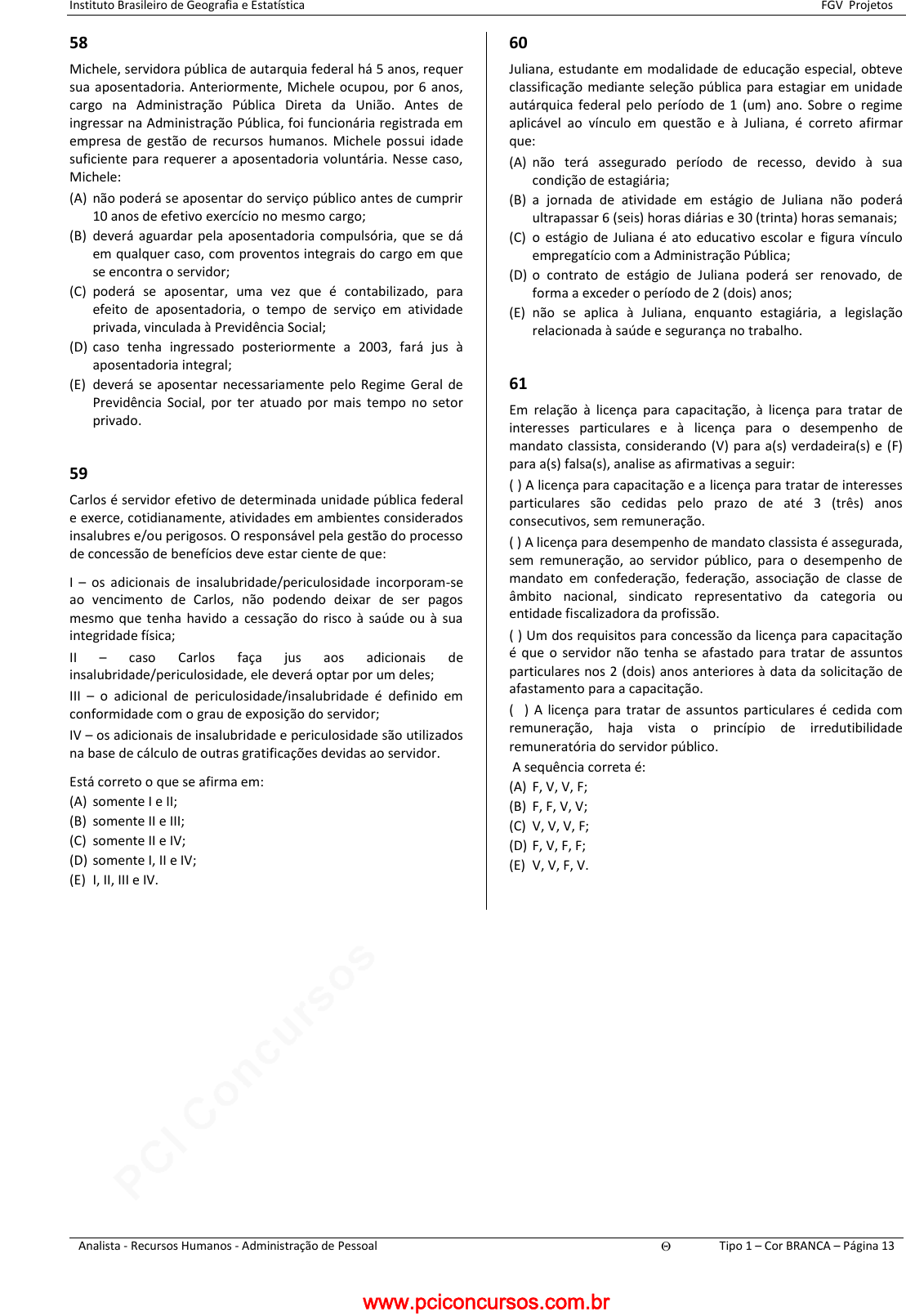 pcimarkpci MDAwMDowMDAwOjAwMDA6MDAwMDowMDAwOmZmZmY6YmZiOTphZTFk:U3VuLCAwMiBGZWIgMjAyNSAyMjo0NjozOSAtMDMwMA== www.pciconcursos.com.br Instituto Brasileiro de Geografia e Estatística FGV Projetos Analista - Recursos Humanos - Administração de Pessoal Tipo 1 – Cor BRANCA – Página 13 58 Michele, servidora pública de autarquia federal há 5 anos, requer sua aposentadoria. Anteriormente, Michele ocupou, por 6 anos, cargo na Administração Pública Direta da União. Antes de ingressar na Administração Pública, foi funcionária registrada em empresa de gestão de recursos humanos. Michele possui idade suficiente para requerer a aposentadoria voluntária. Nesse caso, Michele: (A) não poderá se aposentar do serviço público antes de cumprir 10 anos de efetivo exercício no mesmo cargo; (B) deverá aguardar pela aposentadoria compulsória, que se dá em qualquer caso, com proventos integrais do cargo em que se encontra o servidor; (C) poderá se aposentar, uma vez que é contabilizado, para efeito de aposentadoria, o tempo de serviço em atividade privada, vinculada à Previdência Social; (D) caso tenha ingressado posteriormente a 2003, fará jus à aposentadoria integral; (E) deverá se aposentar necessariamente pelo Regime Geral de Previdência Social, por ter atuado por mais tempo no setor privado. 59 Carlos é servidor efetivo de determinada unidade pública federal e exerce, cotidianamente, atividades em ambientes considerados insalubres e/ou perigosos. O responsável pela gestão do processo de concessão de benefícios deve estar ciente de que: I – os adicionais de insalubridade/periculosidade incorporam-se ao vencimento de Carlos, não podendo deixar de ser pagos mesmo que tenha havido a cessação do risco à saúde ou à sua integridade física; II – caso Carlos faça jus aos adicionais de insalubridade/periculosidade, ele deverá optar por um deles; III – o adicional de periculosidade/insalubridade é definido em conformidade com o grau de exposição do servidor; IV – os adicionais de insalubridade e periculosidade são utilizados na base de cálculo de outras gratificações devidas ao servidor. Está correto o que se afirma em: (A) somente I e II; (B) somente II e III; (C) somente II e IV; (D) somente I, II e IV; (E) I, II, III e IV. 60 Juliana, estudante em modalidade de educação especial, obteve classificação mediante seleção pública para estagiar em unidade autárquica federal pelo período de 1 (um) ano. Sobre o regime aplicável ao vínculo em questão e à Juliana, é correto afirmar que: (A) não terá assegurado período de recesso, devido à sua condição de estagiária; (B) a jornada de atividade em estágio de Juliana não poderá ultrapassar 6 (seis) horas diárias e 30 (trinta) horas semanais; (C) o estágio de Juliana é ato educativo escolar e figura vínculo empregatício com a Administração Pública; (D) o contrato de estágio de Juliana poderá ser renovado, de forma a exceder o período de 2 (dois) anos; (E) não se aplica à Juliana, enquanto estagiária, a legislação relacionada à saúde e segurança no trabalho. 61 Em relação à licença para capacitação, à licença para tratar de interesses particulares e à licença para o desempenho de mandato classista, considerando (V) para a(s) verdadeira(s) e (F) para a(s) falsa(s), analise as afirmativas a seguir: ( ) A licença para capacitação e a licença para tratar de interesses particulares são cedidas pelo prazo de até 3 (três) anos consecutivos, sem remuneração. ( ) A licença para desempenho de mandato classista é assegurada, sem remuneração, ao servidor público, para o desempenho de mandato em confederação, federação, associação de classe de âmbito nacional, sindicato representativo da categoria ou entidade fiscalizadora da profissão. ( ) Um dos requisitos para concessão da licença para capacitação é que o servidor não tenha se afastado para tratar de assuntos particulares nos 2 (dois) anos anteriores à data da solicitação de afastamento para a capacitação. ( ) A licença para tratar de assuntos particulares é cedida com remuneração, haja vista o princípio de irredutibilidade remuneratória do servidor público. A sequência correta é: (A) F, V, V, F; (B) F, F, V, V; (C) V, V, V, F; (D) F, V, F, F; (E) V, V, F, V. www.pciconcursos.com.br pcimarkpci MDAwMDowMDAwOjAwMDA6MDAwMDowMDAwOmZmZmY6YmZiOTphZTFk:U3VuLCAwMiBGZWIgMjAyNSAyMjo0NjozOSAtMDMwMA== www.pciconcursos.com.br Instituto Brasileiro de Geografia e Estatística FGV Projetos Analista - Recursos Humanos - Administração de Pessoal Tipo 1 – Cor BRANCA – Página 14 62 Jonas, servidor efetivo do IBGE, ocupante do cargo intermediário de Técnico em Informações Geográficas e Estatísticas, faz jus à seguinte composição remuneratória: (A) Retribuição por Titulação, Vencimento Básico e Gratificação de Desempenho de Atividade em Pesquisa, Produção e Análise, Gestão e Infraestrutura de Informações Geográficas e Estatísticas; (B) Gratificação por Inovação, Vencimento Básico e Gratificação de Desempenho de Atividade em Pesquisa, Produção e Análise, Gestão e Infraestrutura de Informações Geográficas e Estatísticas; (C) Vantagem Pecuniária Individual – VPI, Vencimento Básico, Retribuição por Titulação e Gratificação por Qualificação; (D) Vencimento Básico, Gratificação de Desempenho de Atividade em Pesquisa, Produção e Análise, Gestão e Infraestrutura de Informações Geográficas e Estatísticas e Gratificação por Qualificação; (E) Vencimento Básico, Gratificação de Desempenho de Atividade em Pesquisa, Produção e Análise, Gestão e Infraestrutura de Informações Geográficas e Estatísticas e Gratificação por Especialização. 63 Lucas, servidor ainda em estágio probatório, teve pedido de licença deferido pela unidade responsável. Trata-se, no caso, de: (A) licença remunerada para tratar de assuntos particulares, li
