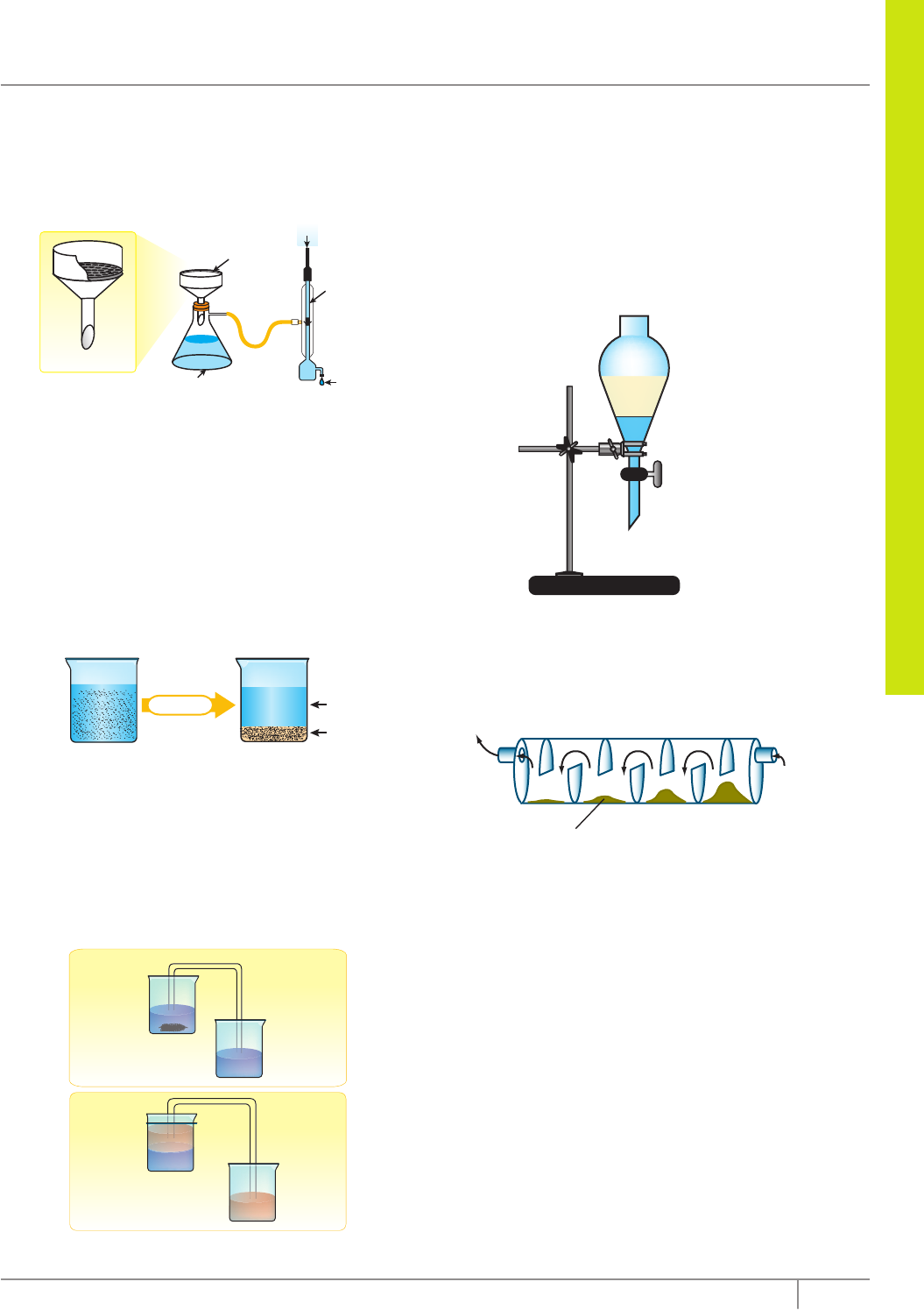 Q U ÍM IC A 5Editora Bernoulli A filtração a vácuo é também chamada filtração com sucção ou, ainda, filtração a pressão reduzida. Exemplo: Filtração a vácuo na purificação de uma amostra de ácido benzoico por recristalização. funil de Büchner trompa- d’água água águakitassatofunil de Büchner Filtração a vácuo Decantação Baseia-se no repouso de uma mistura heterogênea em que a substância menos densa se localiza sobre a substância mais densa. Agitando-se uma mistura de água e enxofre em pó, obtemos, inicialmente, uma suspensão de enxofre em água. Deixando-se a mistura em repouso, depois de algum tempo, há uma sedimentação do enxofre sólido, separando-se, assim, da água. repouso água enxofre suspensão de enxofre em água sedimentação ou decantação Decantação de uma mistura sólido + líquido Exemplo: Em uma mistura de água e areia, após o repouso, a água ficará na superfície, enquanto a areia irá se depositar no fundo do recipiente. Para isolarmos os dois componentes da mistura, devemos utilizar uma mangueira que, por sucção, retirará o líquido. Esse processo é denominado sifonação. líquido A líquido B líquido A sifonação líquido + sólido sifonação Sifonação Quando a decantação for utilizada para separar dois líquidos que não se dissolvem (imiscíveis), devemos colocar a mistura em um aparelho especial cujo nome é funil de bromo ou funil de decantação. Consiste em um balão com uma torneira na sua parte inferior, que permite o escoamento do líquido que constitui a fase mais densa. Exemplo: Água e óleo. óleo: menos denso água: mais densa torneira Decantação com funil de bromo Numa mistura sólido-gás, a decantação pode ser feita em câmara de poeira ou chicana, equipamento usado industrialmente. gás gás + sólido sólido sedimentado Decantação de uma mistura sólido + gás Floculação Método de separação de mistura que se baseia na adição de agente floculante, como A2(SO4)3 (sulfato de alumínio) ou FeC3 (cloreto férrico), que aglutina as impurezas sólidas formando pequenos flóculos mais densos do que a fase líquida, os quais decantarão lentamente. Exemplos: Nas estações de tratamento de água e na limpeza de piscinas. Centrifugação A decantação, vista anteriormente, é um processo lento, pois depende da ação da gravidade sobre as partículas. Porém, se imprimirmos às partículas dispersas uma aceleração bem maior, a deposição do sólido será mais rápida. Esse tipo de deposição pode ser obtido por meio de um centrifugador. Análise imediata 6 Coleção Estudo tubos em rotação fase líquida fase sólida sólido + líquido fase líquida fase sólida sólido + líquido Centrifugador manual parado tubos em repouso Centrifugador manual em rotação SEPARAÇÃO DOS COMPONENTES DAS MISTURAS HOMOGÊNEAS Gás + gás O processo mais utilizado para realizar a separação dos componentes desse sistema é a liquefação fracionada, realizada a altas pressões e lento resfriamento de uma mistura gasosa. O gás que possuir maior temperatura de ebulição será retirado primeiro. É dessa forma que separamos o oxigênio e o nitrogênio encontrados no ar. No caso particular da separação dos componentes do ar, é mais conveniente liquefazer a mistura (o ar) e depois separar os seus componentes por destilação fracionada. Nas máscaras contra gases venenosos, estes são separados do ar, que é respirado por um processo de adsorção. Existem sólidos, como o carvão ativado, que adsorvem os gases venenosos e deixam passar apenas o ar. Nos filtros de cigarros, também há separação por adsorção. Gás + líquido Por aquecimento da mistura, o gás é expulso do líquido, pois, geralmente, a solubilidade de um gás num líquido diminui com a elevação da temperatura. Assim, com a elevação da temperatura, uma água gaseificada ou um refrigerante, por exemplo, perdem o gás, isto é, o CO2 dissolvido é liberado. Outras maneiras de se expulsar o gás dissolvido num líquido: A) Agitar a solução. Assim, agitando-se um refrigerante, há formação de muita espuma, devido à liberação do gás. B) Diminuir a pressão. Assim, quando uma garrafa de refrigerante é aberta, a pressão interna diminui e há liberação do gás dissolvido. Gás + sólido Por simples aquecimento, o gás é expulso do sólido. Esse processo é inadequadamente chamado de destilação seca. Exemplo: Aquecimento da madeira, em que há liberação de metanol (CH3OH). Sólido + líquido O processo utilizado nesse caso é o da destilação, que separa tanto misturas homogêneas como heterogêneas a partir de um aquecimento contínuo. A substância mais volátil possui menor temperatura de ebulição e vaporiza primeiro. No estado de vapor, essa substância é resfriada no condensador, transformando-se novamente em líquido e recolhida em um novo frasco. água de resfriamento condensador frasco de recolhimento balão de destilação substância purificada mistura a separar tubo para escapamento, de vapores nocivos ou inflamáveis (se for o caso), para a pia água de resfriamento Destilação simples em laboratório Frente A Módulo 03 Q U ÍM IC A 7Editora Bernoulli Líquido + líquido O método usado é o da destilação fracionada. Os líquidos destilam-se, separadamente, à medida que os seus pontos de ebulição vão sendo atingidos. Para efetuar a destilação fracionada, usa-se uma coluna de fracionamento. Um dos tipos de coluna de fracionamento consiste em um tubo de vidro relativamente longo, cheio de bolinhas de vidro, em cuja superfície ocorre a condensação do vapor. O vapor sobe pela coluna, sofre sucessivas condensações seguidas de vaporizações, enriquece-se do componente mais volátil e, ao sair da coluna de fracionamento, é constituído, praticamente, de 100% do componente mais volátil. Assim, na parte superior da coluna de fracionamento, o vapor é mais rico em componente mais volátil, 