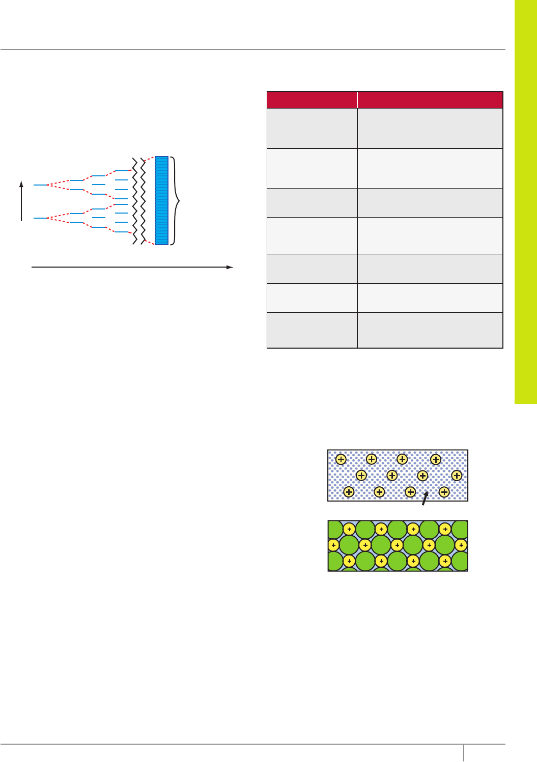Q U ÍM IC A 53Editora Bernoulli As diferenças de energia entre esses orbitais são tão minúsculas que, para efeitos práticos, podemos pensar no conjunto de orbitais como uma banda contínua de estados de energia permitidos, às quais chamamos de bandas eletrônicas ou bandas de energia. A figura a seguir esquematiza essa situação. Banda de orbitais moleculares 1 2 3 4 ... Muito grande Número de átomos metálicos interagindo E n er g ia Ilustração esquemática de como o número de orbitais moleculares aumenta e seus espaçamentos de energia diminuem à medida que o número de átomos que interagem aumenta. Nos metais, essas interações formam uma banda aproximadamente contínua de orbitais moleculares deslocalizados por toda a rede metálica. O número de elétrons disponível não preenche completamente esses orbitais. Os elétrons disponíveis para as ligações metálicas não preenchem completamente os orbitais disponíveis; pode-se pensar na banda eletrônica como um recipiente para elétrons parcialmente preenchido. O preenchimento incompleto das bandas eletrônicas dá origem às propriedades tipicamente metálicas. Os elétrons nos orbitais próximos ao topo dos níveis ocupados necessitam de muito pouca energia para serem promovidos para orbitais de energia ainda mais alta, que estão desocupados. Sob influência de qualquer fonte de excitação, como um potencial elétrico aplicado ou absorção de energia térmica, os elétrons passam para níveis antes vagos e podem se mover livremente pela rede, dando origem à condutividade térmica e elétrica. LIGAS METÁLICAS As ligas metálicas são formadas pela união de dois ou mais metais ou, ainda, pela união entre metais e ametais, considerando que, neste último caso, a porcentagem dos elementos metálicos é maior. O preparo das ligas dá-se pela união de seus componentes no estado fundido que, posteriormente, esfriam e se solidificam, resultando em uma solução sólida. Quando misturamos os componentes, conseguimos formar uma liga que possua determinadas propriedades que faltavam individualmente nos metais. Principais ligas metálicas Liga Composição Aço Fe – 98,5% C – 0,5 a 1,5% Traços de Si, S e P Aço inox Aço – 74% Cr – 18% Ni – 8% Solda elétrica Pb – 67% Sn – 33% Ouro 18 quilates Au – 75% Cu – 12,5% Ag – 12,5% Bronze Cu – 90% Sn – 10% Latão Cu – 67% Zn – 33% Amálgama Hg, Ag, Cd, Cu, Sn, Au (percentuais variados, com a predominância do Hg) EXERCÍCIOS DE FIXAÇÃO 01. (UFMG) Nas figuras I e II, estão representados dois sólidos cristalinos, sem defeitos, que exibem dois tipos diferentes de ligação química. nuvem de elétronsFigura I Figura II – – – – – – – – – –––– – Considerando-se essas informações, é CORRETO afirmar que A) a figura II corresponde a um sólido condutor de eletricidade. B) a figura I corresponde a um sólido condutor de eletricidade. C) a figura I corresponde a um material que, no estado líquido, é um isolante elétrico. D) a figura II corresponde a um material que, no estado líquido, é um isolante elétrico. Ligações metálicas 54 Coleção Estudo 02. (UFRN) Gílson, estudando Química Geral, aprendeu que a posição de cada elemento na tabela periódica pode ser representada como um ponto (x,y) num gráfico de coordenadas (x = grupo, y = período). Na prova de Química, o professor solicitou que se correlacionassem as coordenadas dos pares de elementos, tabeladas a seguir, com o provável tipo de ligação resultante de suas combinações. 1º Par 2º Par 3º Par 4º Par (11,4) e (14,5) (15,2) e (15,2) (2,4) e (17,3) (14,2) e (16,2) Na respectiva ordem dos pares de coordenadas anteriores, Gílson identificou CORRETAMENTE que as ligações são do tipo A) metálica, covalente apolar, iônica, covalente polar. B) iônica, covalente apolar, metálica, covalente polar. C) metálica, covalente polar, iônica, covalente apolar. D) covalente polar, iônica, covalente apolar, metálica. 03. (UFU-MG–2007) Considere as alternativas a seguir e assinale a INCORRETA. A) Pode-se obter fios a partir de elementos como ouro e níquel. B) Metais são, em geral, muito resistentes à tração. C) Quando polidas, superfícies metálicas refletem muito bem a luz. D) Em materiais que apresentam ligação metálica, os pontos de fusão são sempre elevados. 04. Julgue os itens. ( ) Um pedaço de metal sólido é constituído por moléculas. ( ) Metais são bons condutores de calor, pois apresentam elétrons livres. ( ) O aço é uma liga que apresenta alta resistência à tração, daí ser usado em cabos de elevadores e em construção civil. 05. (PUC Minas–2009) Analise as propriedades físicas na tabela a seguir. Amostra Temperatura de fusão (ºC) Temperatura de ebulição (ºC) Condução de corrente elétrica 25 ºC 1 000 ºC A 805 1 413 Isolante Condutor B 45 180 Isolante — C 1 540 2 800 Condutor Condutor Considerando-se os modelos de ligação, A, B e C podem ser classificados, respectivamente, como compostos A) iônico, metálico e molecular. B) metálico, molecular e iônico. C) molecular, metálico e iônico. D) iônico, molecular e metálico. EXERCÍCIOS PROPOSTOS 01. (UFRN) A ligação entre átomos de elementos de transição é A) iônica. C) metálica. B) covalente. D) coordenada. 02. (UFRGS) A alternativa que apresenta, respectivamente, exemplos de substâncias com ligação iônica, covalente polar, covalente apolar e metálica é A) AgCl, O2, H2, FeO. D) BF3, Br2, HF, Mn. B) BeCl2, CO2, CH4, Fe. E) MgO, H2O, I2, Al. C) Ca(OH)2, HCl, O3, SiC. 03. (UFU-MG) Considerando a tabela periódica e as propriedades dos elementos químicos, assinale a alternativa CORRETA. A) Um metal é uma substância dúctil e maleável que conduz calor e corrente elétrica. B) A maioria dos elementos químicos é constituída por não metais. C) Em condições ambiente, 25 ºC e 1 atm, o hidrogênio e o hélio encontram-se no estado líqu