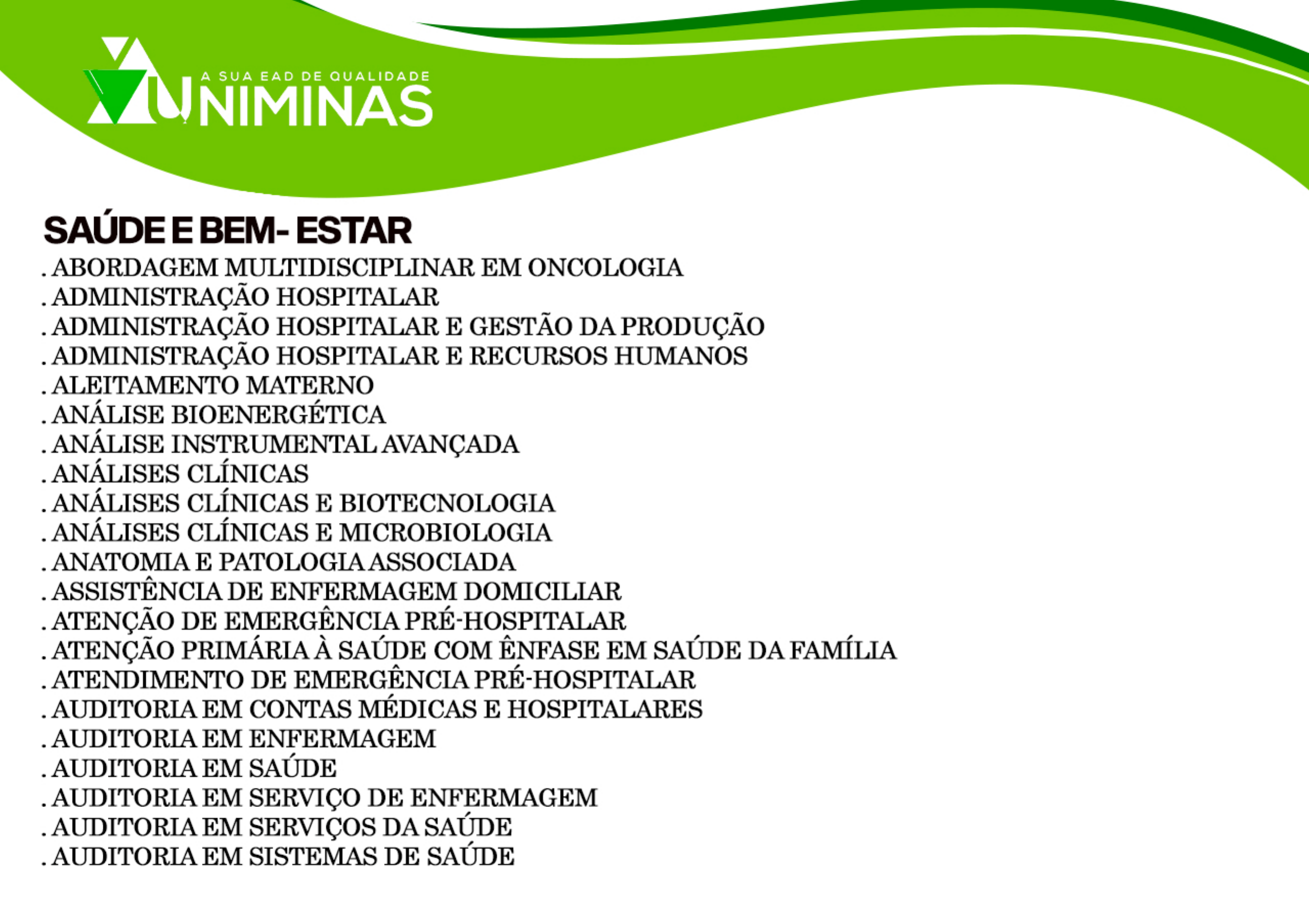 A SUA EAD DE QUALIDADE SAÚDE E BEM- ESTAR ABORDAGEM MULTIDISCIPLINAR EM ONCOLOGIA ADMINISTRAÇÃO HOSPITALAR ADMINISTRAÇÃO HOSPITALAR E GESTÃO DA PRODUÇÃO ADMINISTRAÇÃO HOSPITALAR E RECURSOS HUMANOS ALEITAMENTO MATERNO ANÁLISE BIOENERGÉTICA ANÁLISE INSTRUMENTAL AVANÇADA ANÁLISES CLÍNICAS ANÁLISES CLÍNICAS E BIOTECNOLOGIA ANÁLISES CLÍNICAS E MICROBIOLOGIA ANATOMIA E PATOLOGIA ASSOCIADA ASSISTÊNCIA DE ENFERMAGEM DOMICILIAR ATENÇÃO DE EMERGÊNCIA PRÉ-HOSPITALAR ATENÇÃO PRIMÁRIA À SAÚDE COM EM SAÚDE DA FAMÍLIA ATENDIMENTO DE EMERGÊNCIA PRÉ-HOSPITALAR AUDITORIA EM CONTAS MÉDICAS E HOSPITALARES AUDITORIA EM ENFERMAGEM AUDITORIA EM SAÚDE AUDITORIA EM SERVIÇO DE ENFERMAGEM AUDITORIA EM SERVIÇOS DA SAÚDE AUDITORIA EM SISTEMAS DE SAÚDEA SUA EAD DE QUALIDADE SAÚDEE BEM-ESTAR AUDITORIA HOSPITALAR AUDITORIA NO SETOR DE ENFERMAGEM AUDITORIA, ÉTICA E COMPLIANCE NA SAÚDE AUDITORIA, PLANEJAMENTO E GESTÃO EM SAÚDE AURICULOTERAPIA CHINESA AVALIAÇÃO E REABILITAÇÃO EM MOTRICIDADE OROFACIAL BANCO DE SANGUE E HEMATOLOGIA CLÍNICA BIOFÍSICA BIOMEDICINA EM NEFROLOGIA BIOSSEGURANÇA E BIOTECNOLOGIA APLICADA ÀS CIÊNCIAS DA SAÚDE BIOSSEGURANÇA E SAÚDE PÚBLICA BIOTECNOLOGIA CANNABIS MEDICINAL CAPTAÇÃO, DOAÇÃO E TRANSPLANTE DE ÓRGÃOS E TECIDOS CARDIOLOGIA PARA ENFERMEIROS CITOLOGIA CLÍNICA CITOLOGIA ONCÓTICA CONTROLE DE INFECÇÃO HOSPITALAR CUIDADOS PALIATIVOS DEPÊNDENCIA QUÍMICA DEPENDÊNCIA QUÍMICA E QUALIDADE DE VIDA DEPENDÊNCIA QUÍMICA, TRANSTORNOS COMPULSIVOSA SUA EAD DE QUALIDADE NIMINAS BEM- ESTAR DEPENDÊNCIA TÓXICA DEPENDÊNCIA TOXICA E QUALIDADE DE VIDA DIABETES E COMPLICAÇÕES CRÔNICAS DIAGNÓSTICO POR IMAGEM DIETOTERAPIA CHINESA DISFAGIA DOCÊNCIA DO ENSINO DE GERONTOLOGIA E SAÚDE MENTAL DOCÊNCIA DO ENSINO SUPERIOR COM EM SISTEMA DE SAÚDE DOCÊNCIA DO ENSINO SUPERIOR E ENFERMAGEM DOCÊNCIA DO ENSINO SUPERIOR E HEMATOLOGIA DOCÊNCIA EM CIÊNCIAS DA SAÚDE DOCÊNCIA EM ENFERMAGEM DOENÇAS INFECCIOSAS E PARASITÁRIAS DOENÇAS TROPICAIS DOR E INFLAMAÇÃO EDUCAÇÃO CONTINUADA E PERMANENTE EM ENFERMAGEM EDUCAÇÃO PERMANENTE EM SAÚDE ENFERMAGEM AEROESPACIAL ENFERMAGEM CLÍNICO CIRÚRGICA ENFERMAGEM DERMATOLÓGICA ENFERMAGEM DO TRABALHO ENFERMAGEM DO TRABALHO E GESTÃO EM SEGURANÇA DO TRABALHOA SUA EAD DE QUALIDADE UNIMINAS BEM- ESTAR ENFERMAGEM DO TRABALHO E SAÚDE OCUPACIONAL ENFERMAGEM DO TRABALHO PLANEJAMENTO E GESTÃO ENFERMAGEM E CUIDADO COM IDOSO ENFERMAGEM E SERVIÇOS SOCIAIS ENFERMAGEM EM ANESTESIOLOGIA ENFERMAGEM EM ATENÇÃO PRIMÁRIA À SAÚDE ENFERMAGEM EM CARDIOLOGIA E ENFERMAGEM EM CENTRO ENFERMAGEM EM CENTRO E CENTRAL DE MATERIAL ENFERMAGEM EM CENTRO E CME ENFERMAGEM EM DERMATOLOGIA ENFERMAGEM EM E TRATAMENTO DE FERIDAS ENFERMAGEM EM EMERGÊNCIA PRÉ-HOSPITALAR E DESASTRES ENFERMAGEM EM ENDOSCOPIA ENFERMAGEM EM ESTÉTICA ENFERMAGEM EM ESTOMATERAPIA ENFERMAGEM EM GERIATRIA ENFERMAGEM EM GERIATRIA E GERONTOLOGIA ENFERMAGEM EM GINECOLOGIA E OBSTETRÍCIA ENFERMAGEM EM HEMATOLOGIA, HEMOTERAPIA E TERAPIA DE SUPORTEA SUA EAD DE QUALIDADE SAÚDE E BEM- ESTAR ENFERMAGEM EM HEMOTERAPIA ENFERMAGEM EM HOME CARE ENFERMAGEM EM INFECTOLOGIA ENFERMAGEM EM NEFROLOGIA ENFERMAGEM EM NEUROCIRURGIA ENFERMAGEM EM NEUROLOGIA ENFERMAGEM EM ONCOLOGIA ENFERMAGEM EM ORTOPEDIA E TRAUMATOLOGIA ENFERMAGEM EM PEDIATRIA E NEONATOLOGIA ENFERMAGEM EM PEDIATRIA E SAÚDE MENTAL ENFERMAGEM EM PÓS OPERATÓRIO EM CIRURGIA PLÁSTICA ENFERMAGEM EM PSIQUIATRIA E SAÚDE MENTAL ENFERMAGEM EM RADIOLOGIA E IMAGINOLOGIA ENFERMAGEM EM RECUPERAÇÃO PÓS-ANESTÉSICA ENFERMAGEM EM SAÚDE DA FAMÍLIA ENFERMAGEM EM SAÚDE DO TRABALHADOR ENFERMAGEM EM TERAPIA INTENSIVA ENFERMAGEM EM TERAPIA INTENSIVA PEDIÁTRICA E NEONATAL ENFERMAGEM EM TERAPIAS HOLÍSTICAS E COMPLEMENTARES ENFERMAGEM EM URGÊNCIA E EMERGÊNCIA ENFERMAGEM EM URGÊNCIA E EMERGÊNCIA E GESTÃO NOS SERVIÇOS HOSPITALARES ENFERMAGEM EM URGÊNCIAS E EMERGÊNCIAS EM PEDIATRIA E NEONATOLOGIAA SUA EAD DE QUALIDADE BEM- - ESTAR ENFERMAGEM EM UROLOGIA ENFERMAGEM EM UTI ENFERMAGEM EM UTI ADULTO ENFERMAGEM EM UTI NEONATAL E PEDIÁTRICA ENFERMAGEM FORENSE ENFERMAGEM GERONTOLÓGICA ENFERMAGEM INTENSIVA DE ALTA COMPLEXIDADE ENFERMAGEM NA SAÚDE DO HOMEM ENFERMAGEM OBSTÉTRICA ENFERMAGEM OBSTÉTRICA E GESTÃO ENFERMAGEM ONCOLÓGICA ENFERMAGEM ONCOLÓGICA PEDIÁTRICA ENFERMAGEM PEDIÁTRICA E NEONATAL ENFERMAGEM PERIOPERATÓRIA ENFERMAGEM VOLTADA PARA UTI EPIDEMIOLOGIA EPIDEMIOLOGIA E VIGILÂNCIA EM SAÚDE ERGONOMIA ERGONOMIA INTERDISCIPLINAR ESF- ESTRATÉGIA SAÚDE DA FAMÍLIA ESF PLANEJAMENTO E GESTÃO ESTIMULAÇÃO PRECOCEA SUA EAD DE QUALIDADE NIMINAS BEM- ESTAR ESTUDOS DAAUDIÇÃO ESTUDOS EM DERMATOLOGIA CLÍNICA ESTUDOS EM ENFERMAGEM APLICADA EM UTI NEONATAL ESTUDOS EM ENFERMAGEM E SAÚDE COLETIVA FISIOLOGIA HUMANA APLICADAA CIÊNCIAS DA SAÚDE FISIOLOGIA, NUTRIÇÃO E GESTÃO DO ATENDIMENTO PERSONALIZADO FISIOPATOLOGIA HUMANA FITOTERAPIA FITOTERAPIA E PRESCRIÇÃO DE FITOTERÁPICOS FONOAUDIOLOGIA DO TRABALHO FONOAUDIOLOGIA EDUCACIONAL FONOAUDIOLOGIA EM SAÚDE COLETIVA FONOAUDIOLOGIA HOSPITALAR FUNDAMENTOS EM VOZ GENÉTICA DE MICRO-ORGANISMOS GERENCIAMENTO EM ATENÇÃO BÁSICA DA SAÚDE GERENCIAMENTO EM ENFERMAGEM GERIATRIA E GERONTOLOGIA GERONTOLOGIA GERONTOLOGIA E GESTÃO AO IDOSOYUNIMINAS A SUA EAD DE QUALIDADE SAÚDEE BEM- ESTAR GESTÃO DA ENFERMAGEM GESTÃO DA QUALIDADE EM SAÚDE- ADMINISTRAÇÃO LABORATORIAL GESTÃO DA QUALIDADE HOSPITALAR GESTÃO DE ESF GESTÃO DE PLANOS DE SAÚDE GESTÃO DE RESÍDUOS SÓLIDOS HOSPITALARES GESTÃO DE SAÚDE DA PESSOA IDOSA GESTÃO DE SAÚDE PÚBLICA GESTÃO DE SAÚDE PÚBLICA E PRIVADA GESTÃO DE SEGURANÇA DE TRABALHO EM SERVIÇOS DE SAÚDE GESTÃO DE SERVIÇOS DE ENFERMAGEM GESTÃO E AUDITORIA DE SERVIÇOS DE SAÚDE GESTÃO EM ENFERMAGEM EM UTI GESTÃO EM FONOAUDIOLOGIA EMPRESARIAL GESTÃO EM QUALIDADE EM SERVIÇOS DE SAÚDE E HOSPITALAR GESTÃO EM SAÚDE DO TRABALHADOR GESTÃO EM SAÚDE E ADMINISTRAÇÃO HOSPITALAR GESTÃO EM SAÚDE HOSPITALAR, CLÍNICA E DE POSTOS DE SAÚD