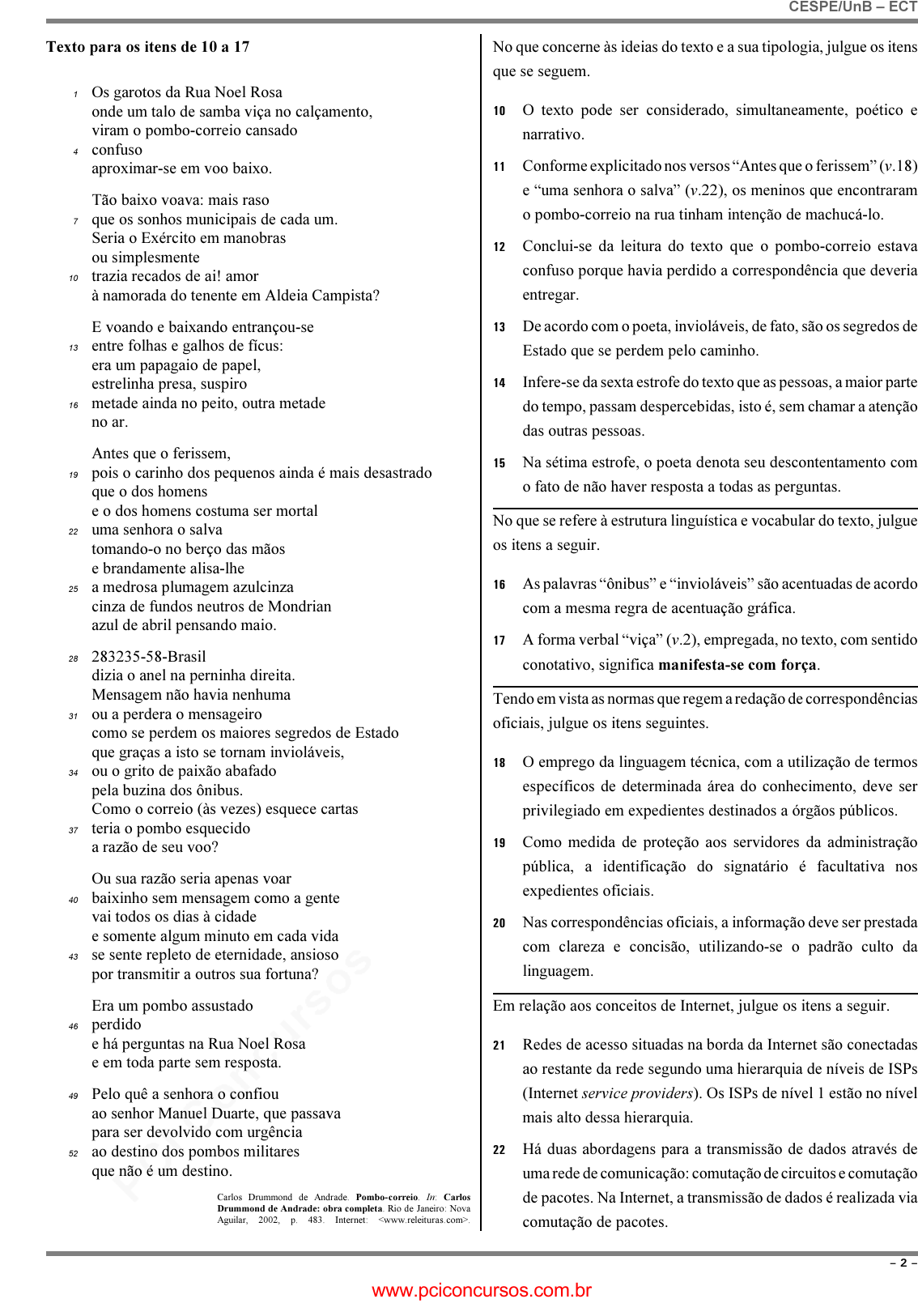 pcimarkpci MDAwMDowMDAwOjAwMDA6MDAwMDowMDAwOmZmZmY6YmZiOTphZTFk:TW9uLCAwMyBGZWIgMjAyNSAyMjo0ODo0MCAtMDMwMA== www.pciconcursos.com.br CESPE/UnB – ECT – 2 – Texto para os itens de 10 a 17 Os garotos da Rua Noel Rosa1 onde um talo de samba viça no calçamento, viram o pombo-correio cansado confuso4 aproximar-se em voo baixo. Tão baixo voava: mais raso que os sonhos municipais de cada um.7 Seria o Exército em manobras ou simplesmente trazia recados de ai! amor10 à namorada do tenente em Aldeia Campista? E voando e baixando entrançou-se entre folhas e galhos de fícus:13 era um papagaio de papel, estrelinha presa, suspiro metade ainda no peito, outra metade16 no ar. Antes que o ferissem, pois o carinho dos pequenos ainda é mais desastrado19 que o dos homens e o dos homens costuma ser mortal uma senhora o salva22 tomando-o no berço das mãos e brandamente alisa-lhe a medrosa plumagem azulcinza25 cinza de fundos neutros de Mondrian azul de abril pensando maio. 283235-58-Brasil28 dizia o anel na perninha direita. Mensagem não havia nenhuma ou a perdera o mensageiro31 como se perdem os maiores segredos de Estado que graças a isto se tornam invioláveis, ou o grito de paixão abafado34 pela buzina dos ônibus. Como o correio (às vezes) esquece cartas teria o pombo esquecido37 a razão de seu voo? Ou sua razão seria apenas voar baixinho sem mensagem como a gente40 vai todos os dias à cidade e somente algum minuto em cada vida se sente repleto de eternidade, ansioso43 por transmitir a outros sua fortuna? Era um pombo assustado perdido46 e há perguntas na Rua Noel Rosa e em toda parte sem resposta. Pelo quê a senhora o confiou49 ao senhor Manuel Duarte, que passava para ser devolvido com urgência ao destino dos pombos militares52 que não é um destino. Carlos Drummond de Andrade. Pombo-correio. In: Carlos Drummond de Andrade: obra completa. Rio de Janeiro: Nova Aguilar, 2002, p. 483. Internet: . No que concerne às ideias do texto e a sua tipologia, julgue os itens que se seguem. 10 O texto pode ser considerado, simultaneamente, poético e narrativo. 11 Conforme explicitado nos versos “Antes que o ferissem” (v.18) e “uma senhora o salva” (v.22), os meninos que encontraram o pombo-correio na rua tinham intenção de machucá-lo. 12 Conclui-se da leitura do texto que o pombo-correio estava confuso porque havia perdido a correspondência que deveria entregar. 13 De acordo com o poeta, invioláveis, de fato, são os segredos de Estado que se perdem pelo caminho. 14 Infere-se da sexta estrofe do texto que as pessoas, a maior parte do tempo, passam despercebidas, isto é, sem chamar a atenção das outras pessoas. 15 Na sétima estrofe, o poeta denota seu descontentamento com o fato de não haver resposta a todas as perguntas. No que se refere à estrutura linguística e vocabular do texto, julgue os itens a seguir. 16 As palavras “ônibus” e “invioláveis” são acentuadas de acordo com a mesma regra de acentuação gráfica. 17 A forma verbal “viça” (v.2), empregada, no texto, com sentido conotativo, significa manifesta-se com força. Tendo em vista as normas que regem a redação de correspondências oficiais, julgue os itens seguintes. 18 O emprego da linguagem técnica, com a utilização de termos específicos de determinada área do conhecimento, deve ser privilegiado em expedientes destinados a órgãos públicos. 19 Como medida de proteção aos servidores da administração pública, a identificação do signatário é facultativa nos expedientes oficiais. 20 Nas correspondências oficiais, a informação deve ser prestada com clareza e concisão, utilizando-se o padrão culto da linguagem. Em relação aos conceitos de Internet, julgue os itens a seguir. 21 Redes de acesso situadas na borda da Internet são conectadas ao restante da rede segundo uma hierarquia de níveis de ISPs (Internet service providers). Os ISPs de nível 1 estão no nível mais alto dessa hierarquia. 22 Há duas abordagens para a transmissão de dados através de uma rede de comunicação: comutação de circuitos e comutação de pacotes. Na Internet, a transmissão de dados é realizada via comutação de pacotes. www.pciconcursos.com.br pcimarkpci MDAwMDowMDAwOjAwMDA6MDAwMDowMDAwOmZmZmY6YmZiOTphZTFk:TW9uLCAwMyBGZWIgMjAyNSAyMjo0ODo0MCAtMDMwMA== www.pciconcursos.com.br CESPE/UnB – ECT – 3 – Julgue os próximos itens, relativos aos modos de utilização de tecnologias, ferramentas, aplicativos e procedimentos associados à Internet. 23 A ferramenta denominada Telnet foi desenvolvida com as características de uma aplicação cliente/servidor. 24 O email, tal como o serviço de correio convencional, é uma forma de comunicação síncrona. 25 O FTP difere de outras aplicações cliente/servidor na Internet por estabelecer duas conexões entre os nós. Uma delas é usada para a transferência de dados, e a outra, para a troca de informações de controle. Julgue os itens seguintes, a respeito de ferramentas e aplicativos disponibilizados na Internet. 26 O protocolo UDP é usado por mecanismos de pesquisa disponibilizados por determinadas empresas da Internet, tal como a empresa Google, para garantir o rápido acesso a um grande volume de dados. 27 A navegação por abas caracteriza-se pela possibilidade de abrir várias páginas na mesma janela do navegador da Internet. 28 No serviço de emails por meio de browsers web, o protocolo HTTP é usado para acessar uma mensagem na caixa postal, e o protocolo SMTP, necessariamente, para enviar uma mensagem para a caixa postal. Em relação ao sistema operacional Windows 7 e ao pacote Microsoft Office 2010, julgue os itens subsequentes. 29 No Word 2010, a partir do menu Layout da Página, é possível dividir em duas partes a janela de um documento que esteja em edição, de modo que seções diferentes do mesmo documento possam ser vistas simultaneamente. 30 No sistema operacional Windows 7, o aplicativo Transferência Fácil do Windows