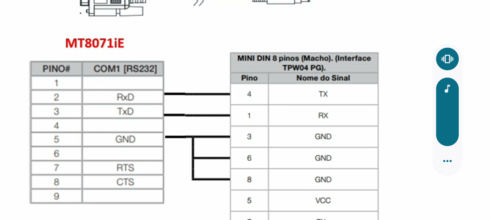 MT8071iE MINI DIN 8 pinos (Macho). (Interface PINO# COM1 [RS232] TPW04 PG). Pino 1 Nome do Sinal J 2 RxD 4 TX 3 TxD 1 RX 4 5 GND 3 GND 6 6 GND ... 7 RTS 8 CTS 8 GND 9 5 VCC -
