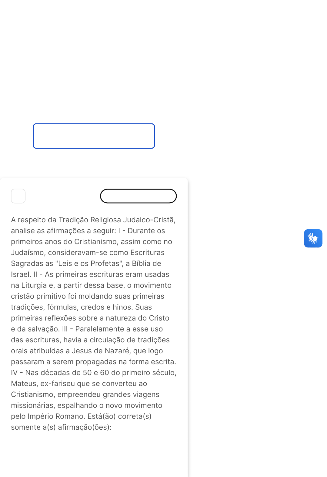 Você acertou 5 de 5 questões Verifique o seu desempenho e continue treinando! Você pode refazer o exercício quantas vezes quiser. Verificar Desempenho 1 Marcar para revisão A respeito da Tradição Religiosa Judaico-Cristã, analise as afirmações a seguir: I � Durante os primeiros anos do Cristianismo, assim como no Judaísmo, consideravam-se como Escrituras Sagradas as "Leis e os Profetas", a Bíblia de Israel. II � As primeiras escrituras eram usadas na Liturgia e, a partir dessa base, o movimento cristão primitivo foi moldando suas primeiras tradições, fórmulas, credos e hinos. Suas primeiras reflexões sobre a natureza do Cristo e da salvação. III � Paralelamente a esse uso das escrituras, havia a circulação de tradições orais atribuídas a Jesus de Nazaré, que logo passaram a serem propagadas na forma escrita. IV � Nas décadas de 50 e 60 do primeiro século, Mateus, ex-fariseu que se converteu ao Cristianismo, empreendeu grandes viagens missionárias, espalhando o novo movimento pelo Império Romano. Está(ão) correta(s) somente a(s) afirmação(ões): A B C D E I, II e IV I, II e III II, III e IV I e III II e III Resposta correta Parabéns, você selecionou a alternativa correta. Confira o gabarito comentado! Gabarito Comentado A afirmação IV está errada, pois nas décadas de 50 e 60 do primeiro século, Paulo, ex-fariseu que se converteu ao Cristianismo, empreendeu grandes viagens missionárias, espalhando o novo movimento pelo Império Romano. Portanto, foi Paulo e não Mateus. 2 Marcar para revisão As obras de Fílon de Alexandria permitem conhecer mais do contexto filosófico e religioso do período em que o Novo Testamento foi escrito. Sobre ele é correto dizer que: I. Foi um pensador, nascido na Alexandria, que mesmo judeu teve excelente educação grega. A B C D E II. Foi influenciado por correntes de pensamento helênicas, como o Platonismo e o Aristotelismo. III. Suas Reflexões abarcaram temas como o Lógos, para o qual era um demiurgo. IV. O estudo sobre sua obra é importante para a pesquisa neotestamentária. Todas estão corretas Estão corretas somente I,II e III Estão corretas somente II, III Estão corretas somente II e IV Estão corretas somente III e IV Resposta correta Parabéns, você selecionou a alternativa correta. Confira o gabarito comentado! Gabarito Comentado Fílon escreveu sobre Teologia e Cosmologia utilizando conceitos gregos e judaicos. É muito conhecido por suas reflexões acerca do Lógos, Sophia e da natureza de Deus. 3 Marcar para revisão A B C O judaísmo do Século I era caracterizado por diversas correntes de pensamento. Os essênios formavam uma seita, auto identificada com o verdadeiro Israel e aquela que prepara os caminhos do Senhor. Eram guiados por um Mestre da Justiça. Eram rígidos quanto á observância da Torá e dos rituais de purificação. Os fariseus queriam a aplicação da Lei em todos os seus detalhes na Sociedade judaica. Das informações uma NÃO condiz com o Judaísmo do século I. Marque: Durante os períodos Herodiano e romano, foram os saduceus que apoiavam a família dominante e seus representantes exerciam o sumo- sacerdócio. Os chefes dos bandos de salteadores que afligiam a zona rural, uniram-se em um único bando e se infiltraram em Jerusalém, dando à origem aos Zelotes.Começaram atacando membros da aristocracia. Os Saduceus aceitavam na totalidade a Sagrada Escritura e valorizavam as tradições orais reconhecendo a importância das mesmas na constituição da fé. Exercicio Conteúdo Sair D E A maioria dos zelotas não eram de Jerusalém, sem casas de família e de amigos tiveram papel significativa na Guerra Judaica que culminou com a Destruição de Jerusalém pelos romanos. Os Zelotas Defendiam a ideia de que os líderes religiosos tinham que ser eleitos democraticamente, e assim o fizeram quando tomaram o controle do templo e da cidade. Resposta correta Parabéns, você selecionou a alternativa correta. Confira o gabarito comentado! Gabarito Comentado Os fariseus queriam a aplicação da Lei em todos os seus detalhes na Sociedade judaica. Durante os períodos Herodiano e romano, foram os saduceus que apoiavam a família dominante e seus representantes exerciam o sumo-sacerdócio. Aceitando somente o Pentateuco como Escritura sagrada, os saduceus rejeitavam as tradições orais. Os chefes dos bandos de salteadores que afligiam a zona rural, uniram-se em um único bando e se infiltraram em Jerusalém, dando à origem aos Zelotes. Começaram atacando membros da aristocracia. Depois, a partir de 67 d.C., promoveram expurgos, atos deliberados que demonstravam a revolta contra a elite herodiana. Devido à relação dos Zelotas com o templo, há a tese de que a liderança do grupo seria de origem sacerdotal, mas isso podia dever-se ao fato d que a maioria dos zelotas não eram de Questão 4 de 5 Corretas �5� Em branco �0� 1 2 3 4 5 A B C Jerusalém, sem casas de família e de amigos. Defendiam a ideia de que os líderes religiosos tinham que ser eleitos democraticamente, e assim o fizeram quando tomaram o controle do templo e da cidade. Esses tiveram papel significativa na Guerra Judaica que culminou com a Destruição de Jerusalém pelos romanos. A alternativa C é a única que não condiz com o Judaísmo do século I, pois os saduceus não aceitavam as tradições orais, mas somente o Pentateuco como Escritura sagrada. 4 Marcar para revisão Acerca das principais facções religiosas que constituíam o judaísmo do século I, assinale a alternativa correta. Os essênios eram uma seita judaica que se retirou para o deserto e acreditava ser a comunidade escatológica. Os Zelotes formavam um grupo revolucionário que se originou da união de ex-guerrilheiros macabeus e que queriam a libertação da dominação romana. Os Saduceus consistiam em um grupo composto pela casta sacerdotal, considerava somente o Pentateuco e as tradições saduceias como escrituras Sagradas.