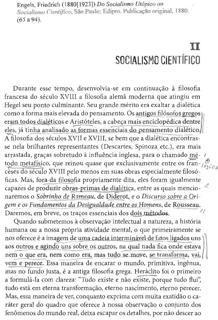 Engels, Friedrich (1880[1923]) Do Socialismo Utópico ao Socialismo São Paulo: Edipro. Publicação original, 1880. (65 a 94). II SOCIALISMO CIENTÍFICO Durante esse tempo, desenvolvia-se em continuação à filosofia francesa do século XVIII a filosofia alemã moderna que atingiu em Hegel seu ponto culminante. Seu grande mérito era exaltar a dialética como a forma mais elevada do pensamento. Os antigos filósofos gregos eram todos dialéticos e Aristóteles, a cabeça mais enciclopédica dentre eles, já tinha analisado as formas essenciais do pensamento dialético. A filosofia dos séculos XVII e XVIII, se bem que a dialética encontras- se nela brilhantes representantes (Descartes, Spinoza etc.), era mais arrastada, graças sobretudo à influência inglesa, para o chamado mé- 1 todo metafísico, que reinou quase que exclusivamente entre os fran- ceses do século XVIII pelo menos em suas obras especialmente filosó- ficas. Mas, fora da filosofia propriamente dita, eles foram igualmente capazes de produzir obras-primas de dialética, entre as quais mencio- naremos o Sobrinho de Rameau, de Diderot, e o Discurso sobre a Ori- gem e os Fundamentos da Desigualdade entre os Homens, de Rousseau. Daremos, em breve, os traços essenciais dos dois métodos. Quando submetemos à observação intelectual a natureza, a história humana ou a nossa própria atividade mental, que primeiramente se nos oferece é a imagem de uma cadeia interminável de fatos ligados uns aos outros e agindo uns sobre os outros, na qual nada fica onde estava nem o que era, nem como era, mas tudo se move, se transforma, vai, vem e perece. Essa maneira de encarar mundo, primitiva, ingênua, mas no fundo justa, é a antiga filosofia grega. Heráclito foi primeiro a formulá-la com clareza: "Tudo existe e não existe, porque tudo flui", tudo está em eterna transformação, eterno nascimento, eterno perecer. Mas, essa maneira de ver, conquanto exprima com muita exatidão ca- ráter geral do quadro que oferece à nossa observação conjunto dos fenômenos do mundo real, deixa escapar os detalhes, por não descer aoLocke a 66 seu estudo especial. Entretanto, enquanto não estivermos em condições de apreender esses detalhes, não teremos uma ideia clara do quadro geral que se desenrola sob nossas Para conhecer esses detalhes, seremos obrigados a destacá-los de sua conexão natural ou histórica e examiná-los um por um, segundo suas qualidades, suas causas e seus efeitos particulares. É esse o problema das ciências naturais e históricas. Essas ciências especiais não podiam, por motivos óbvios, ocupar o pri- meiro lugar entre os gregos dos tempos clássicos, pois, antes de tudo, era necessário preparar a documentação dos fatos. Os primórdios das ciências naturais exatas foram elaborados pelos gregos do período e mais tarde pelos árabes da Idade Mé- dia. A verdadeira ciência natural data da segunda metade do século XV e progrediu, desde então, com crescente rapidez. A decomposição da natureza em suas partes integrantes, a separação dos diferentes fenôme- nos e objetos naturais em categorias distintas, o estudo aprofundado dos corpos orgânicos na variedade de suas formas anatômicas, tais foram as condições essenciais dos progressos gigantescos que os quatro últimos séculos realizaram no conhecimento da natureza. Mas esse método de trabalho nos legou o hábito de estudar os objetos e os fenômenos natu- rais isoladamente, fora das relações recíprocas que os ligam em um gran- de todo, isto é, não em seu movimento, mas em seu repouso, não como essencialmente variáveis, mas como essencialmente constantes, não em sua vida, mas em sua morte. E quando aconteceu, graças a Bacon e a Locke, que esse hábito de trabalho passasse das ciências naturais para a filosofia, produziu-se a estreiteza peculiar aos últimos séculos: o mé- todo metafísico. A dialética se opõe à metafísica Para o metafísico, as coisas e os seus reflexos intelectuais, as noções, são fatos isolados, devendo ser considerados uns após outros, uns sobre 1. Período da história grega durante o qual Alexandria (Egito) tornou-se não só a capital do reino dos Ptolomeus, fundado em 323 a.C., mas a metrópole intelectual e comercial do mundo oriental. 2. Francis Bacon (1561-1626), chanceler da Inglaterra e filósofo, contribuiu grandemente com o seu Novum Organum, para introduzir o método experimental e indutivo. John Locke (1632-1704) combateu as ideias inatas e colocou na experiência dos sentidos a origem de todos os nossos conhecimentos.67 os outros; objetos invariáveis, fixos, imóveis, dados uma vez por todas. Pensa por antíteses desprovidas de todo meio termo; afirma e nega; tudo o que está além é sem valor. Para ele, uma coisa existe ou não existe; uma coisa não pode ser ao mesmo tempo ela própria e outra diferente dela. O negativo e positivo se excluem absolutamente. Causa e efeito estão em direta e recíproca oposição. Essa maneira de ver nos parece, à primeira vista, extremamente plausível, porque é a do senso comum. Este senso comum, companhei- ro muito respeitável enquanto permanece calafetado em seu buraco ca- vado para uso próprio, encontra aventuras bem divertidas quando se embrenha no extenso mundo da ciência. E método metafísico, por mais justificado e necessário que seja em numerosos domínios mais ou menos extensos segundo o objeto da análise, chega, cedo ou tarde, a um limite além do qual se torna parcial, limitado e abstrato, perdendo-se em contradições insolúveis. Na contemplação dos fatos isolados, ele esque- ceu suas relações recíprocas; na de sua existência, esquece seu desenvol vimento e seu parecer; na do repouso, esquece o movimento; à força de ver as árvores, não vê mais a floresta. Podemos dizer com bastante exatidão, pelas necessidades de todos os dias, se um animal existe ou não. Mas uma pesquisa mais profunda nos faz ver que muitas vezes esse problem