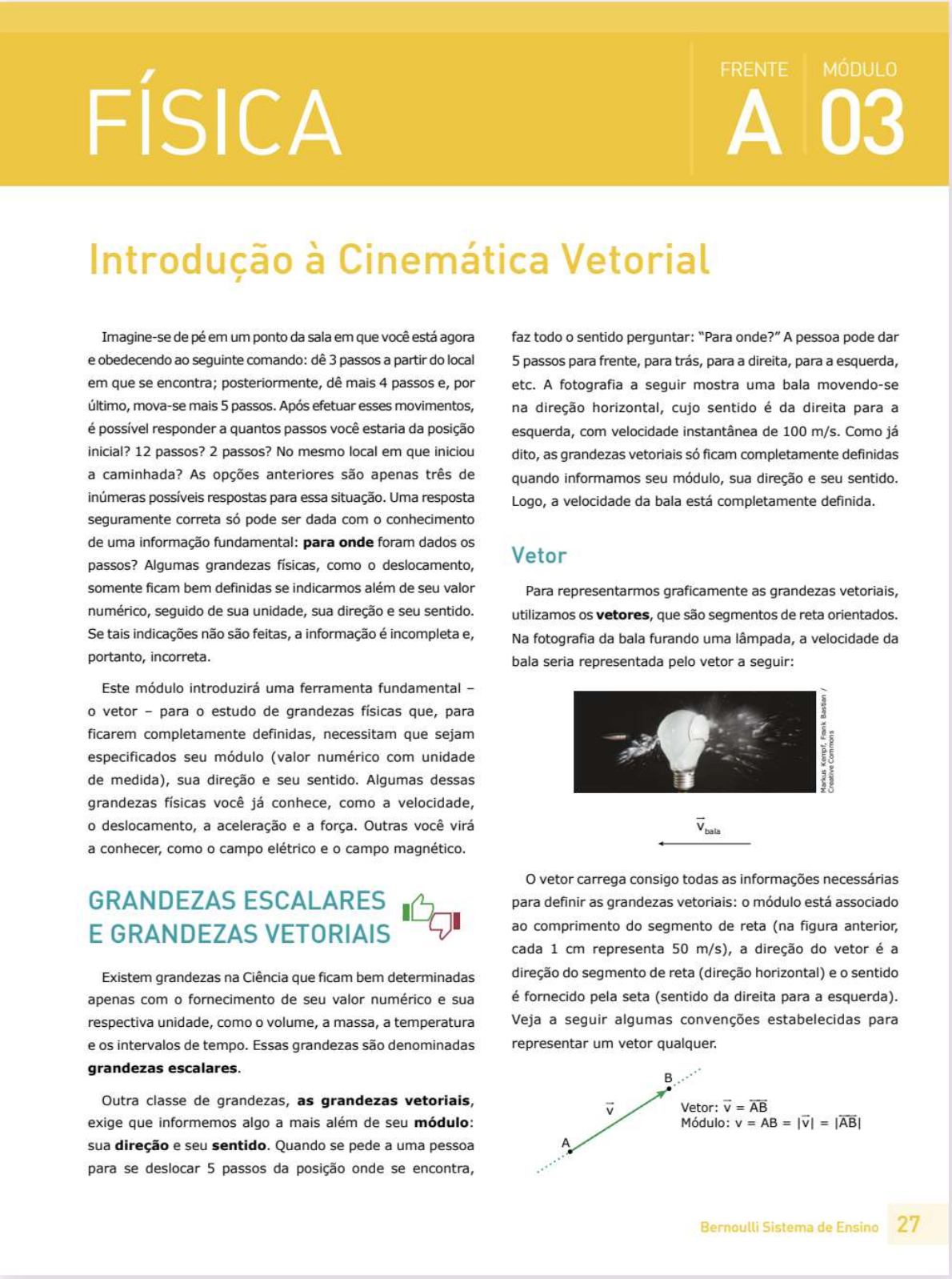 FRENTE MÓDULO FÍSICA A 03 Introdução à Cinemática Vetorial Imagine-se de pé em um ponto da sala em que você está agora faz todo o sentido perguntar: "Para onde?" A pessoa pode dar e obedecendo ao seguinte comando: dê 3 passos a partir do local 5 passos para frente, para trás, para a direita, para a esquerda, em que se encontra; posteriormente, dê mais 4 passos e, por etc. A fotografia a seguir mostra uma bala movendo-se último, mova-se mais 5 passos. Após efetuar esses movimentos, na direção horizontal, cujo sentido é da direita para a é possível responder a quantos passos você estaria da posição esquerda, com velocidade instantânea de 100 m/s. Como já inicial? 12 passos? 2 passos? No mesmo local em que iniciou dito, as grandezas vetoriais só ficam completamente definidas a caminhada? As opções anteriores são apenas três de quando informamos seu módulo, sua direção e seu sentido. inúmeras possíveis respostas para essa situação. Uma resposta Logo, a velocidade da bala está completamente definida. seguramente correta só pode ser dada com o conhecimento de uma informação fundamental: para onde foram dados os Vetor passos? Algumas grandezas físicas, como o deslocamento, somente ficam bem definidas se indicarmos além de seu valor Para representarmos graficamente as grandezas vetoriais, numérico, seguido de sua unidade, sua direção e seu sentido. utilizamos os vetores, que são segmentos de reta orientados. Se tais indicações não são feitas, a informação é incompleta e, Na fotografia da bala furando uma lâmpada, a velocidade da portanto, incorreta. bala seria representada pelo vetor a seguir: Este módulo introduzirá uma ferramenta fundamental o vetor para o estudo de grandezas físicas que, para ficarem completamente definidas, necessitam que sejam especificados seu módulo (valor numérico com unidade de medida), sua direção e seu sentido. Algumas dessas grandezas físicas você já conhece, como a velocidade, o deslocamento, a aceleração e a força. Outras você virá a conhecer, como o campo elétrico e o campo magnético. o vetor carrega consigo todas as informações necessárias GRANDEZAS ESCALARES para definir as grandezas vetoriais: o módulo está associado E GRANDEZAS VETORIAIS ao comprimento do segmento de reta (na figura anterior, cada 1 cm representa 50 m/s), a direção do vetor é a Existem grandezas na Ciência que ficam bem determinadas direção do segmento de reta (direção horizontal) e o sentido apenas com o fornecimento de seu valor numérico e sua é fornecido pela seta (sentido da direita para a esquerda). respectiva unidade, como o volume, a massa, a temperatura Veja a seguir algumas convenções estabelecidas para e os intervalos de tempo. Essas grandezas são denominadas representar um vetor qualquer. grandezas escalares. B Outra classe de grandezas, as grandezas vetoriais, Vetor: AB exige que informemos algo a mais além de seu módulo: Módulo: sua direção e seu sentido. Quando se pede a uma pessoa A para se deslocar 5 passos da posição onde se encontra, Bernoulli Sistema de Ensino 27Frente A Módulo 03 EXERCÍCIO RESOLVIDO Consideremos dois vetores deslocamento, e mostrados na figura a seguir: 01. A figura a seguir representa os vetores velocidade de quatro automóveis em uma esquina. Marcar a(s) alternativa(s) que contém apenas afirmativas corretas. Vejamos, então, os dois processos pelos quais pode ser realizada a soma vetorial dos vetores e 1° método: poligonal Para realizarmos a soma vetorial = + pelo método da poligonal, devemos desenhar a origem do vetor na extremidade do vetor o vetor soma dos deslocamentos e é o segmento de reta cuja origem é a origem de e cuja extremidade é a extremidade de como representado na figura a seguir. Ao mover os vetores e não podemos alterar seus módulos, suas direções, nem seus sentidos. A) e têm mesma direção. B) e têm mesma direção. C) e têm mesma direção e sentidos opostos. D) e têm mesmo sentido. Para determinarmos o módulo de d, devemos utilizar uma E) e têm direção e sentidos opostos. escala anteriormente fornecida para os módulos dos vetores F) têm módulos diferentes. e ou aplicar a Lei dos Cossenos. o vetor é denominado vetor resultante ou vetor soma. Posteriormente, serão dados G) e são iguais. alguns exemplos numéricos. Resolução: Esse método de soma vetorial nos permite somar mais Dois ou mais vetores possuem a mesma direção quando são de dois vetores ao mesmo tempo. Se tivéssemos quatro paralelos. Logo, apenas os vetores velocidade dos carros B, vetores, como os representados na figura seguinte, para C e D possuem a mesma direção. Para que dois ou mais realizarmos a soma vetorial R = a + b + bastaria vetores tenham mesmo sentido, esses devem estar na procedermos de forma análoga, isso é, sempre desenhar a mesma direção e devem estar orientados para o mesmo origem do vetor seguinte na extremidade do vetor anterior, lado. Assim, temos que apenas os vetores e possuem tomando o cuidado de não alterar os módulos, as direções e o mesmo sentido. Sabemos, também, que dois vetores os sentidos dos vetores. o vetor resultante dessa operação possuem módulos diferentes quando os segmentos de reta seria um vetor, cuja origem seria a origem de a e cuja que os representam possuem comprimentos diferentes. extremidade seria a extremidade de d, conforme a figura Como os vetores ev, possuem o mesmo comprimento, a seguir: as velocidades de e possuem também o mesmo módulo. Já o vetor possui módulo menor que os demais. b Dois vetores são iguais quando possuem mesmo módulo, direção e sentido. Tendo em vista os comentários anteriores, temos que as afirmativas corretas são A e B. Adição vetorial 2° método: paralelogramo A soma vetorial di = + realizada pelo método Assim como as grandezas escalares, as grandezas vetoriais do paralelogramo é feita desenhando os vetores e também estão submetidas a regras de op