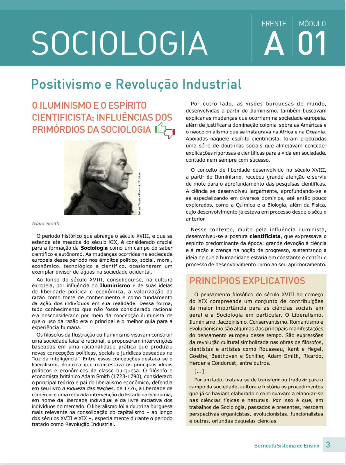 FRENTE MÓDULO SOCIOLOGIA A 01 Positivismo e Revolução Industrial 0 ILUMINISMO E 0 ESPÍRITO Por outro lado, as visões burguesas de mundo, desenvolvidas a partir do Iluminismo, também buscavam CIENTIFICISTA: INFLUÊNCIAS DOS explicar as mudanças que ocorriam na sociedade europeia, PRIMÓRDIOS DA SOCIOLOGIA além de justificar a dominação colonial sobre as Américas e neocolonialismo que se instaurava na África e na Oceania. Apoiadas naquele espírito cientificista, foram produzidas uma série de doutrinas sociais que almejavam conceder explicações rigorosas e científicas para a vida em sociedade, contudo nem sempre com sucesso. o conceito de liberdade desenvolvido no século XVIII, a partir do Iluminismo, recebeu grande atenção e serviu de mote para o aprofundamento das pesquisas científicas. A ciência se desenvolveu largamente, aprofundando-se e se especializando em diversos domínios, até então pouco explorados, como a Química e a Biologia, além da Física, cujo desenvolvimento já estava em processo desde o século anterior. Adam Smith. Nesse contexto, muito pela influência iluminista, o período histórico que abrange o século XVIII, e que se desenvolveu-se a postura cientificista, que expressava o estende até meados do século XIX, é considerado crucial espírito predominante da época: grande devoção à ciência para a formação da Sociologia como um campo do saber e à razão e crença na noção de progresso, sustentando a científico e autônomo. As mudanças ocorridas na sociedade europeia desse período nos âmbitos político, social, moral, ideia de que a humanidade estaria em constante e contínuo econômico, tecnológico e ocasionaram um processo de desenvolvimento rumo ao seu aprimoramento. exemplar divisor de águas na sociedade ocidental. Ao longo do século XVIII, consolidou-se, na cultura PRINCÍPIOS EXPLICATIVOS europeia, por influência do Iluminismo e de suas ideias de liberdade política e econômica, a valorização da o pensamento filosófico do século XVIII ao começo razão como fonte de conhecimento e como fundamento da ação dos indivíduos em sua realidade. Dessa forma, do XIX compreende um conjunto de contribuições todo conhecimento que não fosse considerado racional da maior importância para as ciências sociais em era desconsiderado por meio da concepção iluminista de geral e a Sociologia em particular. o Liberalismo, que o uso da razão era o principal e o melhor guia para a Iluminismo, Jacobinismo, Conservantismo, Romantismo e experiência humana. Evolucionismo são algumas das principais manifestações Os filósofos da Ilustração ou Iluminismo visavam construir do pensamento europeu desse tempo. São expressões uma sociedade laica e racional, e propuseram intervenções da revolução cultural simbolizada nas obras de filósofos, baseadas em uma racionalidade prática que produziu cientistas e artistas como Rousseau, Kant e Hegel, novas concepções políticas, sociais e jurídicas baseadas na Goethe, Beethoven e Schiller, Adam Smith, Ricardo, "luz da inteligência". Entre essas concepções destaca-se o liberalismo, doutrina que manifestava os principais ideais Herder e Condorcet, entre outros. políticos e econômicos da classe burguesa. o filósofo e [...] economista britânico Adam Smith (1723-1790), considerado Por um lado, tratava-se de transferir ou traduzir para o o principal teórico e pai do liberalismo econômico, defendia em seu livro A Riqueza das Nações, de 1776, a liberdade de campo da sociedade, cultura e história os procedimentos comércio e uma reduzida intervenção do Estado na economia, que já se haviam elaborado e continuavam a elaborar-se em nome da liberdade individual e da livre iniciativa dos nas ciências físicas e naturais. Por isso é que, em indivíduos no mercado. o liberalismo foi a doutrina burguesa trabalhos de Sociologia, passados e presentes, ressoam mais relevante na consolidação do capitalismo ao longo perspectivas organicistas, evolucionistas, funcionalistas dos séculos XVIII e XIX especialmente durante o período e outras, oriundas daquelas ciências. tratado como Revolução Industrial. Bernoulli Sistema de Ensino 3Frente A Módulo 01 As novas tecnologias da Primeira e da Segunda Revolução [...] Industrial modificaram por completo a estrutura da Por outro lado, tratava-se de criar novos procedimentos de sociedade europeia ao desestruturar as bases econômicas reflexão, de modo a fazer face às originalidades dos fatos, do feudalismo. A produção de bens e riquezas passa a ser acontecimentos e dilemas que caracterizam a vida social no Mundo majoritariamente industrial por meio da mecanização do Moderno. A emergência da sociedade civil, trabalho. As máquinas a vapor, à combustão ou elétricas burguesa ou capitalista, passava a desafiar o pensamento em substituem aos poucos o esforço humano, tanto no trabalho uma forma nova, pouco comum. [...] o pensamento se torna agrícola quanto nas atividades laborais urbanas. o modo de capaz de dar conta da originalidade dos fatos, acontecimentos e produção capitalista se consolida de forma definitiva, tendo, dilemas mais característicos das sociedades que se formam com no liberalismo, uma doutrina política da visão de Mundo Moderno. mundo dos detentores do capital. [...] o que devemos, de fato, considerar, para além das Estes são alguns momentos lógicos bastante frequentes na dicotomias entre os benefícios e malefícios advindos reflexão sociológica: dado e significado, quantidade e qualidade, da Revolução Industrial, tomando por base os aspectos parte e todo, aparência e essência, singular e universal, causa econômicos, é justamente analisar e como as e sentido, negatividade e contradição, sincrônico e diacrônico. mudanças na base econômica da sociedade feudal trouxeram Devido ao seu contínuo diálogo com a Filosofia, a Sociologia guarda alterações para modo como os indivíduos estabelecem sua