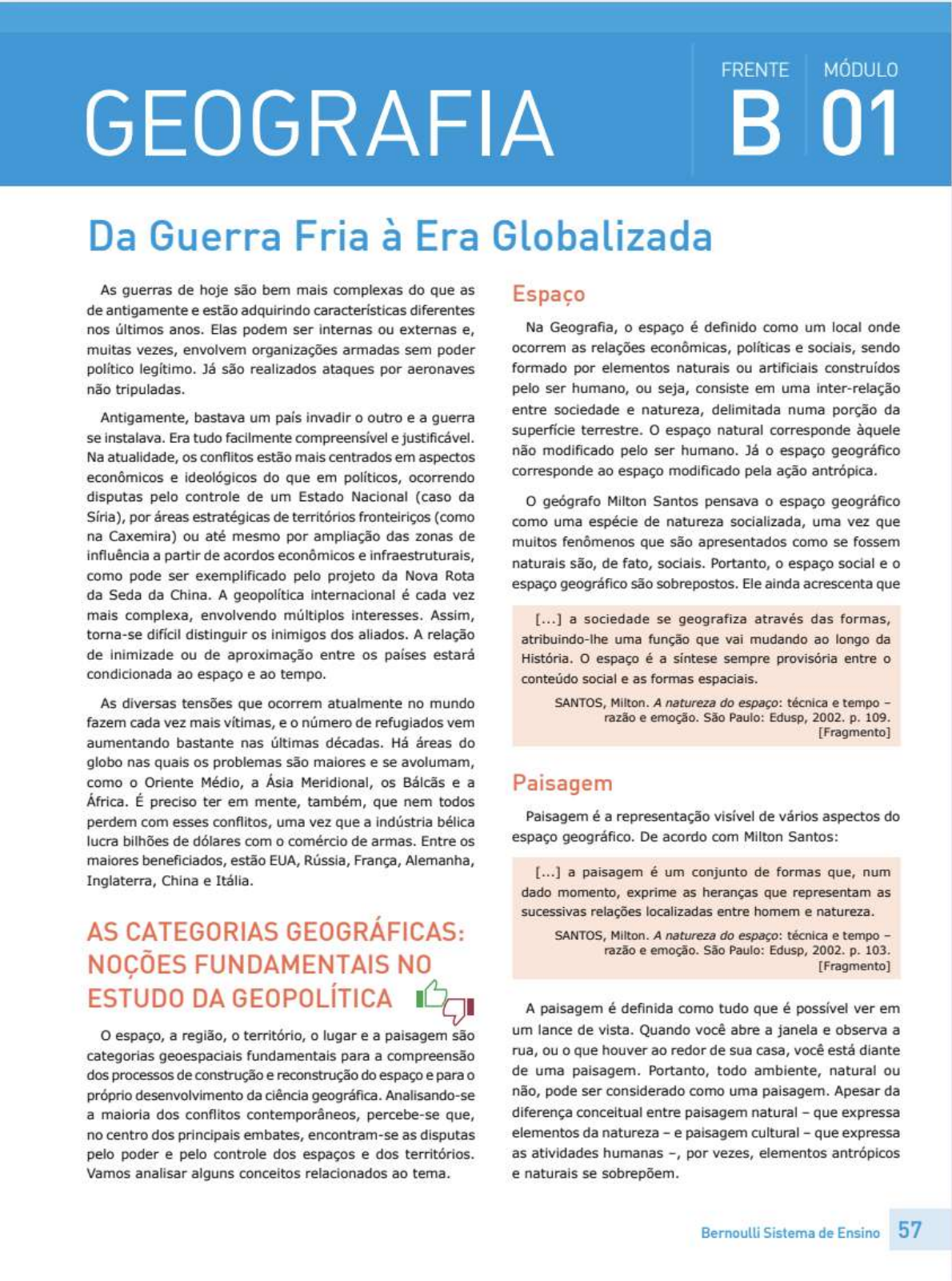 FRENTE MÓDULO GEOGRAFIA 01 Da Guerra Fria à Era Globalizada As guerras de hoje são bem mais complexas do que as Espaço de antigamente e estão adquirindo diferentes nos últimos anos. Elas podem ser internas ou externas e, Na Geografia, o espaço é definido como um local onde muitas vezes, envolvem organizações armadas sem poder ocorrem as relações econômicas, políticas e sociais, sendo político legítimo. Já são realizados ataques por aeronaves formado por elementos naturais ou artificiais construídos não tripuladas. pelo ser humano, ou seja, consiste em uma inter-relação entre sociedade e natureza, delimitada numa porção da Antigamente, bastava um país invadir o outro e a guerra superfície terrestre. o espaço natural corresponde àquele se Era tudo facilmente compreensível e justificável. Na atualidade, os conflitos estão mais centrados em aspectos não modificado pelo ser humano. Já o espaço geográfico econômicos e ideológicos do que em políticos, ocorrendo corresponde ao espaço modificado pela ação antrópica. disputas pelo controle de um Estado Nacional (caso da o geógrafo Milton Santos pensava o espaço geográfico Síria), por áreas estratégicas de territórios fronteiriços (como como uma espécie de natureza socializada, uma vez que na Caxemira) ou até mesmo por ampliação das zonas de muitos fenômenos que são apresentados como se fossem influência a partir de acordos econômicos e infraestruturais, naturais são, de fato, sociais. Portanto, o espaço social e o como pode ser exemplificado pelo projeto da Nova Rota espaço geográfico são sobrepostos. Ele ainda acrescenta que da Seda da China. A geopolítica internacional é cada vez mais complexa, envolvendo múltiplos Assim, [...] a sociedade se geografiza através das formas, torna-se difícil distinguir os inimigos dos aliados. A relação atribuindo-lhe uma função que vai mudando ao longo da de inimizade ou de aproximação entre os países estará o espaço é a sintese sempre provisória entre o condicionada ao espaço e ao tempo. conteúdo social e as formas espaciais. As diversas tensões que ocorrem atualmente no mundo SANTOS, A natureza do espaço: técnica e tempo fazem cada vez mais vítimas, e o número de refugiados vem razão e emoção. São Paulo: Edusp, 2002. p. 109. [Fragmento] aumentando bastante nas últimas décadas. Há áreas do globo nas quais os problemas são maiores e se avolumam, como o Oriente Médio, a Ásia Meridional, os e a Paisagem África. É preciso ter em mente, também, que nem todos perdem com esses conflitos, uma vez que a indústria bélica Paisagem é a representação visível de vários aspectos do lucra bilhões de dólares com o comércio de armas. Entre os espaço geográfico. De acordo com Milton Santos: maiores beneficiados, estão EUA, Rússia, França, Alemanha, [...] a paisagem é um conjunto de formas que, num Inglaterra, China e dado momento, exprime as heranças que representam as sucessivas relações localizadas entre homem e AS CATEGORIAS GEOGRÁFICAS: SANTOS, A natureza do espaço: técnica e tempo razão e emoção. São Paulo: Edusp, 2002. p. 103. NOÇÕES FUNDAMENTAIS NO [Fragmento] ESTUDO DA GEOPOLÍTICA A paisagem é definida como tudo que é possível ver em o espaço, a região, o território, o lugar e a paisagem são um lance de vista. Quando você abre a janela e observa a categorias geoespaciais fundamentais para a compreensão rua, ou o que houver ao redor de sua casa, você está diante dos processos de construção e reconstrução do espaço e para o de uma paisagem. Portanto, todo ambiente, natural ou próprio desenvolvimento da ciência geográfica. Analisando-se não, pode ser considerado como uma paisagem. Apesar da a maioria dos conflitos percebe-se que, diferença conceitual entre paisagem natural que expressa no centro dos principais embates, encontram-se as disputas elementos da natureza e paisagem cultural que expressa pelo poder e pelo controle dos espaços e dos territórios. as atividades humanas por vezes, elementos antrópicos Vamos analisar alguns conceitos relacionados ao e naturais se Bernoulli Sistema de Ensino 57Frente B Módulo 01 Território A compreensão do conceito de território é fundamental, pois ele está ligado a poder, dominação e conquista. Um território pode ser definido como uma área onde há relações de poder, de posse ou de domínio, onde vigoram determinadas regras ou leis. É um espaço dominado e apropriado por uma sociedade, uma organização ou um grupo. Do ponto de vista legal, o território está subordinado aos princípios de soberania de determinado Estado ou mesmo de propriedade de alguma pessoa física ou jurídica. Entretanto, dentro do território de um município, por exemplo, pode-se perceber a existência de diversos espaços cujo controle estatal é relativo. o território, nessa perspectiva, vai além da delimitação As áreas dominadas pelo narcotráfico são um exemplo de CARÓN, Hipólito. Paisagem de Sabará, Minas Gerais. 1891. território não legitimado ou não demarcado legalmente sobre tela. Museu Nacional de Belas Artes. que se mantém sob domínio de um poder paralelo não governamental. Lugar Dentro da categoria território, tem-se outras subcategorias geográficas: nação, Estado e Estado-nação. Lugar é o espaço de vivência afetiva. Ele é constituído de locais familiares, que fazem parte da vida. É base da reprodução social e pode ser analisado pela triade habitante- Nação -identidade-lugar. Os lugares incorporam as representações Uma nação pode referir-se a uma comunidade de pessoas simbólicas construídas na materialidade. A ligação do ser que compartilham linguagem, cultura, etnia, descendência humano com os lugares ao longo da História permitiu a ou história. Nessa definição, uma nação não tem, criação de artefatos técnicos e culturais que atribuem fronteiras No entanto, também identidade a esses luga