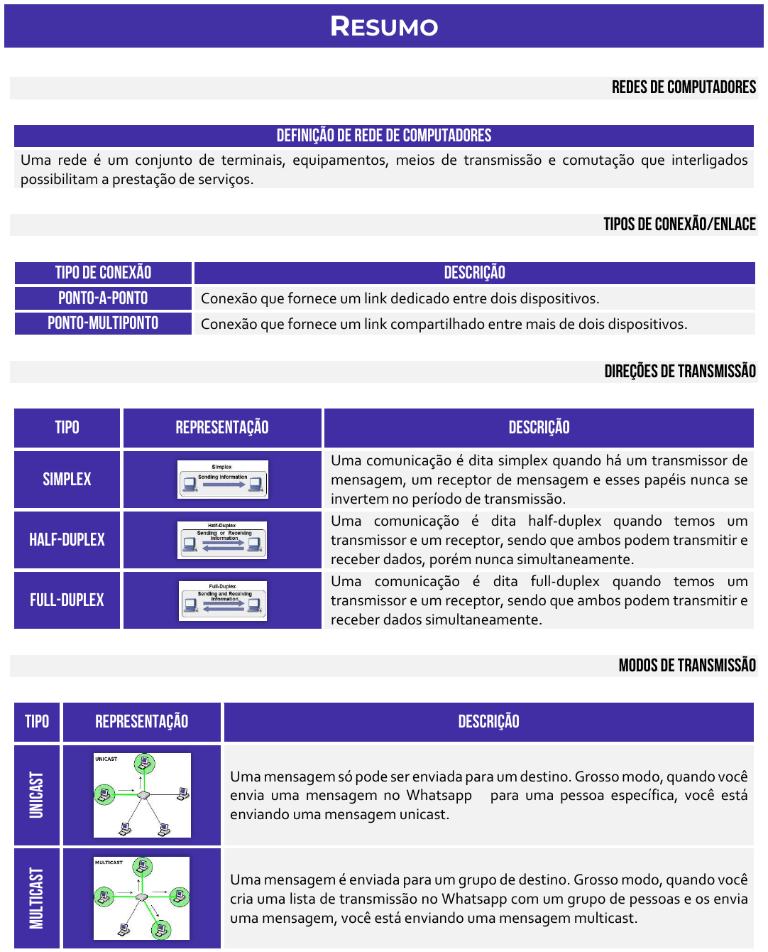 RESUMO REDES DE COMPUTADORES DEFINIÇÃO de rede de computadores Uma rede é um conjunto de terminais, equipamentos, meios de transmissão e comutação que interligados possibilitam a prestação de serviços. TIPOS DE CONEXÃO/ENLACE TIPO DE CONEXÃO DESCRIÇÃO PONTO-A-PONTO Conexão que fornece um link dedicado entre dois dispositivos. PONTO-MULTIPONTO Conexão que fornece um link compartilhado entre mais de dois dispositivos. DIREÇÕES DE TRANSMISSÃO TIPO REPRESENTAÇÃO DESCRIÇÃO SIMPLEX Uma comunicação é dita simplex quando há um transmissor de mensagem, um receptor de mensagem e esses papéis nunca se invertem no período de transmissão. HALF-DUPLEX Uma comunicação é dita half-duplex quando temos um transmissor e um receptor, sendo que ambos podem transmitir e receber dados, porém nunca simultaneamente. FULL-DUPLEX Uma comunicação é dita full-duplex quando temos um transmissor e um receptor, sendo que ambos podem transmitir e receber dados simultaneamente. MODOS DE TRANSMISSÃO TIPO REPRESENTAÇÃO DESCRIÇÃO UN IC AS T Uma mensagem só pode ser enviada para um destino. Grosso modo, quando você envia uma mensagem no Whatsapp para uma pessoa específica, você está enviando uma mensagem unicast. M UL TI CA ST Uma mensagem é enviada para um grupo de destino. Grosso modo, quando você cria uma lista de transmissão no Whatsapp com um grupo de pessoas e os envia uma mensagem, você está enviando uma mensagem multicast. 05181573347 - ANTONIO PEREIRA CABRAL BR OA DC AS T Uma mensagem é enviada para todos os destinos. Grosso modo, quando você cria uma lista de transmissão no Whatsapp com todos os seus contatos e os envia uma mensagem, você está enviando uma mensagem broadcast. CLASSIFICAÇÃO DE REDES: QUANTO À DIMENSÃO TIPO SIGLA DESCRIÇÃO DISTÂNCIA PERSONAL AREA NETWORK PAN Rede de computadores pessoal (celular, tablet, notebook, entre outros). De alguns centímetros a alguns poucos metros. LOCAL AREA NETWORK LAN Rede de computadores de lares, escritórios, prédios, entre outros. De algumas centenas de metros a alguns quilômetros. METROPOLITAN AREA NETWORK MAN Rede de computadores entre uma matriz e filiais em uma cidade. Cerca de algumas dezenas de quilômetros. WIDE AREA NETWORK WAN Rede de computadores entre cidades, países ou até continentes. De algumas dezenas a milhares de quilômetros. CLASSIFICAÇÃO DE REDES: QUANTO À ARQUITETURA TIPO de rede DESCRIÇÃO PONTO A PONTO Também chamada de Rede Par-a-Par, é o modelo de rede mais simples de ser montado. Nesse modelo, todas as máquinas podem compartilhar dados e periféricos umas com as outras. Essas redes são comuns em residências e entre filiais de empresas, porque demandam um baixo custo, são facilmente configuráveis e possibilitam altas taxas de velocidade de conexão. CLIENTE/ SERVIDOR É um modelo de redes mais complexo, porém mais robusto e confiável. Nesse modelo, existe uma máquina especializada, dedicada e geralmente remota, respondendo rapidamente aos pedidos vindos dos demais computadores da rede – o que aumenta bastante o desempenho de algumas tarefas. É a escolha natural para redes grandes, como a Internet – que funciona tipicamente a partir do Modelo Cliente/Servidor. MEIOS DE TRANSMISSÃO TIPO DE MEIO DESCRIÇÃO GUIADO Trata-se da transmissão por cabos ou fios de cobre, onde os dados transmitidos são convertidos em sinais elétricos que propagam pelo material condutor. Exemplo: cabos coaxiais, cabos de par traçado, fibra óptica, entre outros. NÃO-GUIADO Trata-se da transmissão por irradiação eletromagnética, onde os dados transmitidos são irradiados através de antenas para o ambiente. Exemplo: ondas de rádio, microondas, infravermelho, bluetooth e wireless. 05181573347 - ANTONIO PEREIRA CABRAL TIPO REPRESENTAÇÃO DESCRIÇÃO CABO COAXIAL Consiste em um fio central de cobre, envolvido por uma blindagem metálica. Isolantes de plástico flexível separam os condutores internos e externos e outras camadas do revestimento que cobrem a malha externa. Esse meio de transmissão é mais barato, relativamente flexível e muito resistente à interferência eletromagnéticas graças à malha de proteção que possui. Esse cabo cobre distâncias maiores que o cabo de par trançado e utiliza um conector chamado BNC. CABO DE PAR TRANÇADO Consiste de quatro pares de fios trançados blindados ou não, e envolto de um revestimento externo flexível. Eles são trançados para diminuir a interferência eletromagnética externa e interna – quanto mais giros, maior a atenuação. Este é o cabo mais utilizado atualmente por ser o mais barato de todos e ser bastante flexível. Esse cabo cobre distâncias menores que o cabo coaxial e utiliza um conector chamado RJ-45 (Memorizem!). CABO DE FIBRA ÓPTICA Consiste em uma Casca e um Núcleo (de vidro) para transmissão de luz. Possui capacidade de transmissão virtualmente infinita, é imune a interferências eletromagnéticas e consegue ligar distâncias maiores sem a necessidade de repetidores. Como desvantagens, podemos dizer que é incapaz de fazer curvas acentuadas, além de ter um custo de instalação e manutenção muito alto em relação ao par trançado. Há dois tipos de fibra: Monomodo e Multimodo. Equipamentos de redes PLACA DE REDE HUB (CONCENTRADOR) BRIDGE (PONTE) 05181573347 - ANTONIO PEREIRA CABRAL Equipamento de rede de comunicação bidirecional (entrada e saída de dados) conectado à placa- mãe do computador. Toda placa de rede possui um número identificador chamado Endereço MAC (48 Bits). Dispositivo de rede capaz de aumentar o alcance de uma rede local por meio da regeneração de sinais. É capaz de trabalhar apenas com broadcast, isto é, ao receber um pacote de dados, distribui para todas as máquinas da rede. Equipamento capaz de separar uma rede em segmentos menores, reduzindo as chances de colisões quando várias máquinas desejam transmitir dados ao mesmo tempo. São dispositivos capazes de e