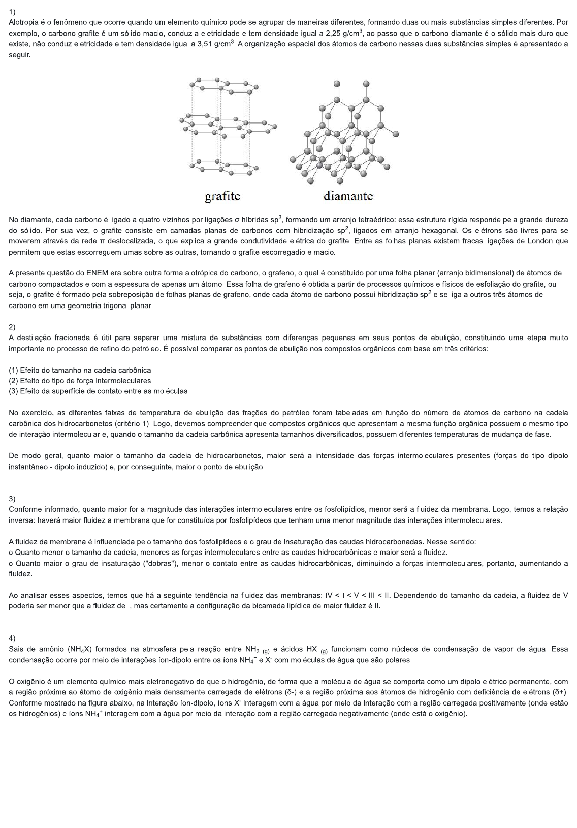 1) Alotropia é o fenômeno que ocorre quando um elemento químico pode se agrupar de maneiras diferentes, formando duas ou mais substâncias simples diferentes. Por exemplo, o carbono grafite é um sólido macio, conduz a eletricidade e tem densidade igual a 2,25 ao passo que o carbono diamante é o sólido mais duro que existe, não conduz eletricidade e tem densidade igual a 3,51 A organização espacial dos átomos de carbono nessas duas substâncias simples é apresentado a seguir. grafite diamante No diamante, cada carbono é ligado a quatro vizinhos por ligações o híbridas formando um arranjo tetraédrico: essa estrutura rígida responde pela grande dureza do sólido. Por sua vez, o grafite consiste em camadas planas de carbonos com ligados em arranjo hexagonal. Os elétrons são livres para se moverem através da rede TT deslocalizada, o que explica a grande condutividade elétrica do grafite. Entre as folhas planas existem fracas ligações de London que permitem que estas escorreguem umas sobre as outras, tornando o grafite escorregadio e macio. A presente questão do ENEM era sobre outra forma alotrópica do carbono, o grafeno, o qual é constituído por uma folha planar (arranjo bidimensional) de átomos de carbono compactados e com a espessura de apenas um átomo. Essa folha de grafeno é obtida a partir de processos químicos e físicos de esfoliação do grafite, ou seja, o grafite é formado pela sobreposição de folhas planas de grafeno, onde cada átomo de carbono possui sp2 e se liga a outros três átomos de carbono em uma geometria trigonal planar. 2) A destilação fracionada é útil para separar uma mistura de substâncias com diferenças pequenas em seus pontos de ebulição, constituindo uma etapa muito importante no processo de refino do petróleo. É possível comparar os pontos de ebulição nos compostos orgânicos com base em três critérios: (1) Efeito do tamanho na cadeia carbônica (2) Efeito do tipo de força intermoleculares (3) Efeito da superfície de contato entre as moléculas No exercício, as diferentes faixas de temperatura de ebulição das frações do petróleo foram tabeladas em função do número de átomos de carbono na cadeia carbônica dos hidrocarbonetos (critério 1). Logo, devemos compreender que compostos orgânicos que apresentam a mesma função orgânica possuem o mesmo tipo de interação intermolecular e, quando o tamanho da cadeia carbônica apresenta tamanhos diversificados, possuem diferentes temperaturas de mudança de fase. De modo geral, quanto maior o tamanho da cadeia de hidrocarbonetos, maior será a intensidade das forças intermoleculares presentes (forças do tipo dipolo instantâneo dipolo induzido) e, por conseguinte, maior o ponto de ebulição. 3) Conforme informado, quanto maior for a magnitude das interações intermoleculares entre os fosfolipídios, menor será a fluidez da Logo, temos a relação inversa: haverá maior fluidez a membrana que for constituída por fosfolipídeos que tenham uma menor magnitude das interações intermoleculares. A fluidez da membrana é influenciada pelo tamanho dos fosfolipídeos e o grau de insaturação das caudas hidrocarbonadas. Nesse sentido: o Quanto menor o tamanho da cadeia, menores as forças intermoleculares entre as caudas hidrocarbônicas e maior será a fluidez. o Quanto maior o grau de insaturação ("dobras"), menor o contato entre as caudas hidrocarbônicas, diminuindo a forças intermoleculares, portanto, aumentando a fluidez. Ao analisar esses aspectos, temos que há a seguinte tendência na fluidez das membranas: Dependendo do tamanho da cadeia, a fluidez de V poderia ser menor que a fluidez de I, mas certamente a configuração da bicamada lipídica de maior fluidez é II. 4) Sais de amônio (NH4X) formados na atmosfera pela reação entre NH3 (g) e ácidos HX (g) funcionam como núcleos de condensação de vapor de água. Essa condensação ocorre por meio de interações entre os íons NH4+ e X com moléculas de água que são polares. oxigênio é um elemento químico mais eletronegativo do que o hidrogênio, de forma que a molécula de água se comporta como um dipolo elétrico permanente, com a região próxima ao átomo de oxigênio mais densamente carregada de elétrons e a região próxima aos átomos de hidrogênio com deficiência de elétrons Conforme mostrado na figura abaixo, na interação X interagem com a água por meio da interação com a região carregada positivamente (onde estão os hidrogênios) e íons NH4+ interagem com a água por meio da interação com a região carregada negativamente (onde está o oxigênio).NH4 8 5) Em condições ambientes, apenas gases nobres são formados por átomos isolados uns dos outros (os átomos são muito estáveis e pouco reativos). Os átomos dos demais elementos químicos, ao contrário, podem se atrain não só mutuamente como também átomos de outros elementos, formando agregados suficientemente estáveis, que constituem as substâncias compostas. Associando a observação de que os átomos dos gases nobres têm pouca tendência a se unirem entre si ou com outros átomos com a de que os átomos dos gases nobres têm o número máximo de elétrons na última camada, os cientistas Gilbert N. Lewis e Walter Kossel lançaram a regra do Os átomos, ao se unirem, procuram perder, ganhar ou compartilhar elétrons na última camada até ficarem com oito elétrons na última camada (configuração eletrônica de um gás nobre). Para o hidrogênio, a configuração estável é a do hélio. A regra do octeto, porém, apresenta exceções. Em 1962 um químico conseguiu combinar, de forma transitória, o xenônio com o átomo de flúor. Pela primeira vez foi possível combinar algum elemento com um gás nobre. Para a estabilidade do gás nobre, foi realizada a sua reação com o flúor. A reatividade desse elemento está relacionada à busca por elétrons para que o elemento complete seu octeto. elemen